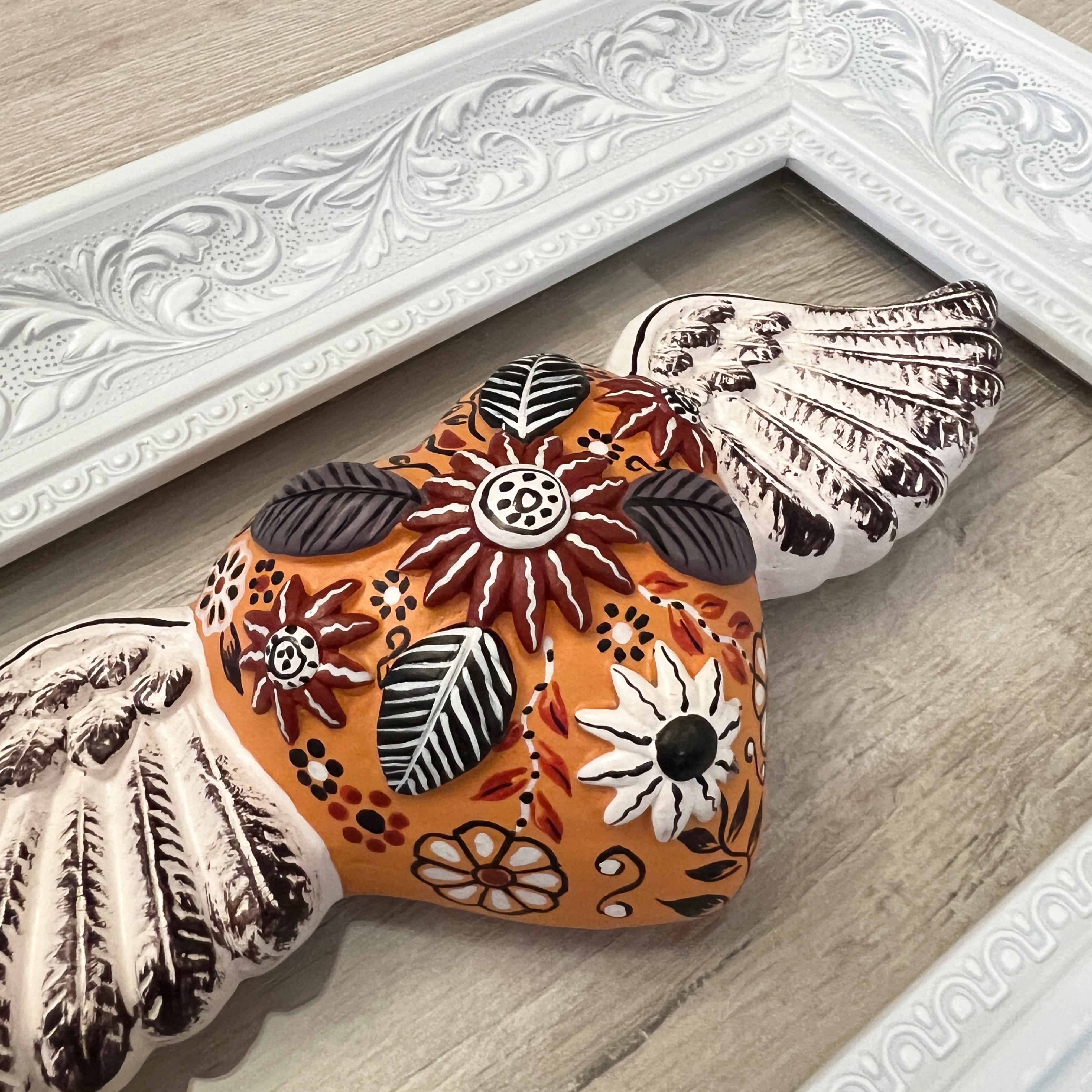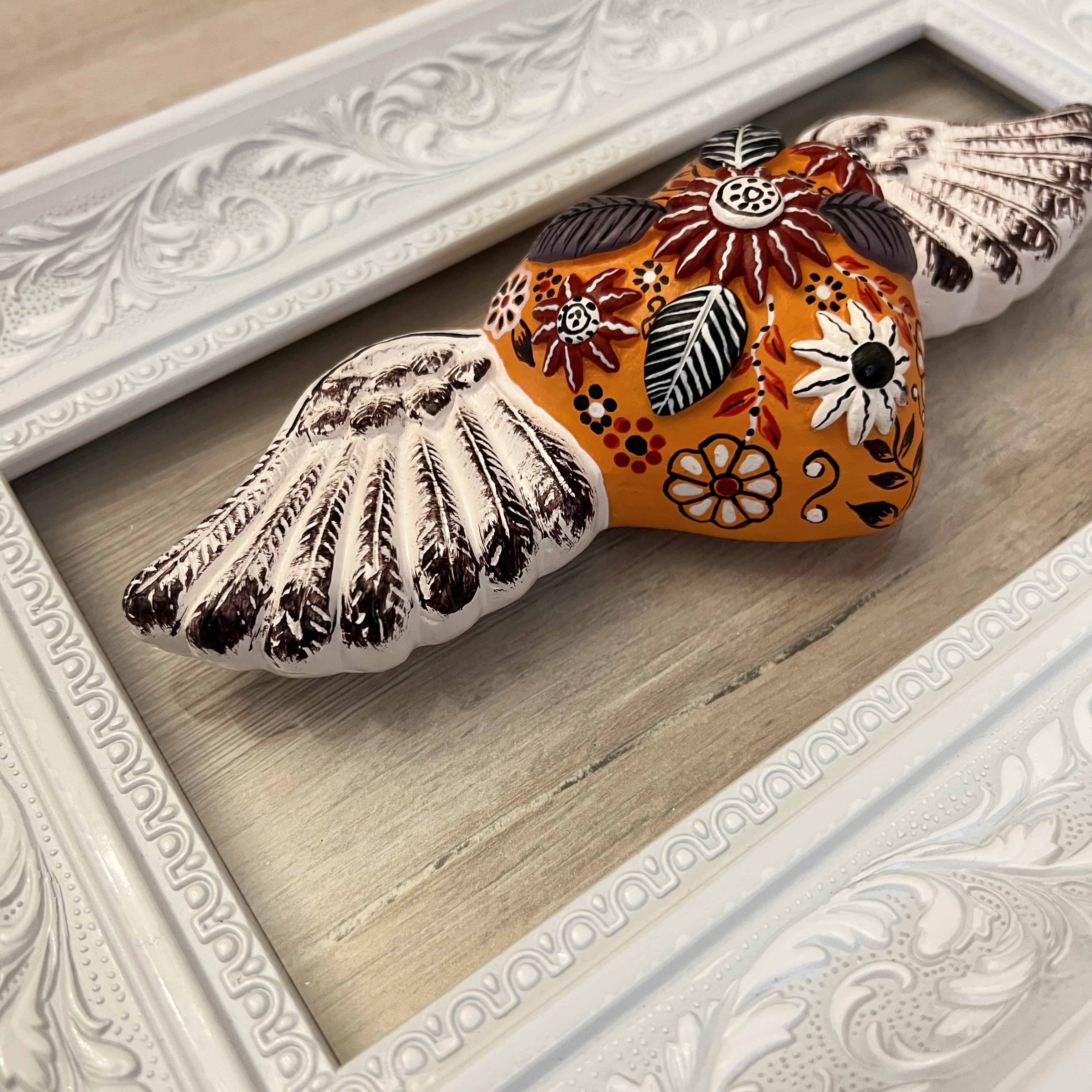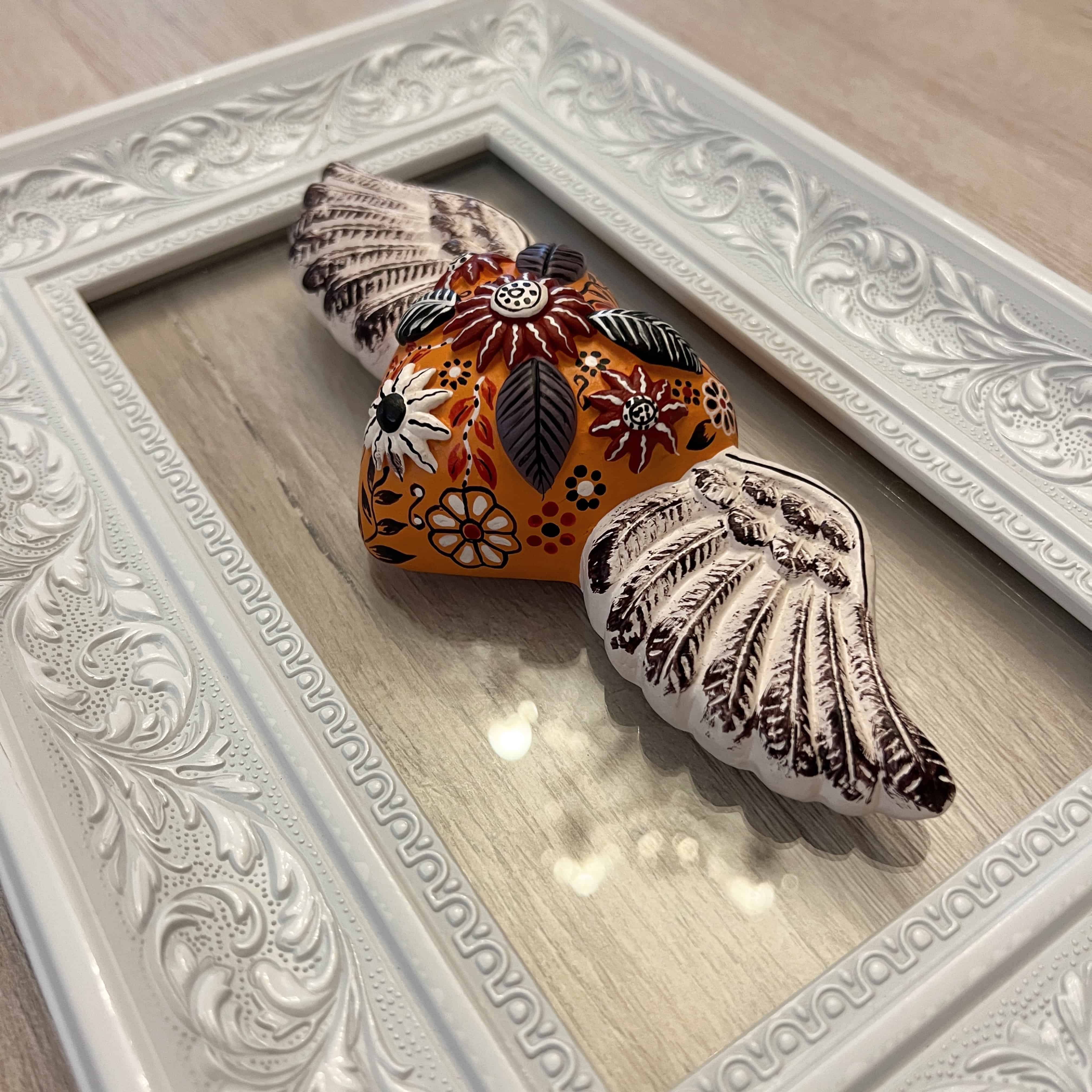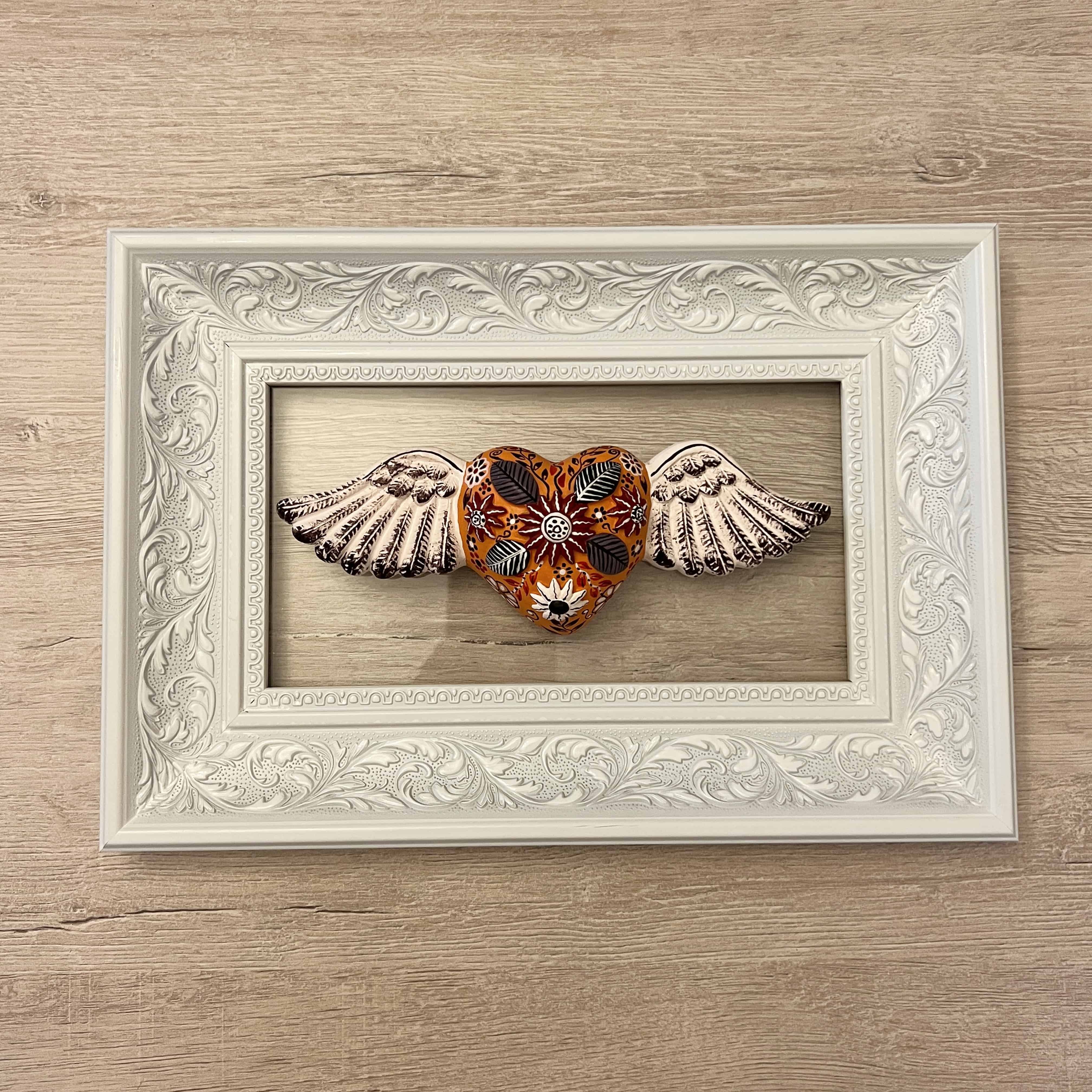 Cuadro corazón con alitas pintadas a mano por artesanos ayacuchanos, en marco italiano de cartela, pintado vintage a mano.