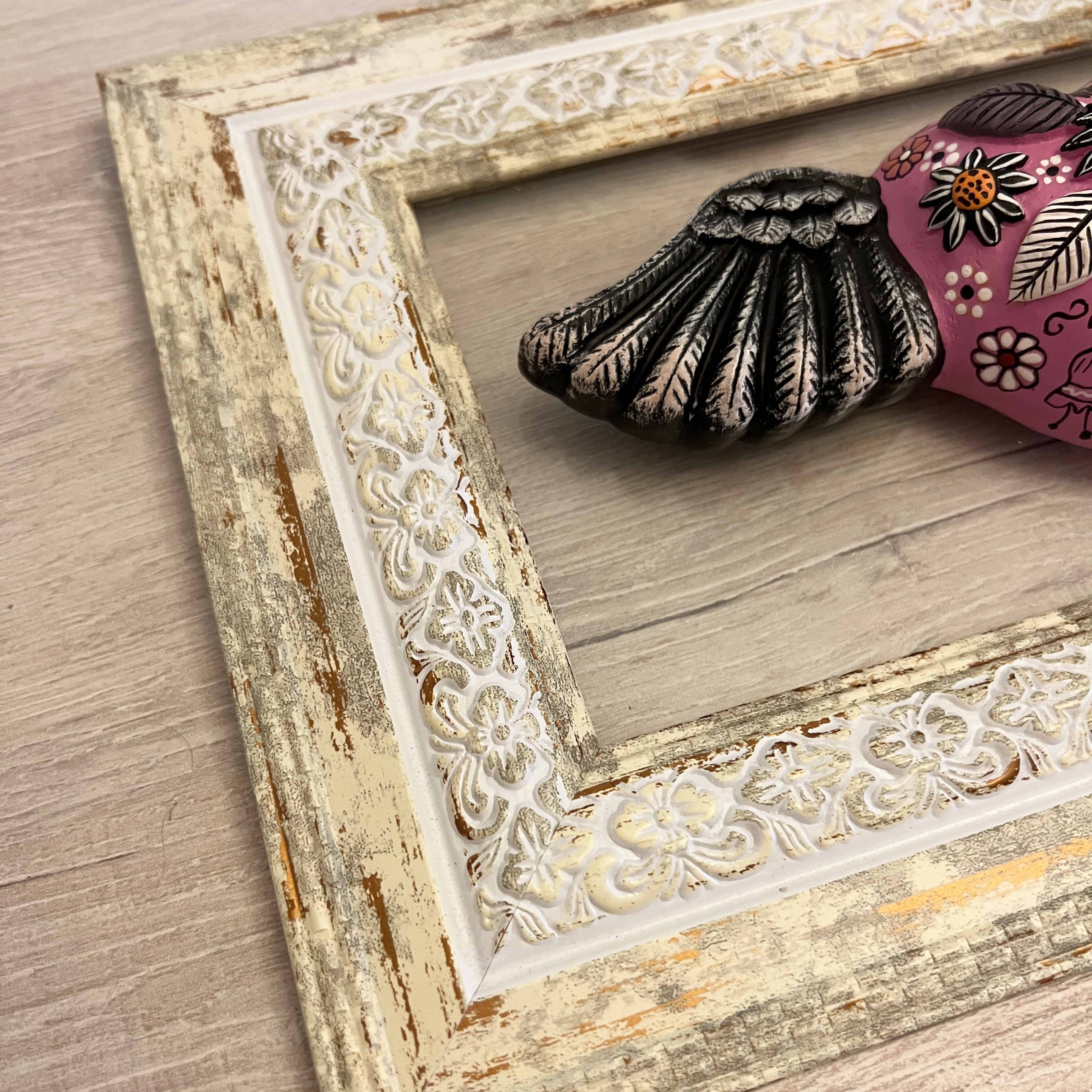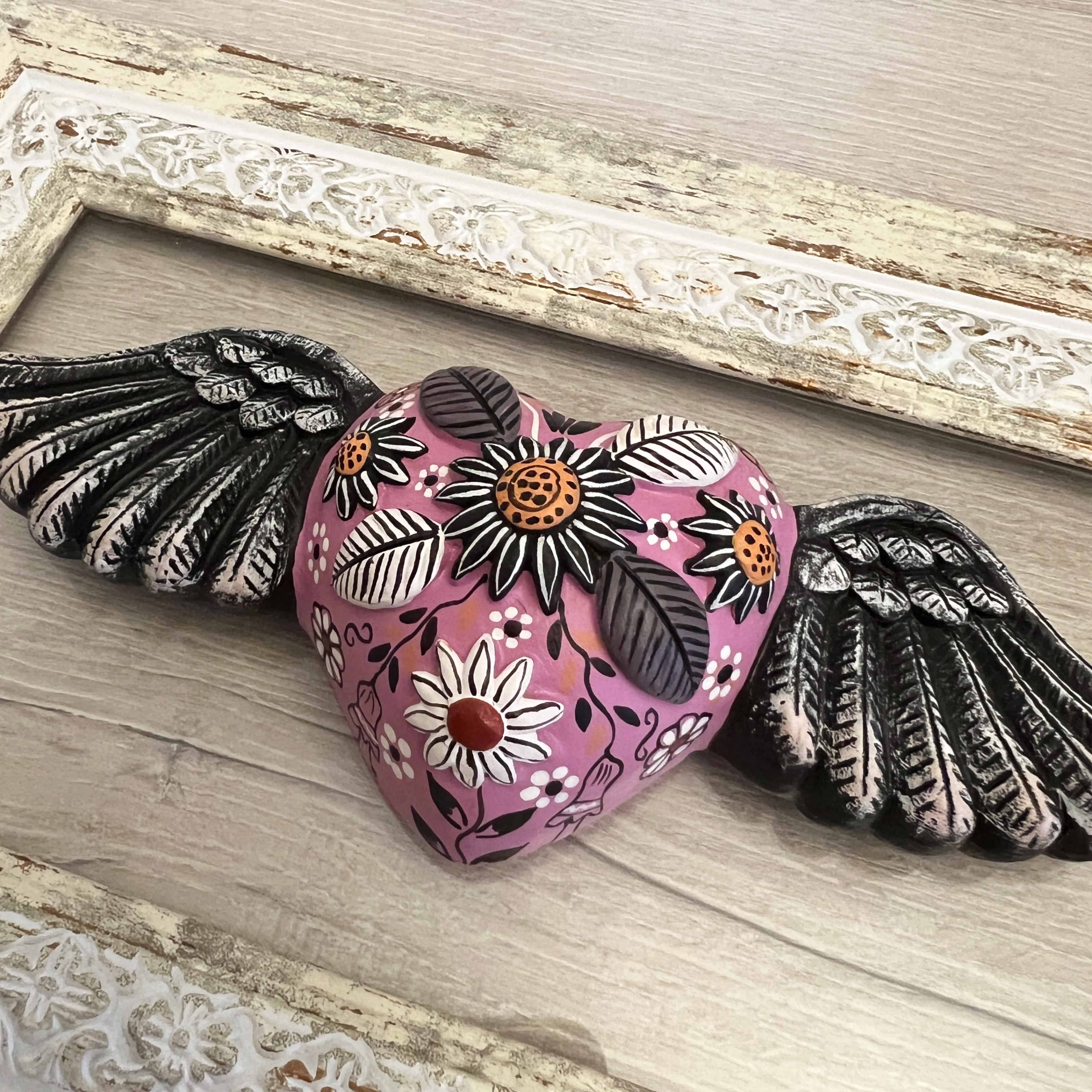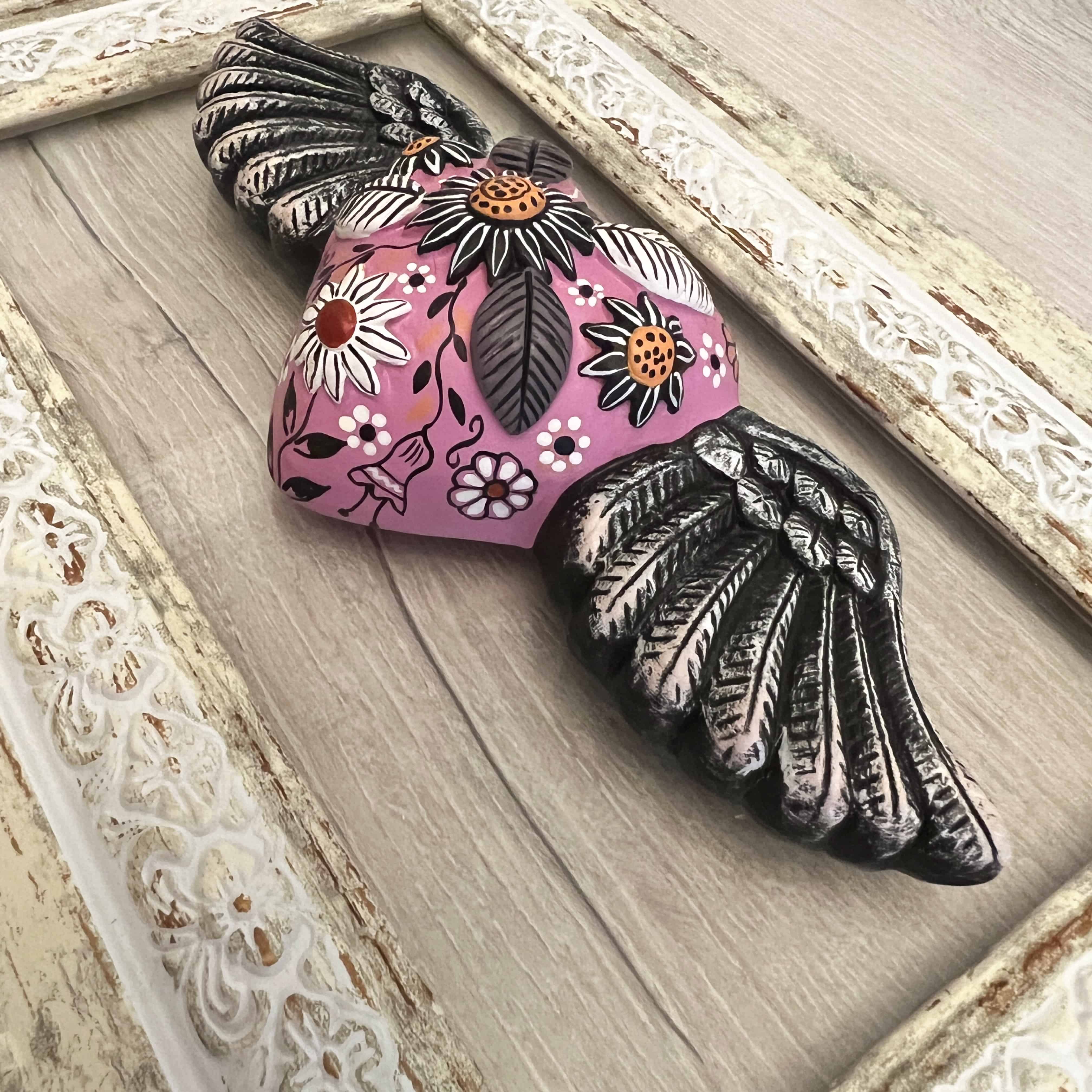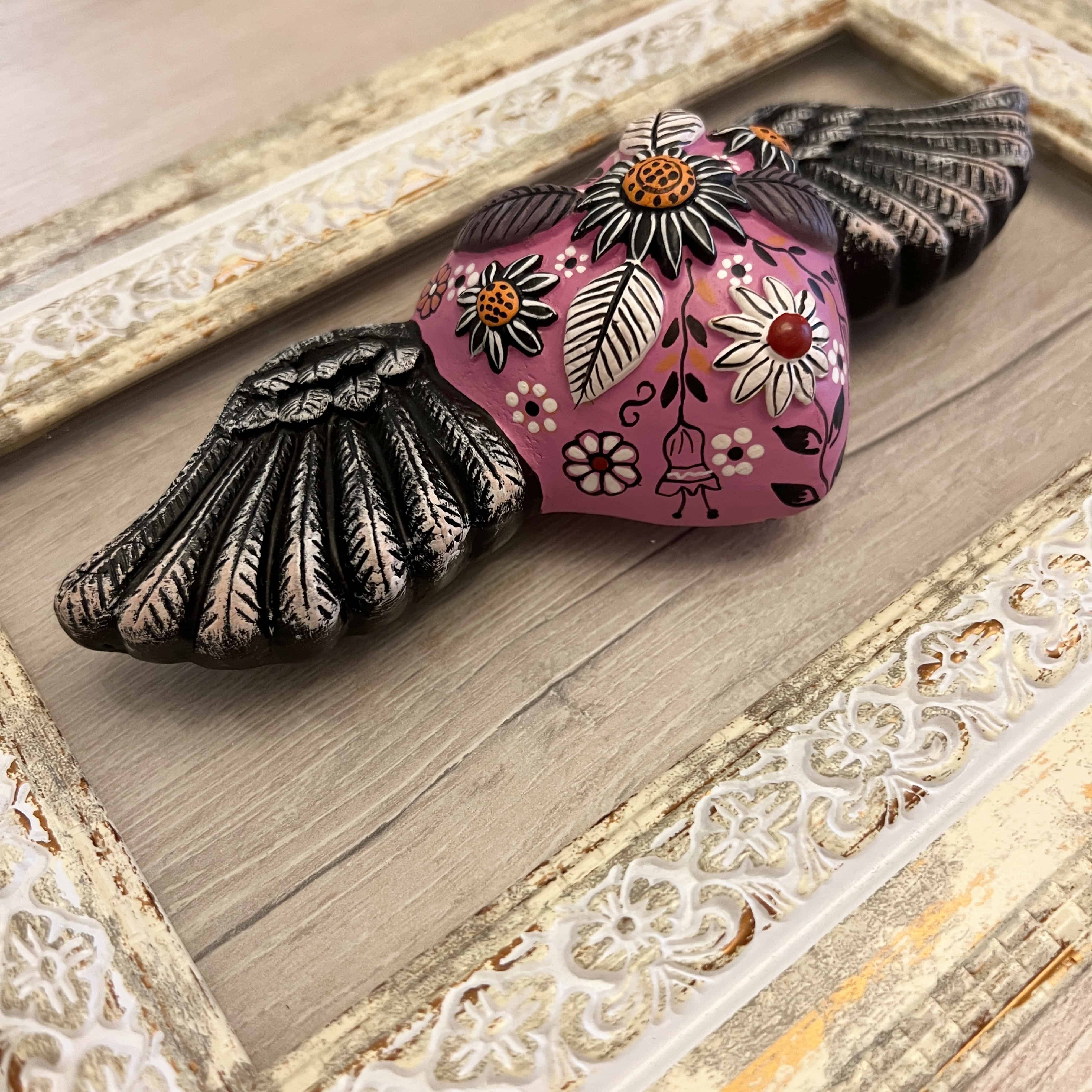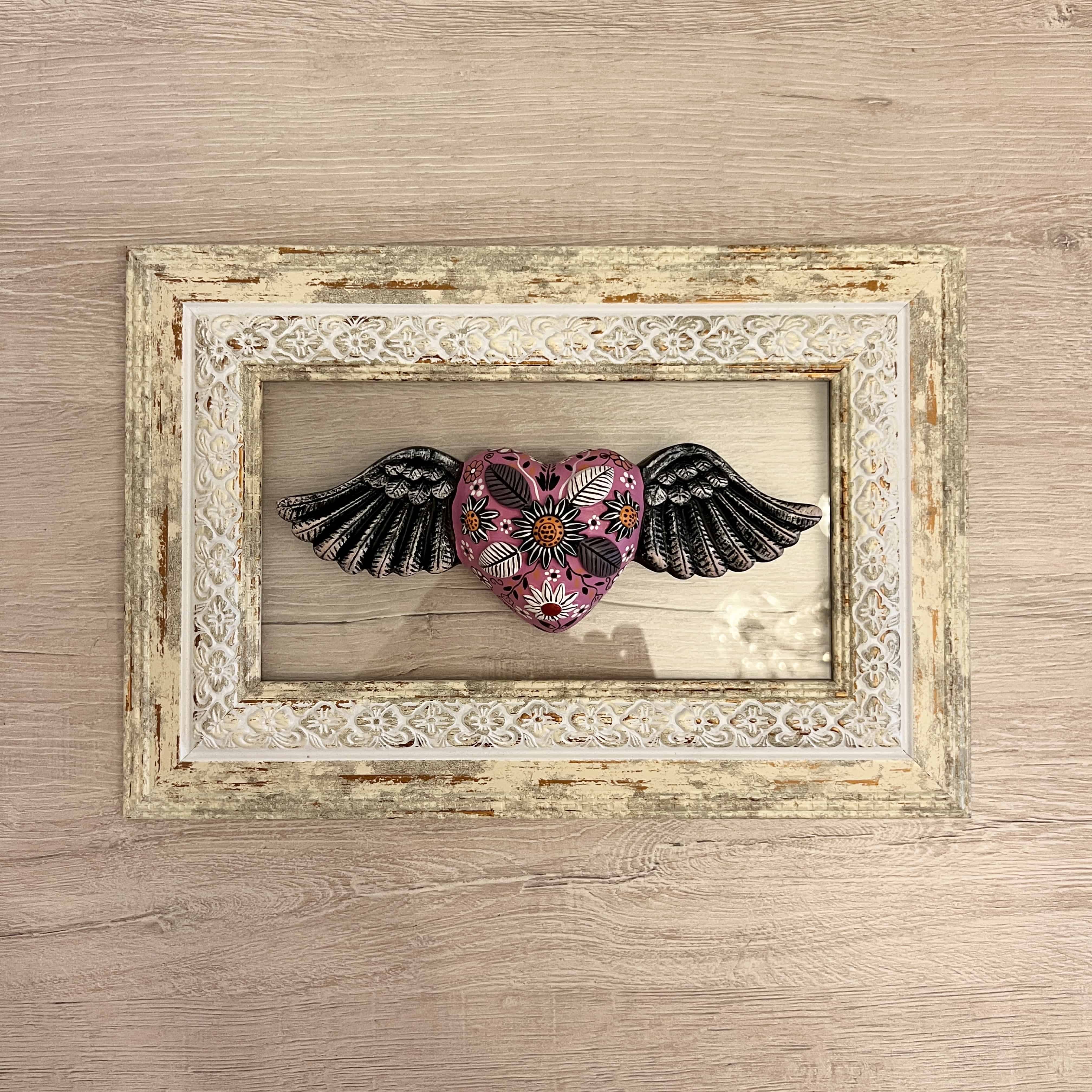 Cuadro corazón con alitas pintadas a mano por artesanos ayacuchanos, en marco italiano de cartela, pintado vintage a mano.