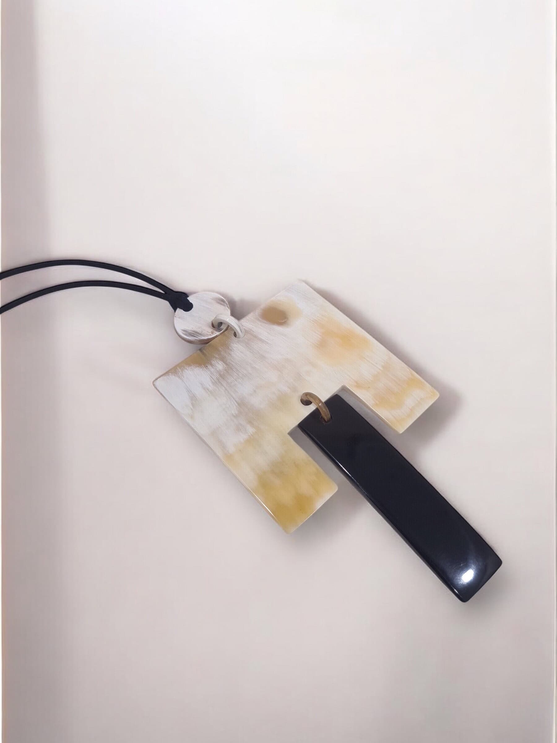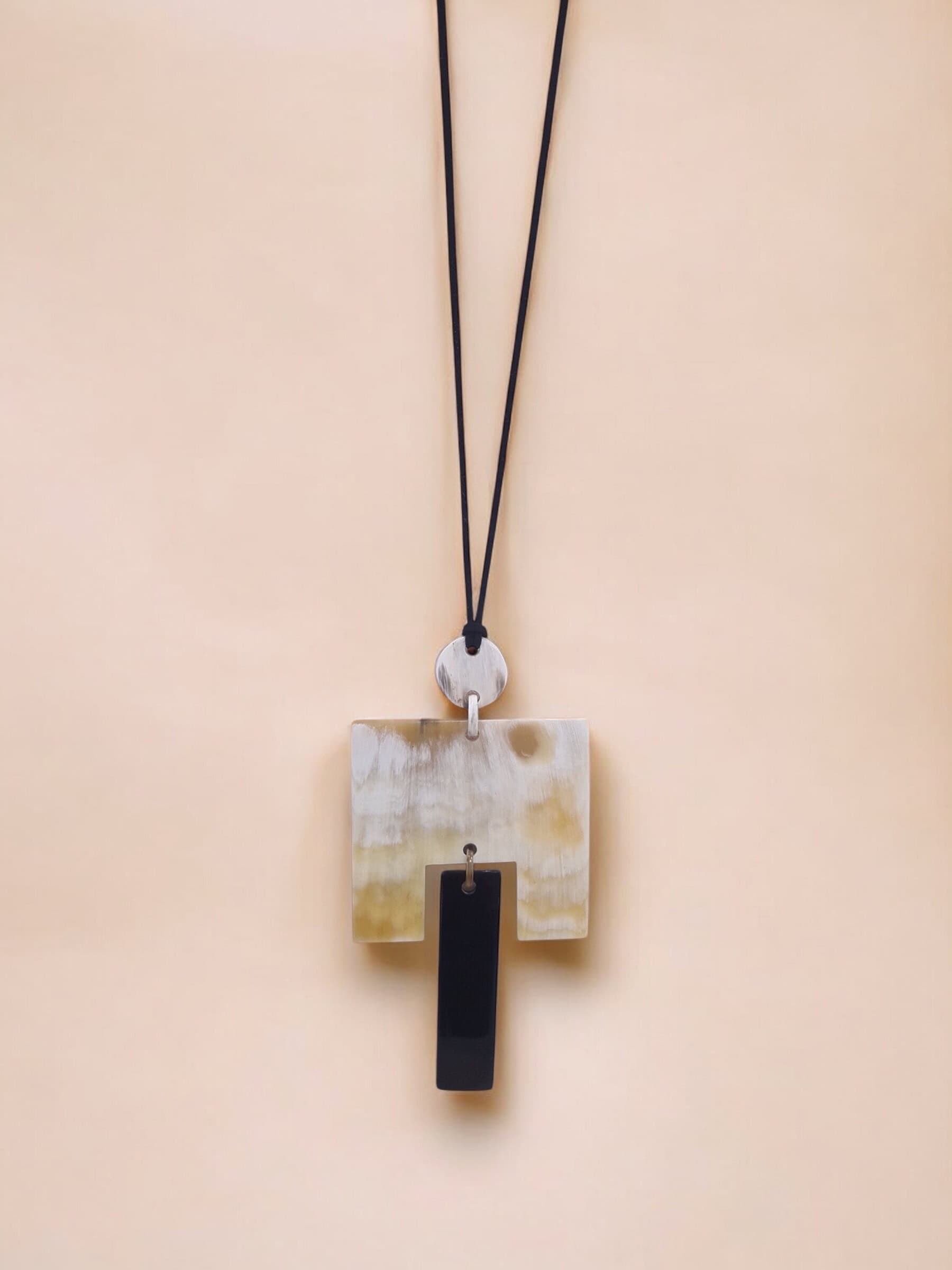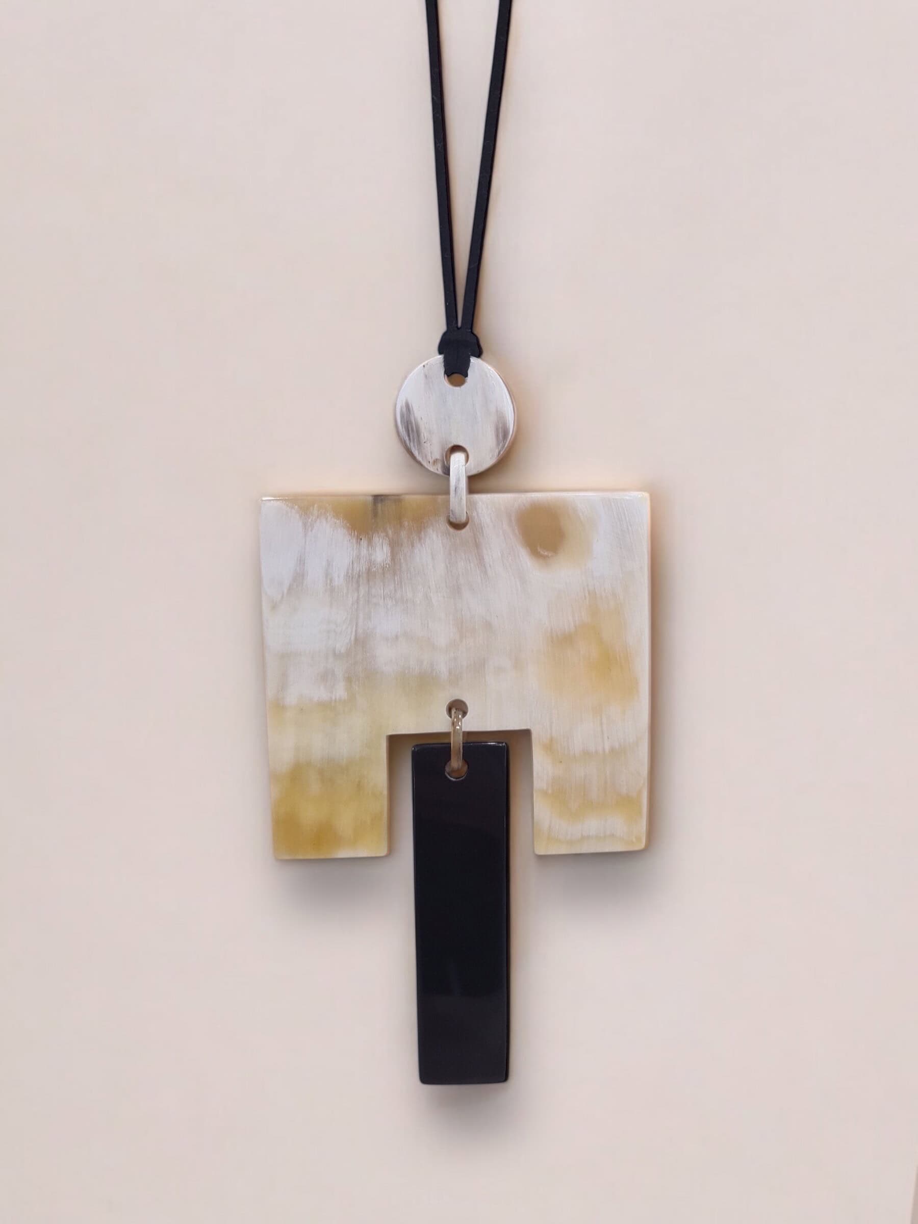 Collar largo hecho a mano en cacho de toro reciclado. La belleza del material y el trabajo fino artesanal dan como resultado una pieza única y sostenible.