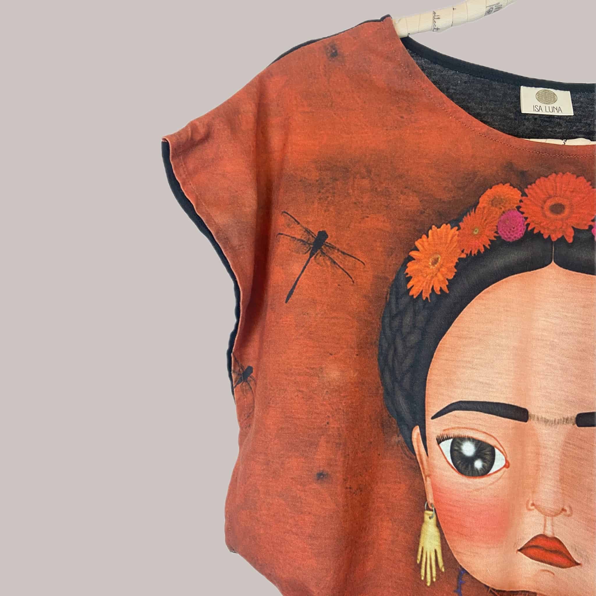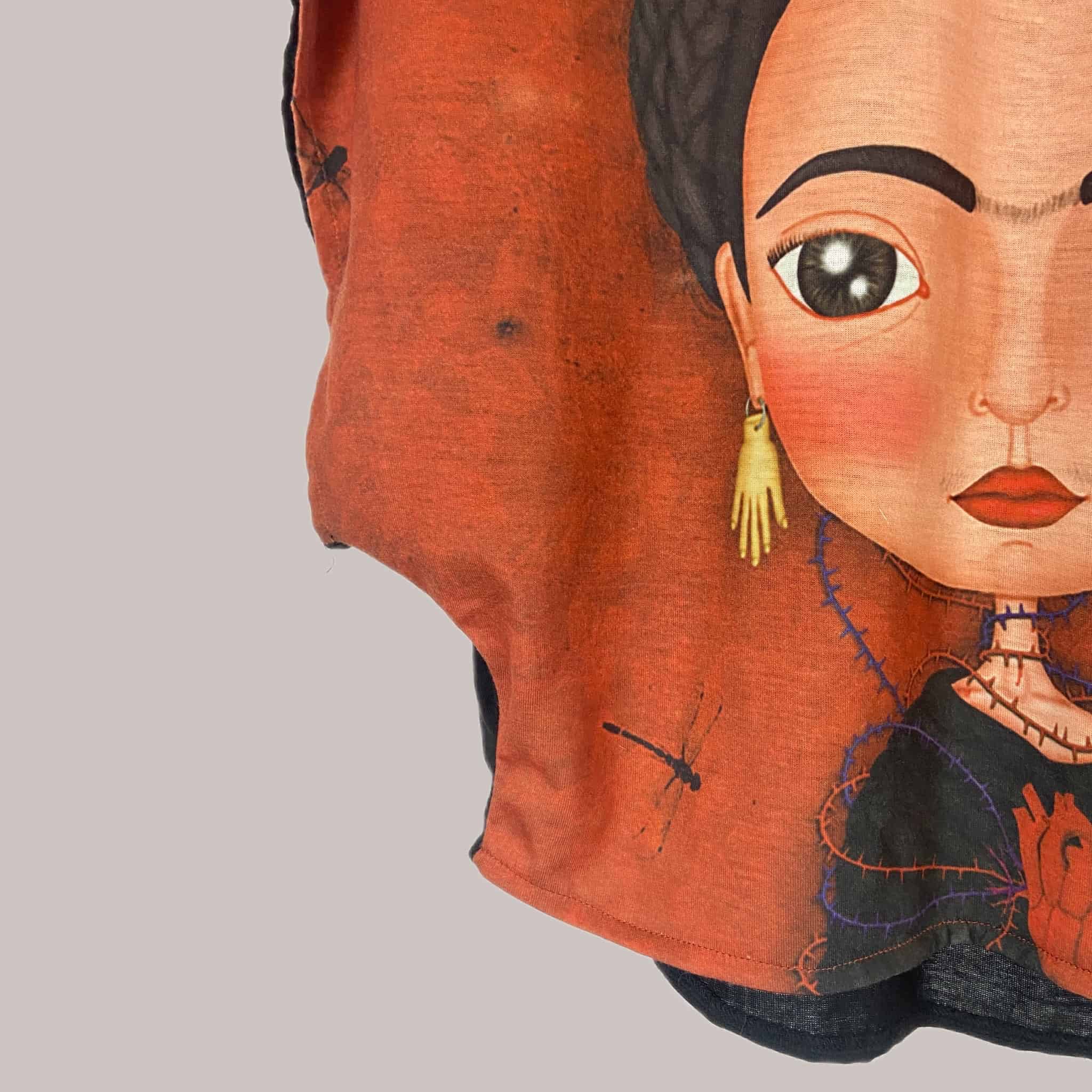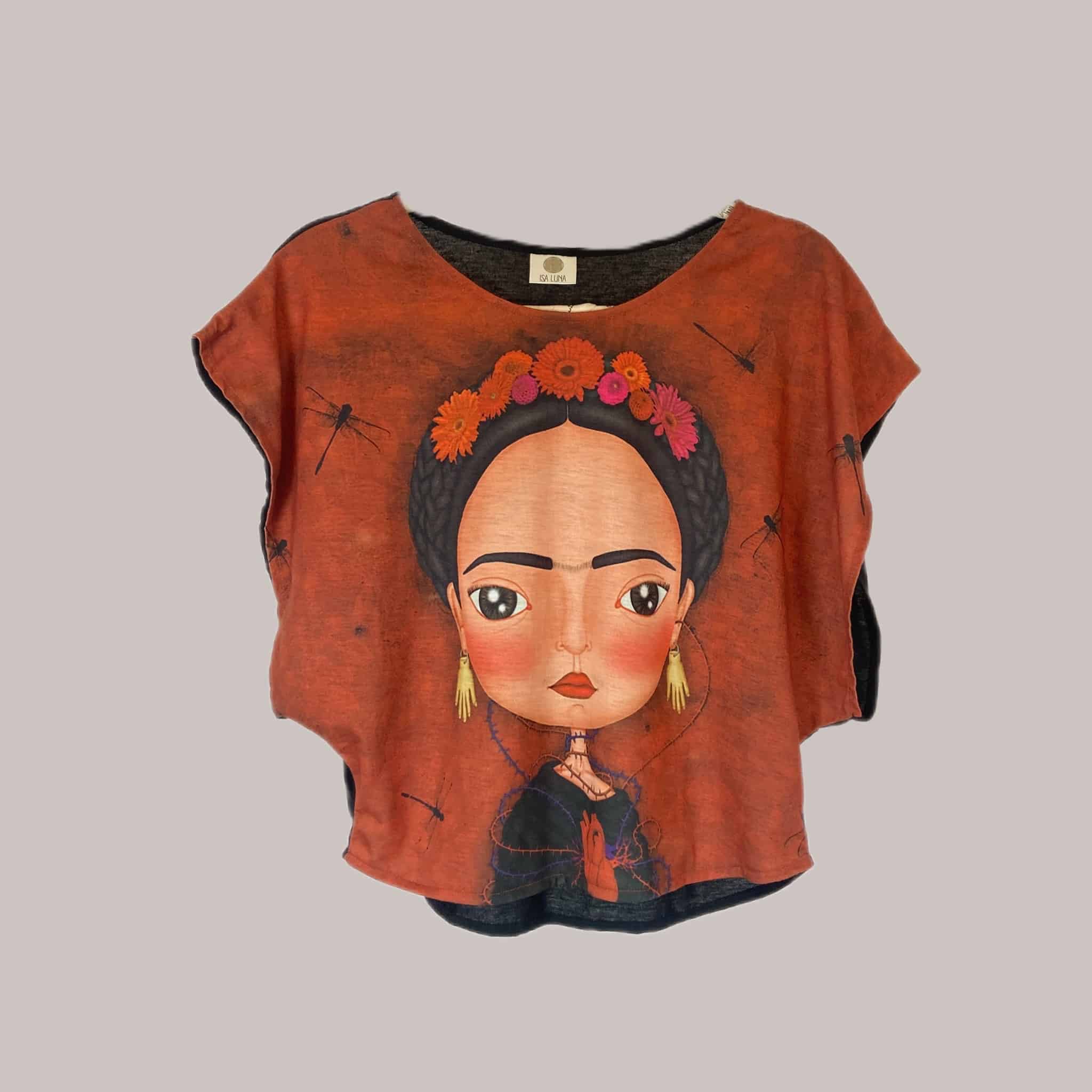 Polo de la icónica Frida Kahlo, sublimado en poliseda, que le da ligereza a la prenda.