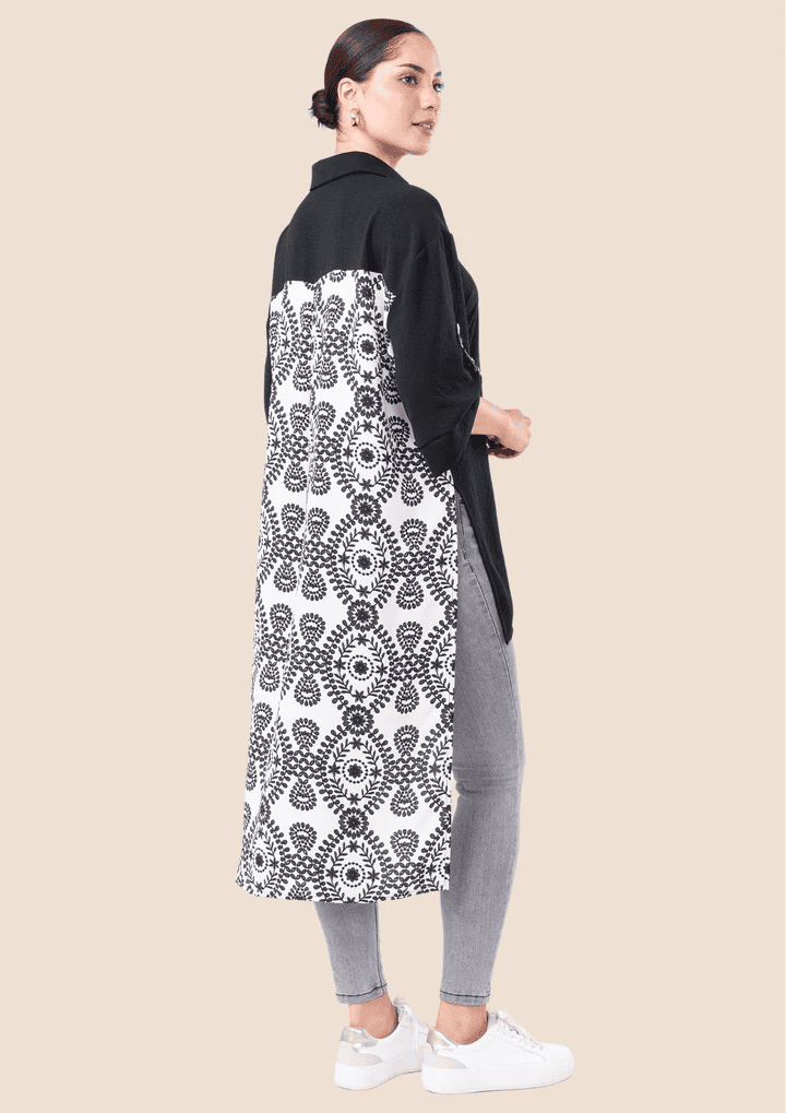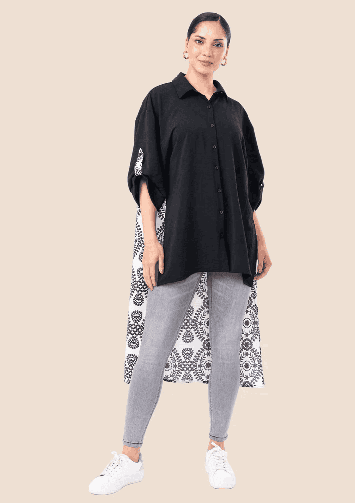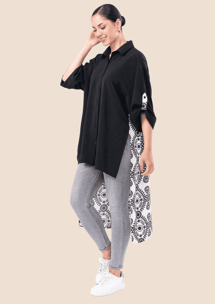 Maxiblusa oversize diseñada en viena, con cuello en V, botones de nacar. Un print unico en la parte posterior.