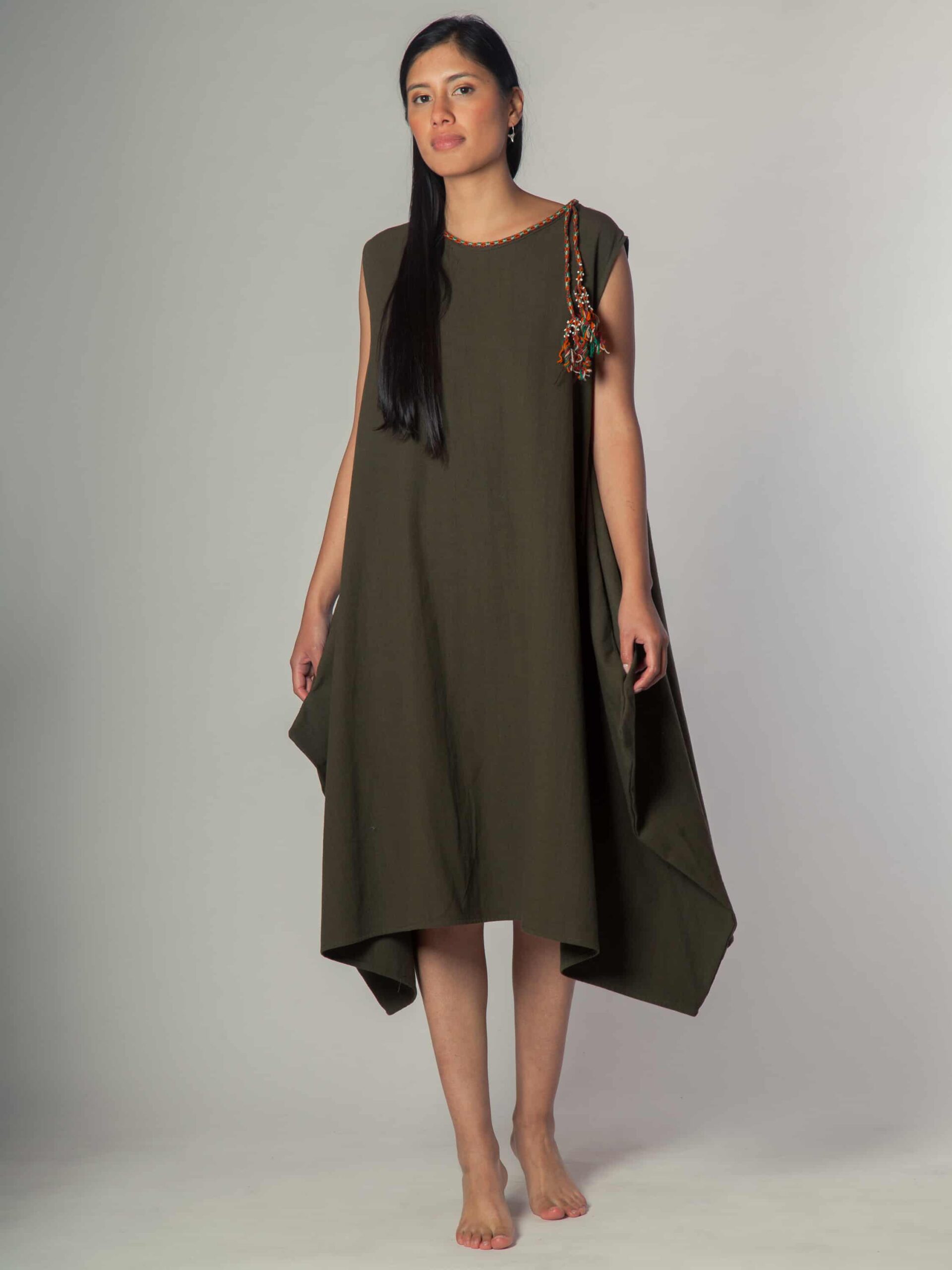 Vestido con corte asimétrico que le da a la prenda caída y movimiento.