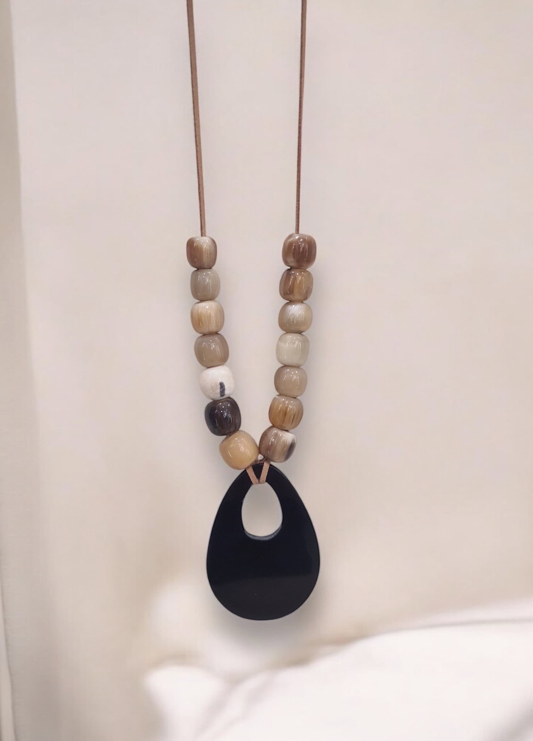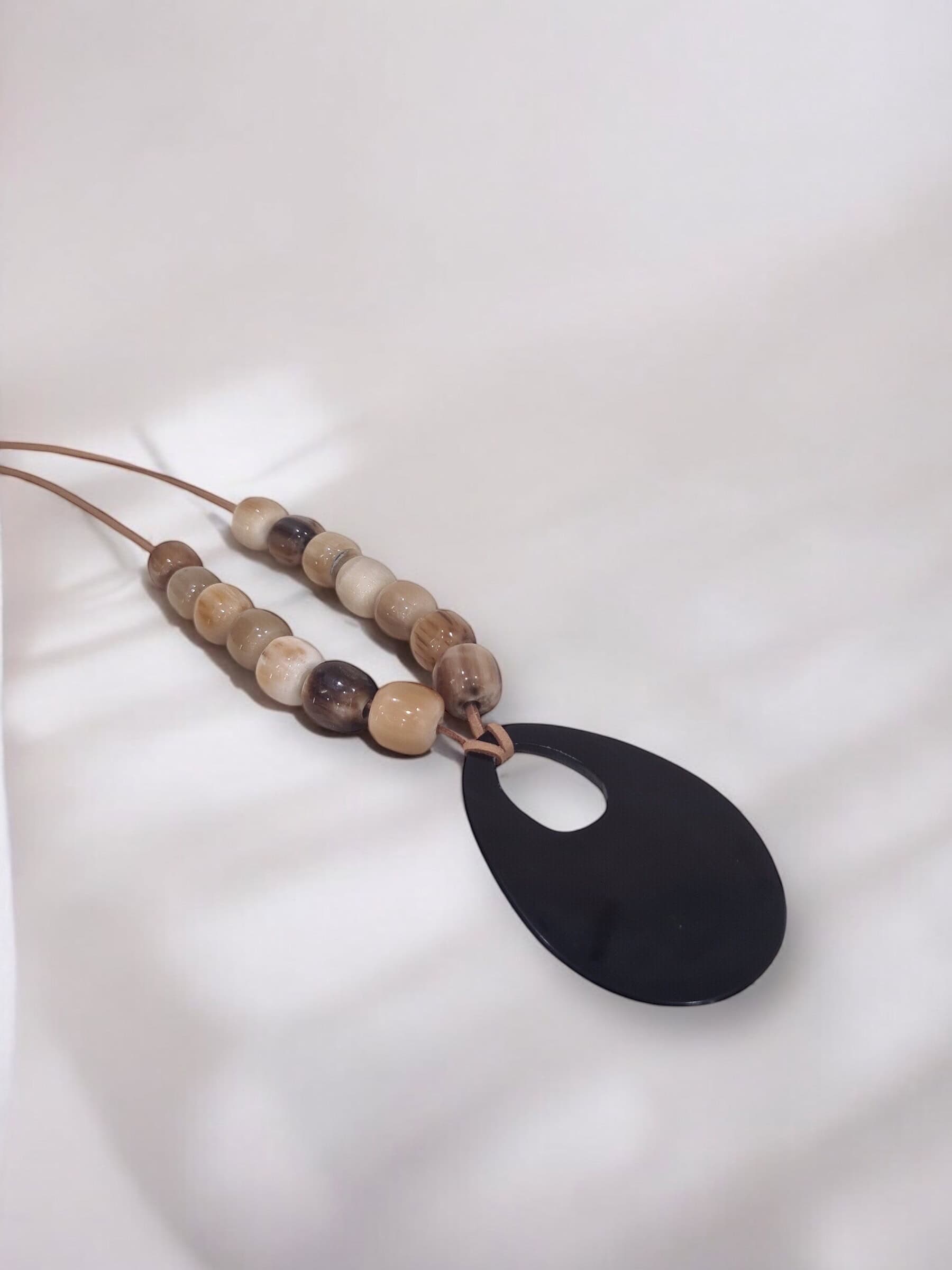 Collar largo hecho a mano en cacho de toro reciclado. La belleza del material y el trabajo fino artesanal dan como resultado una pieza única y sostenible.