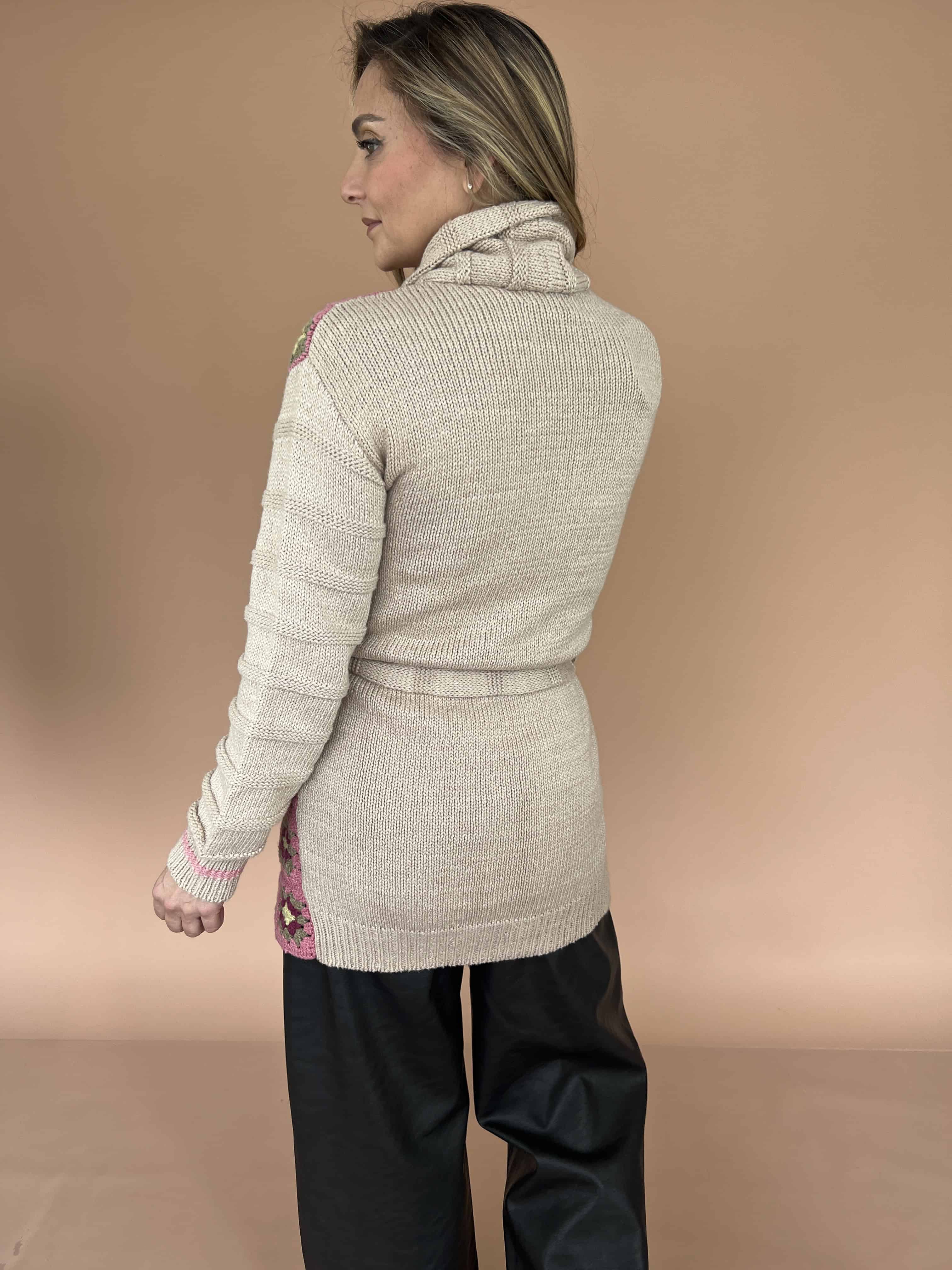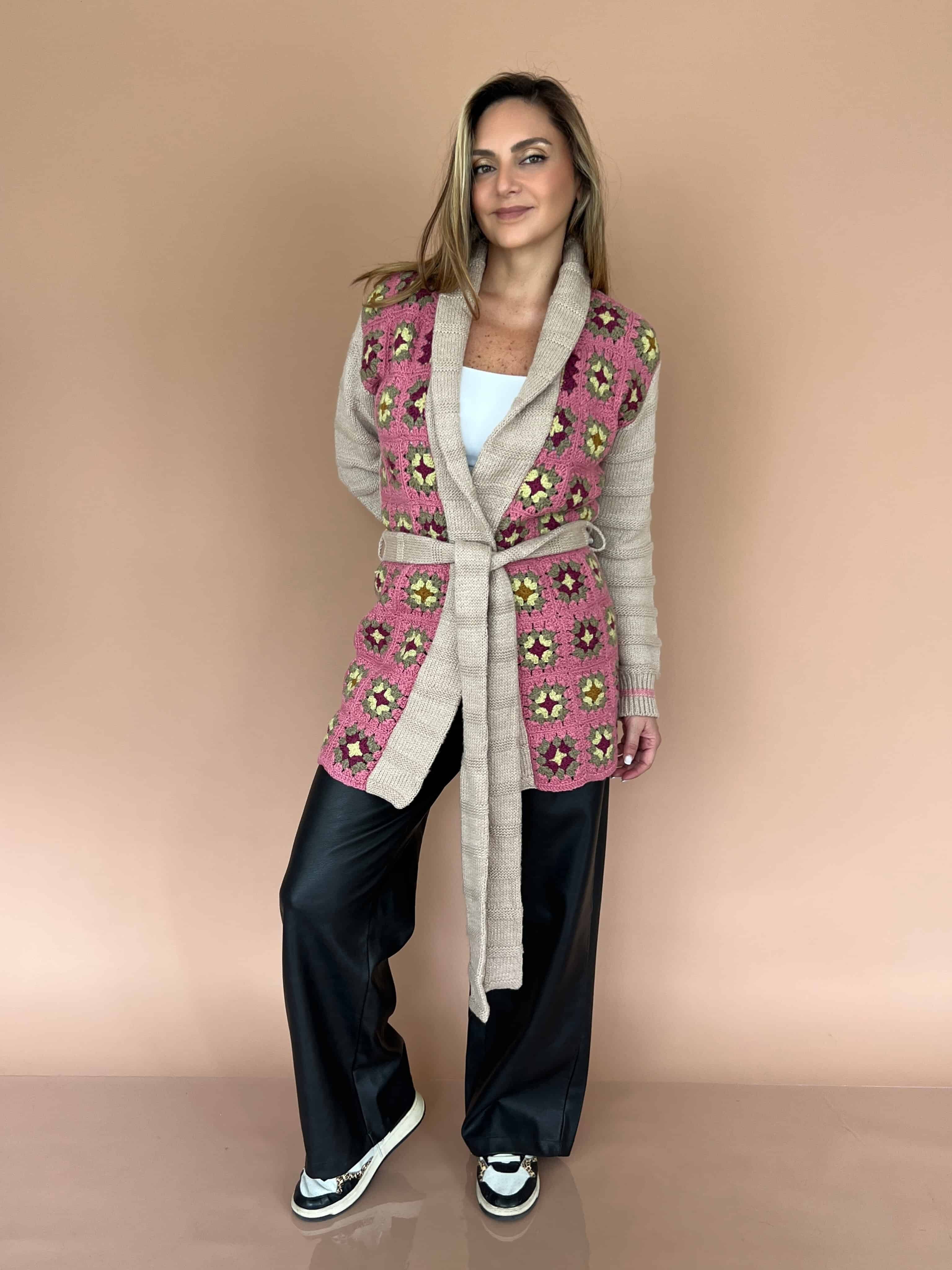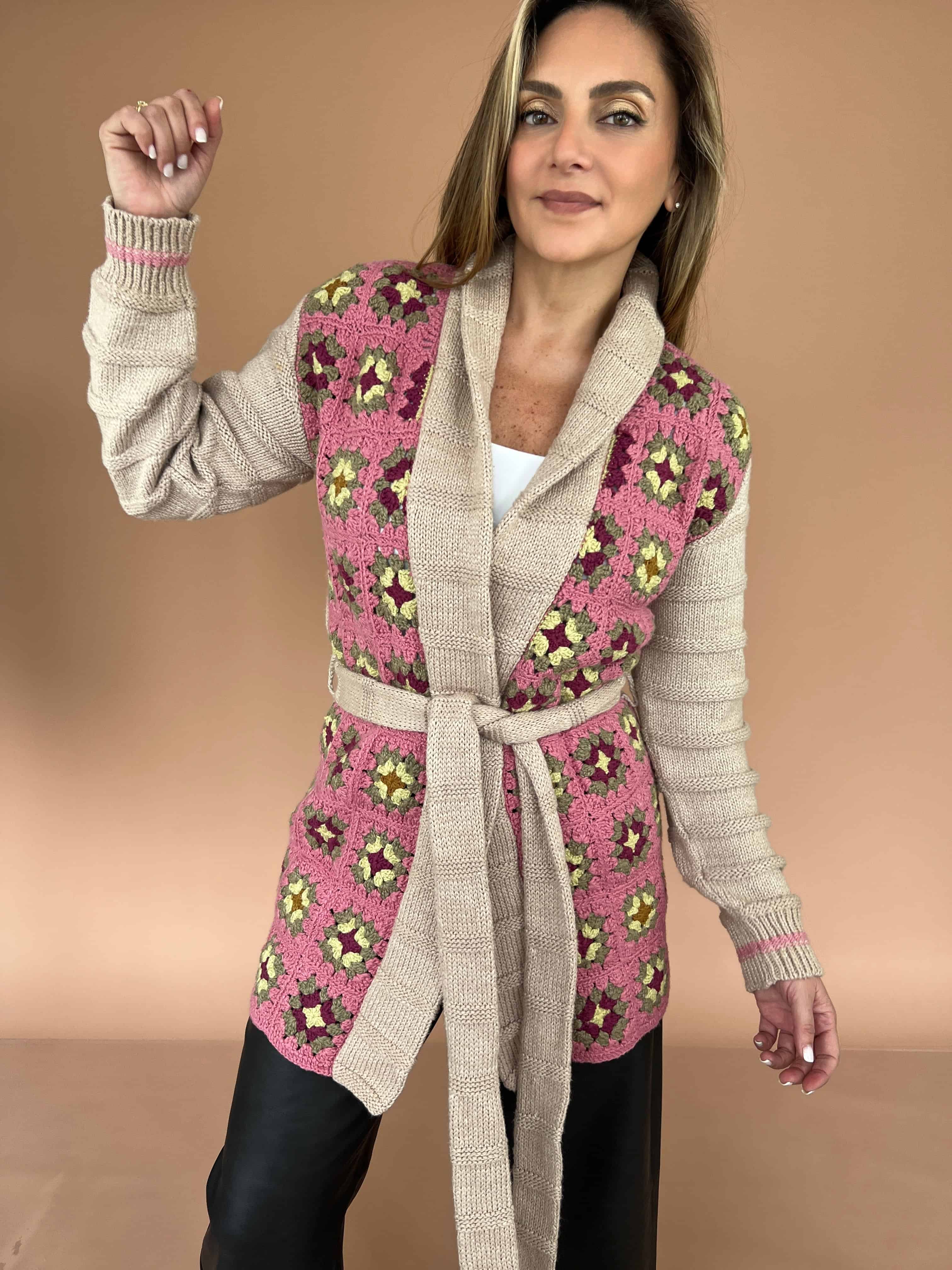 Cardigan de baby alpaca con un diseño vintage, hecho a mano en crochet, cuenta con un cinturón para ajustar la cintura.
