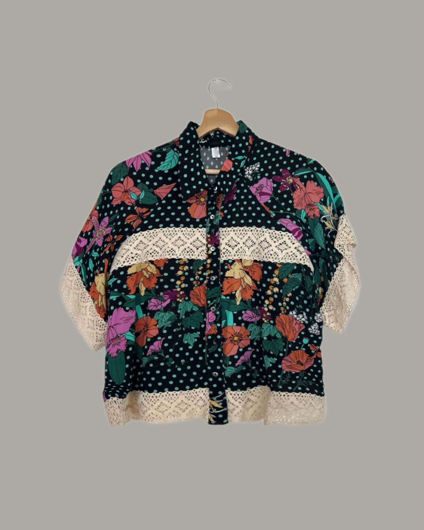 Blusa hecha de materiales de deadstock, unida por tiras de greca de 100% algodón. Con diseño oversize, esta confeccionada dentro del taller del penal de Fátima, con mujeres en situaciones vulnerables, que son parte de un programa social de empoderamiento y empleabilidad. Esta prenda fue elaborada con materiales conscientes con el medio ambiente y de forma responsable, bajo los lineamientos de comercio justo.
