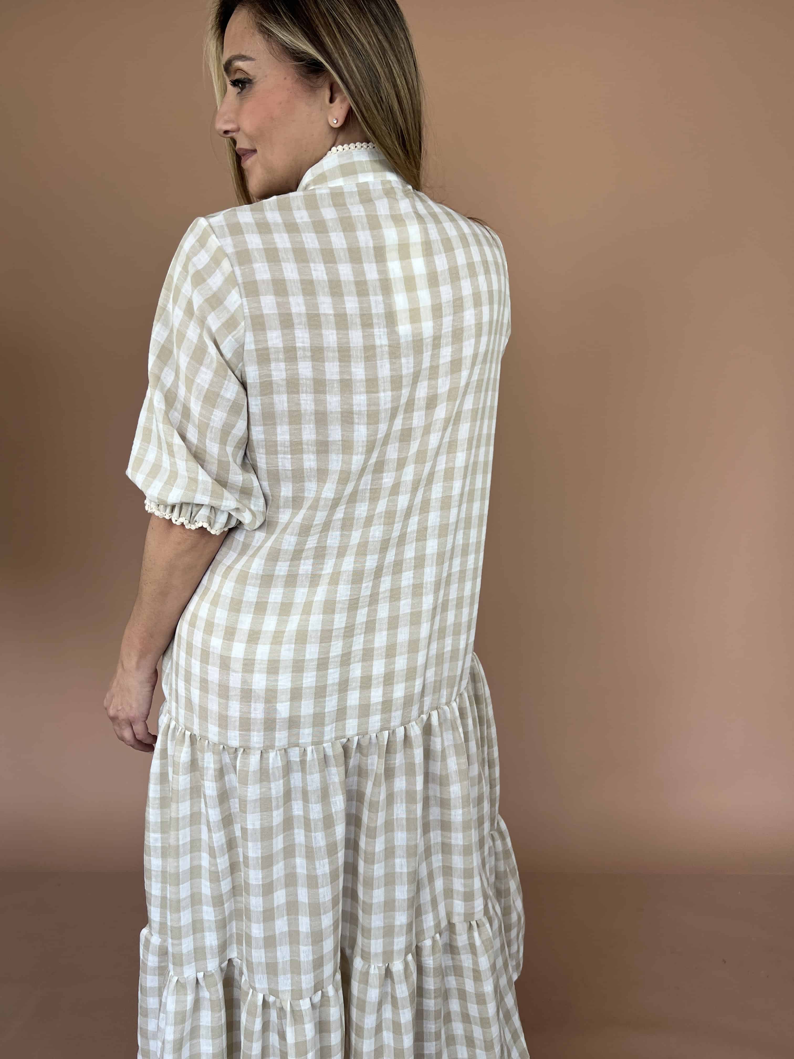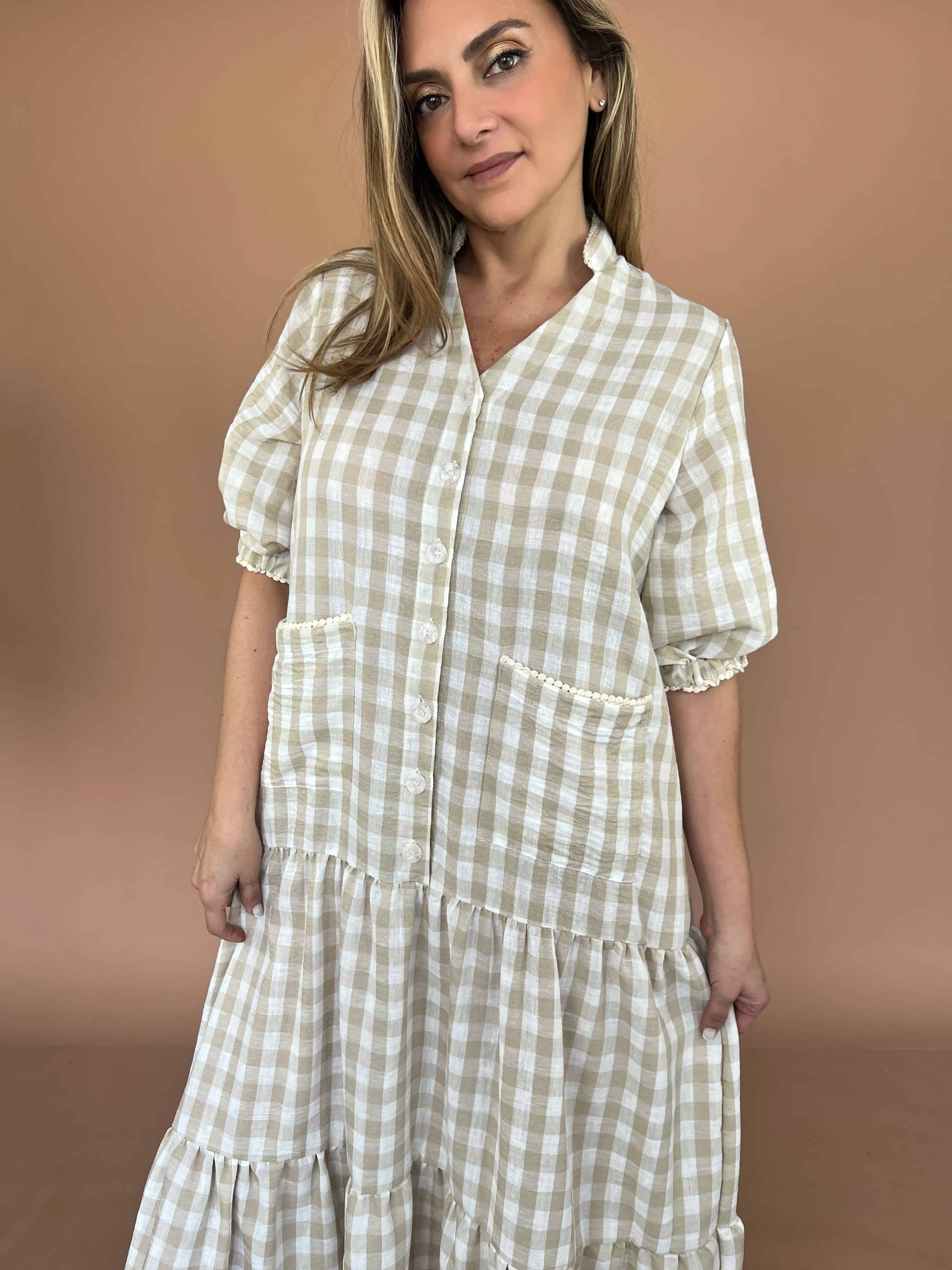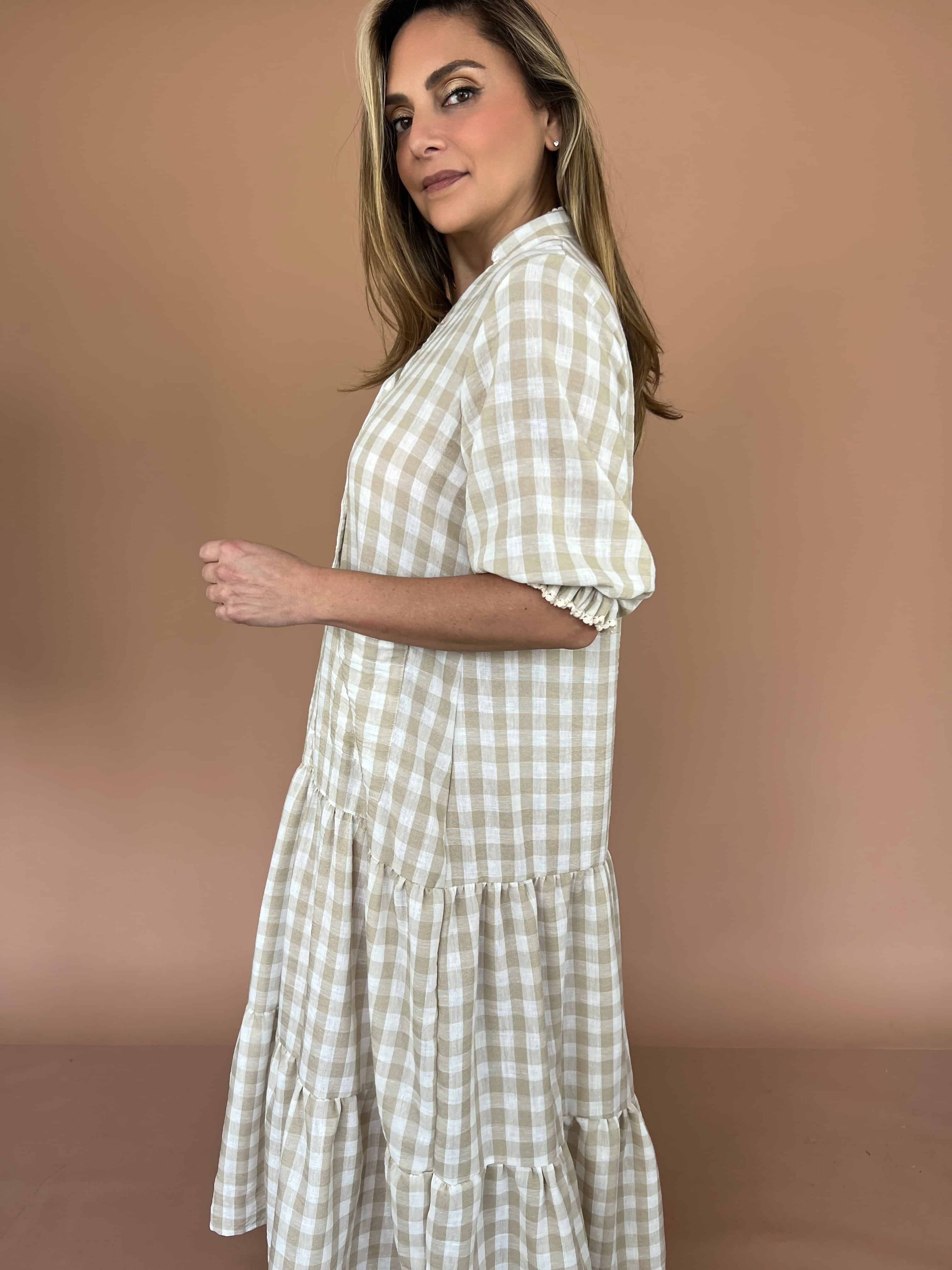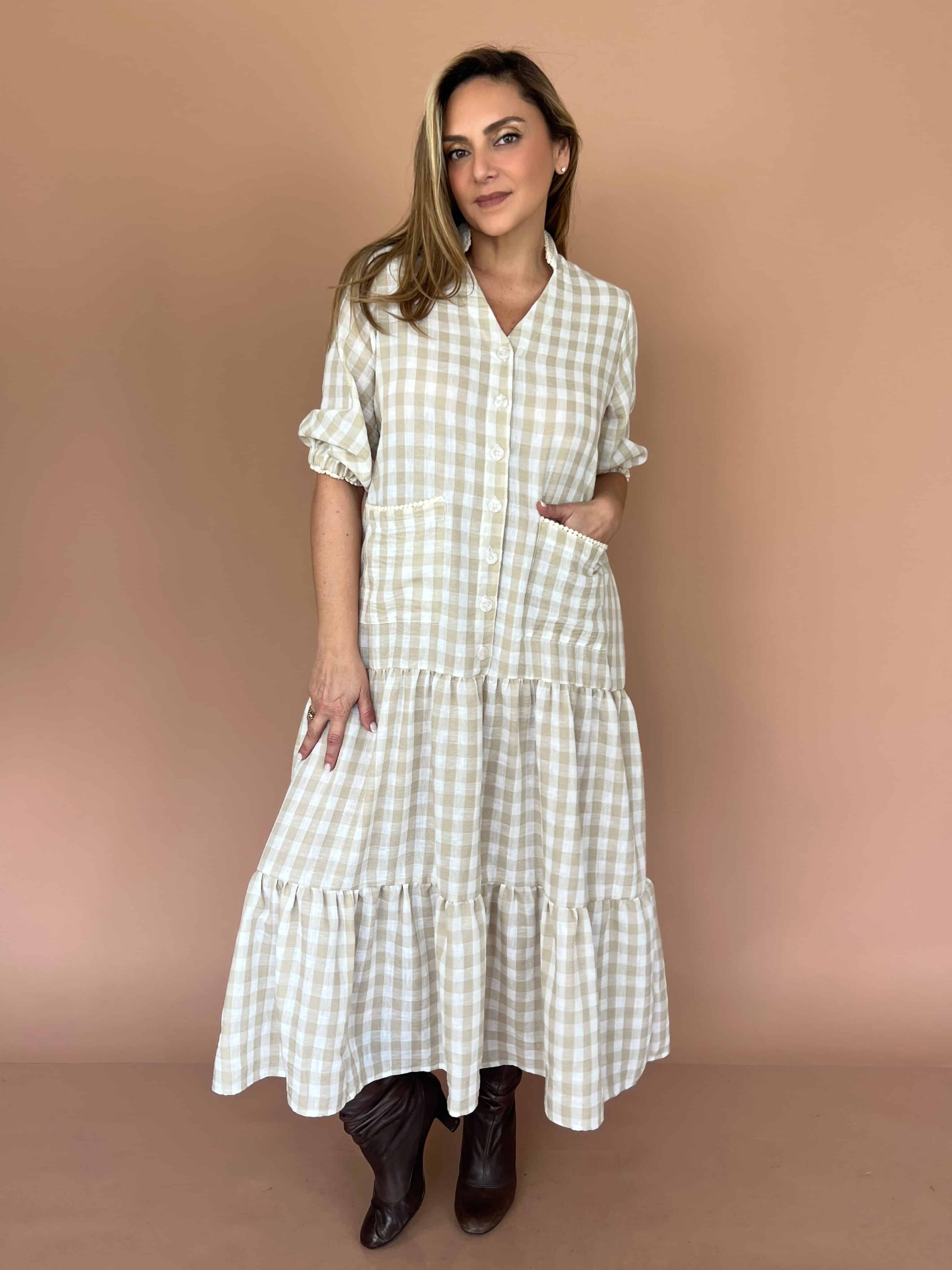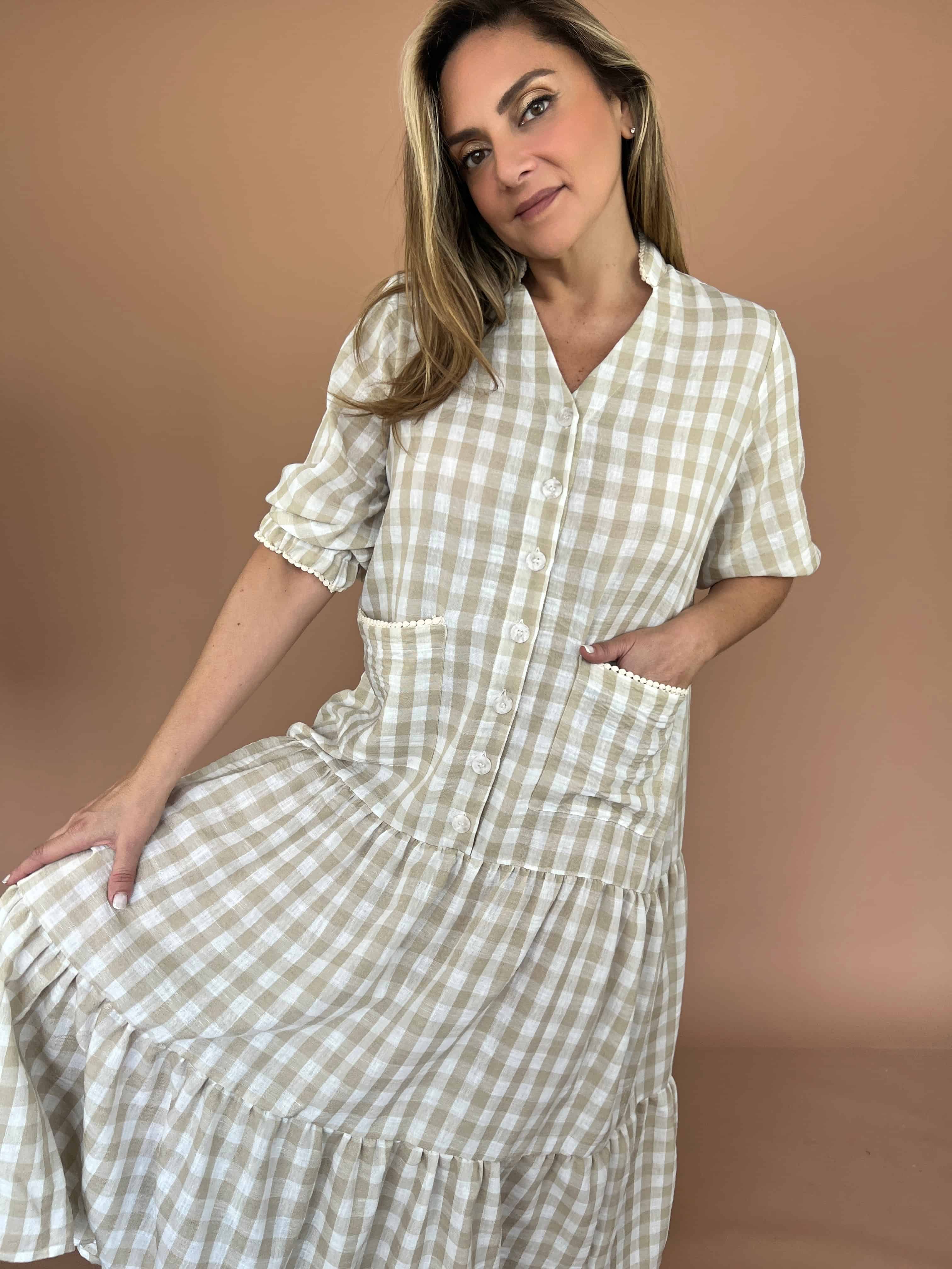 Vestido largo de lino con cuello neru y abertura en V, con diseño en las mangas y bolsillos funcionales. Una prenda fresca y cómoda, perfecta para el día a día.