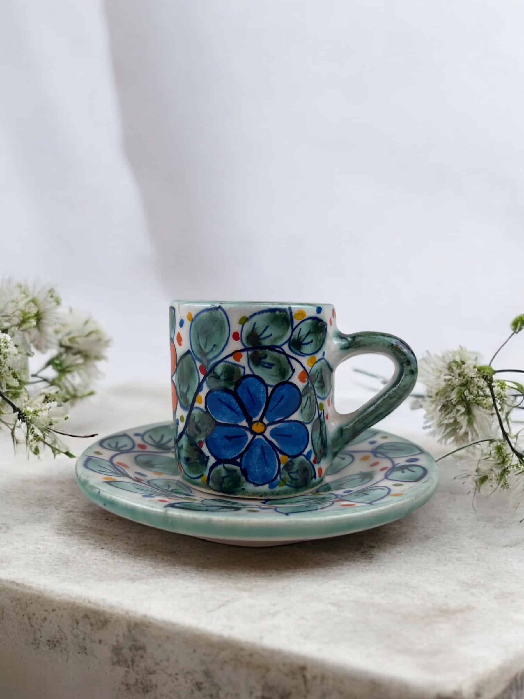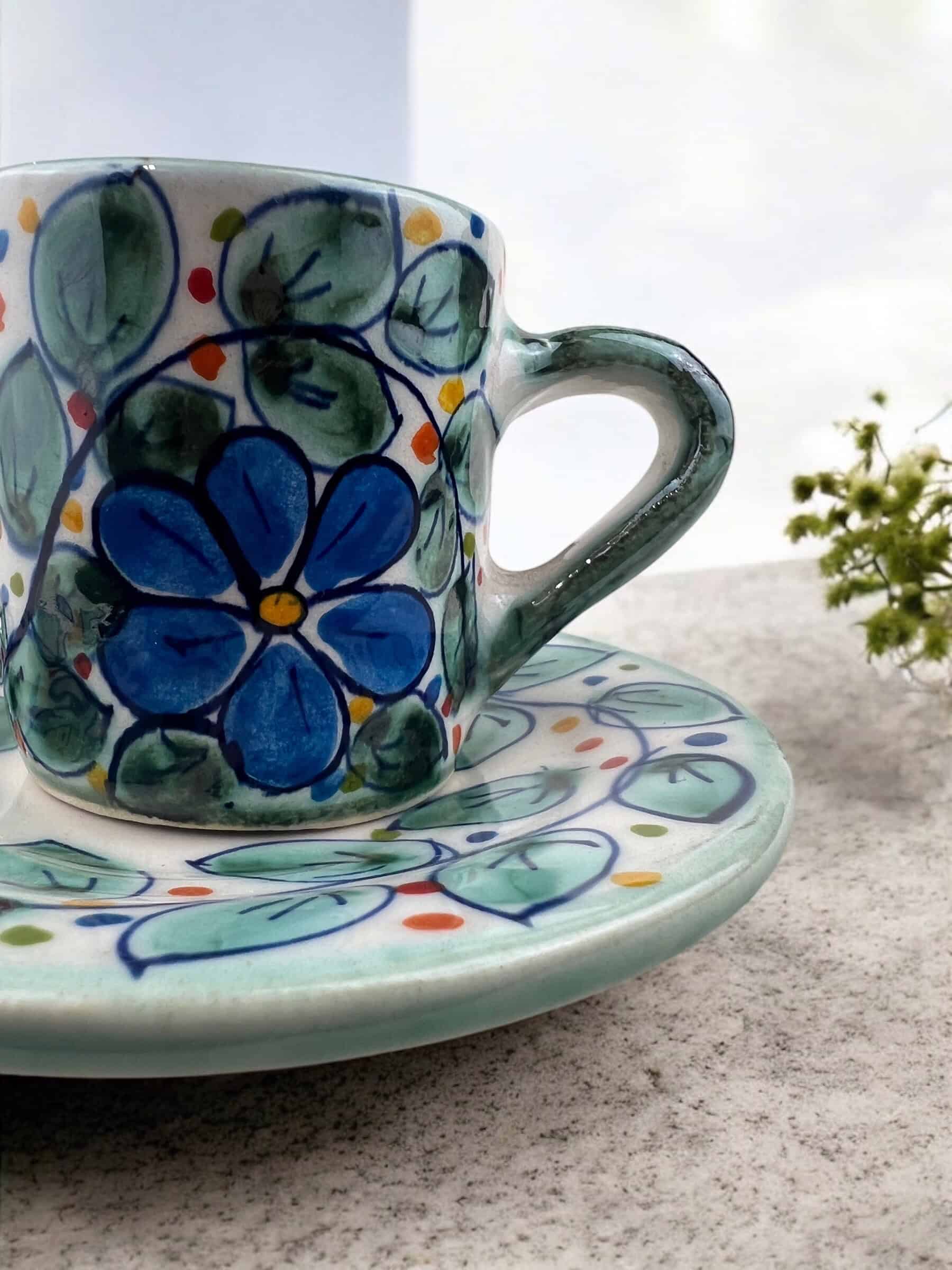 Tacita y plato de cerámica hecha y pintada a mano por artesanos limeños. !Excelente para servir café expresso!