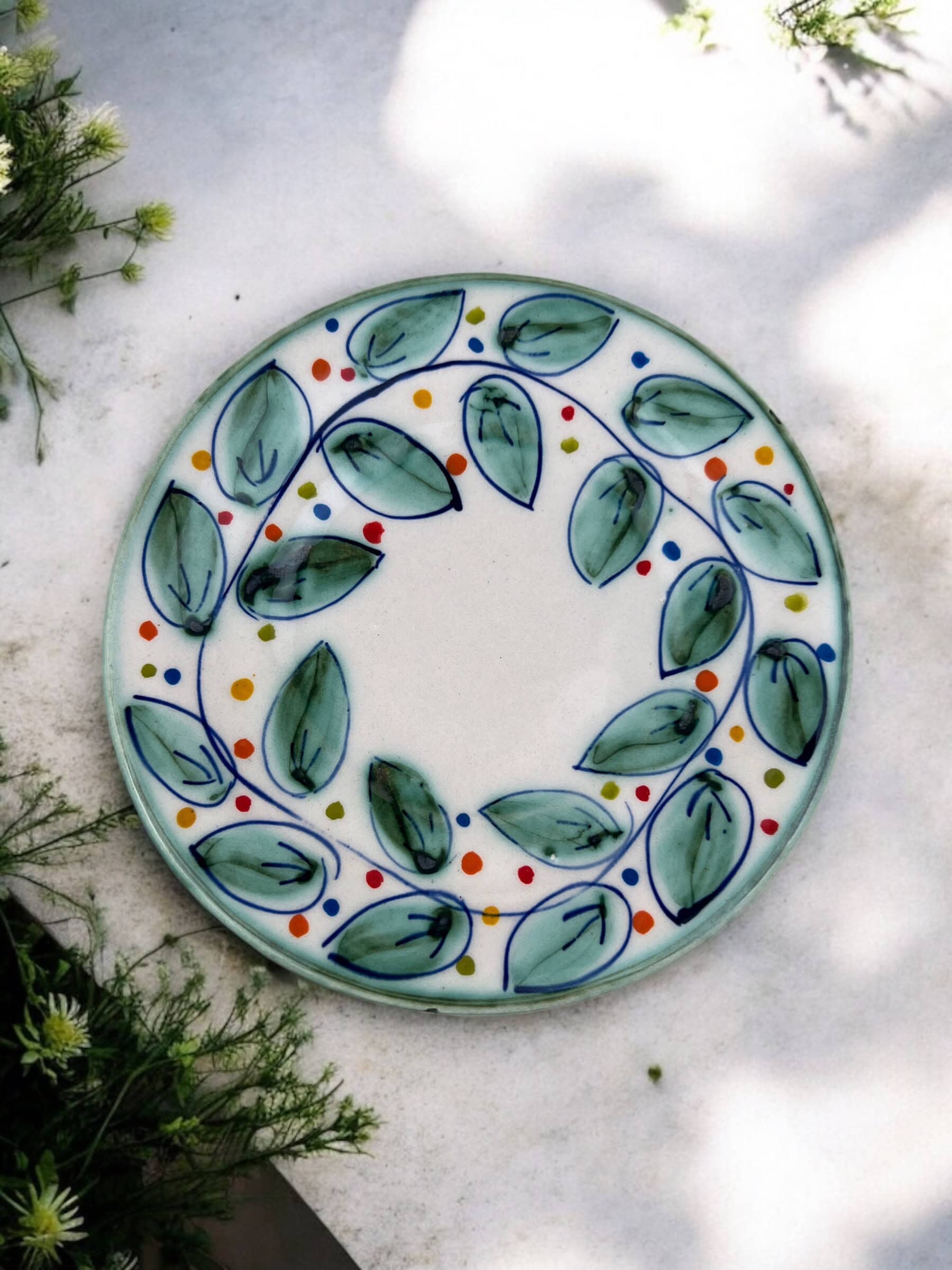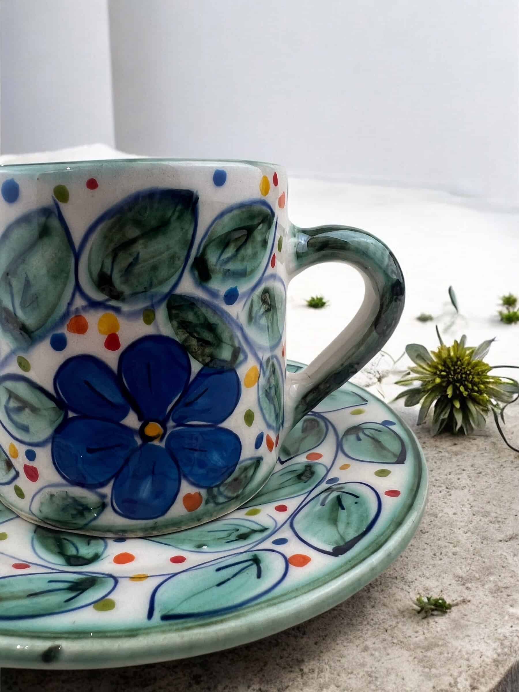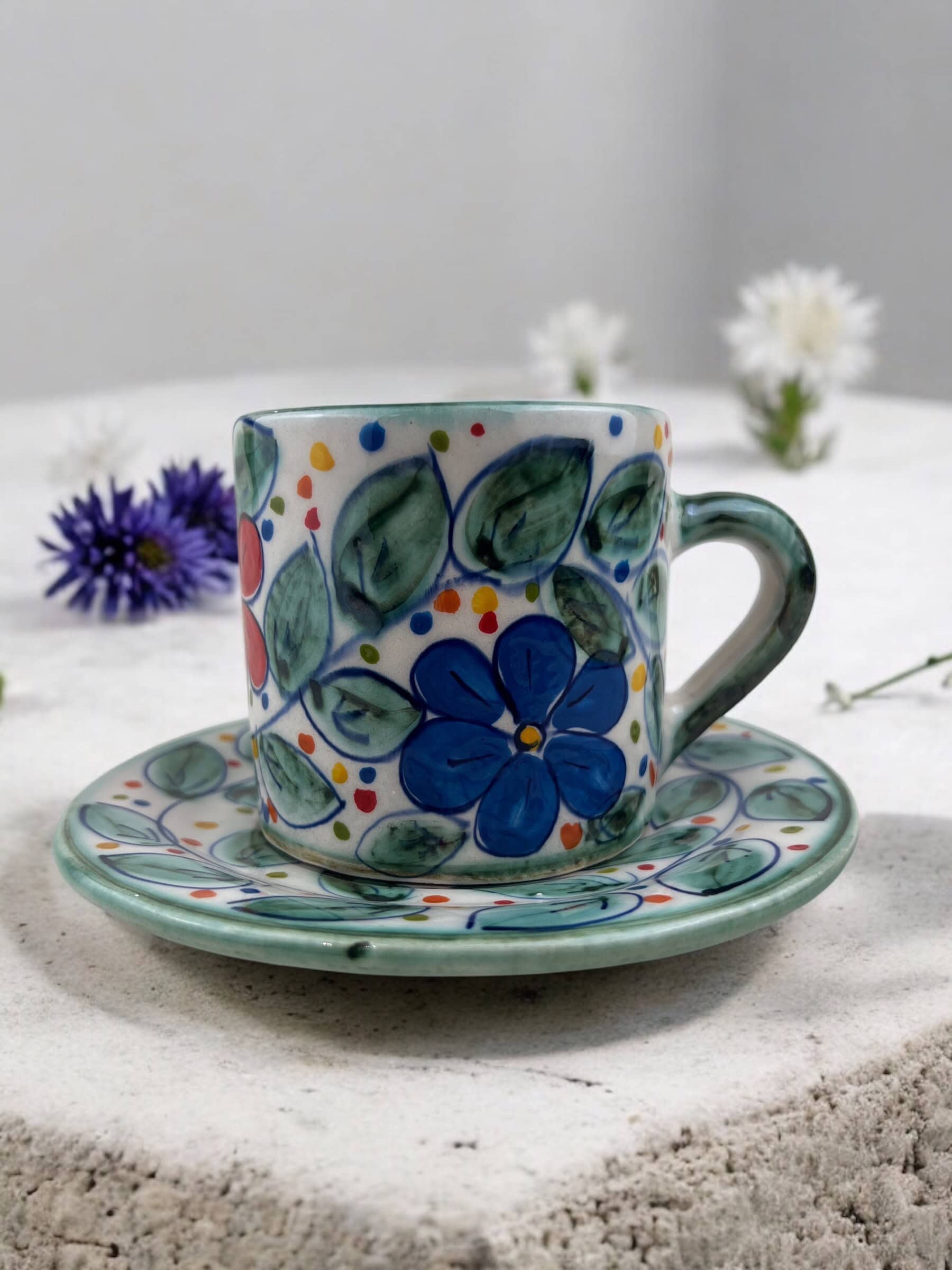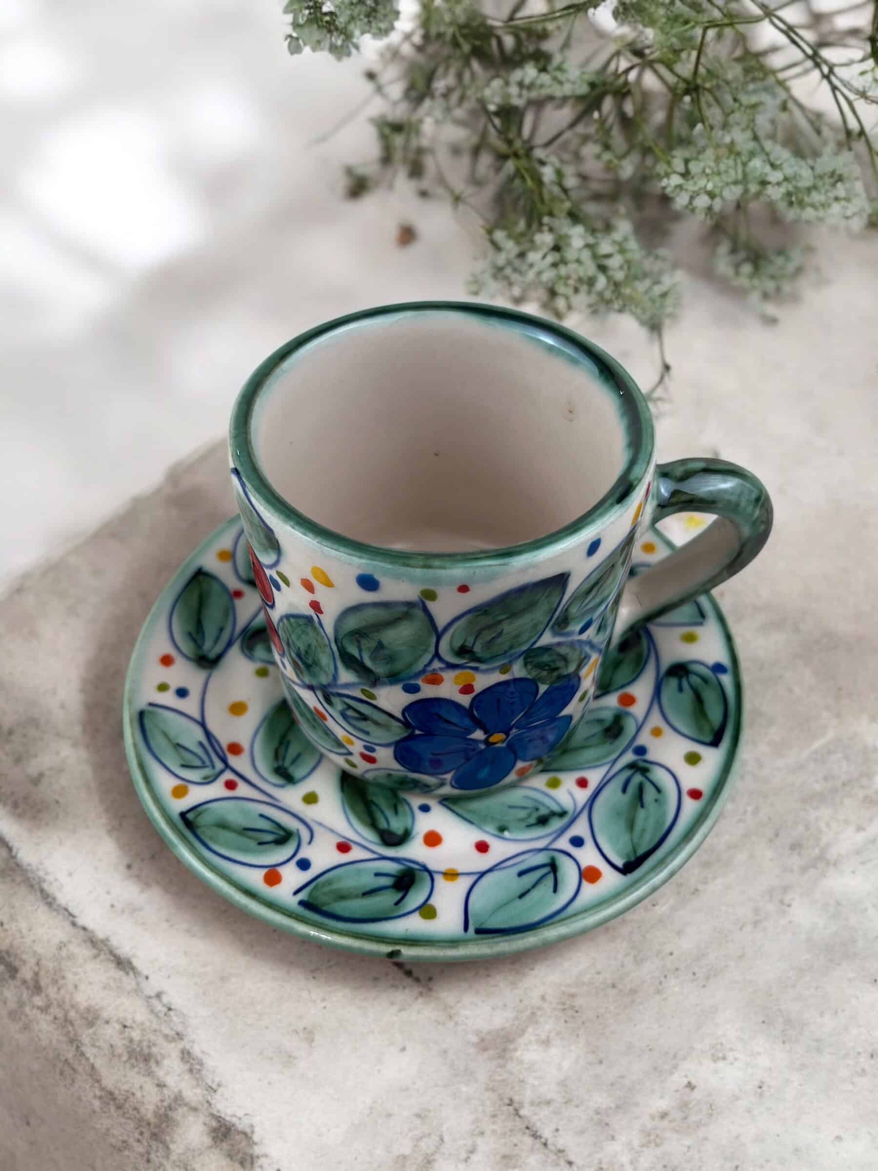 Taza y plato de cerámica hecha y pintada a mano por artesanos limeños. !Excelente para servir la bebida caliente que prefieras!