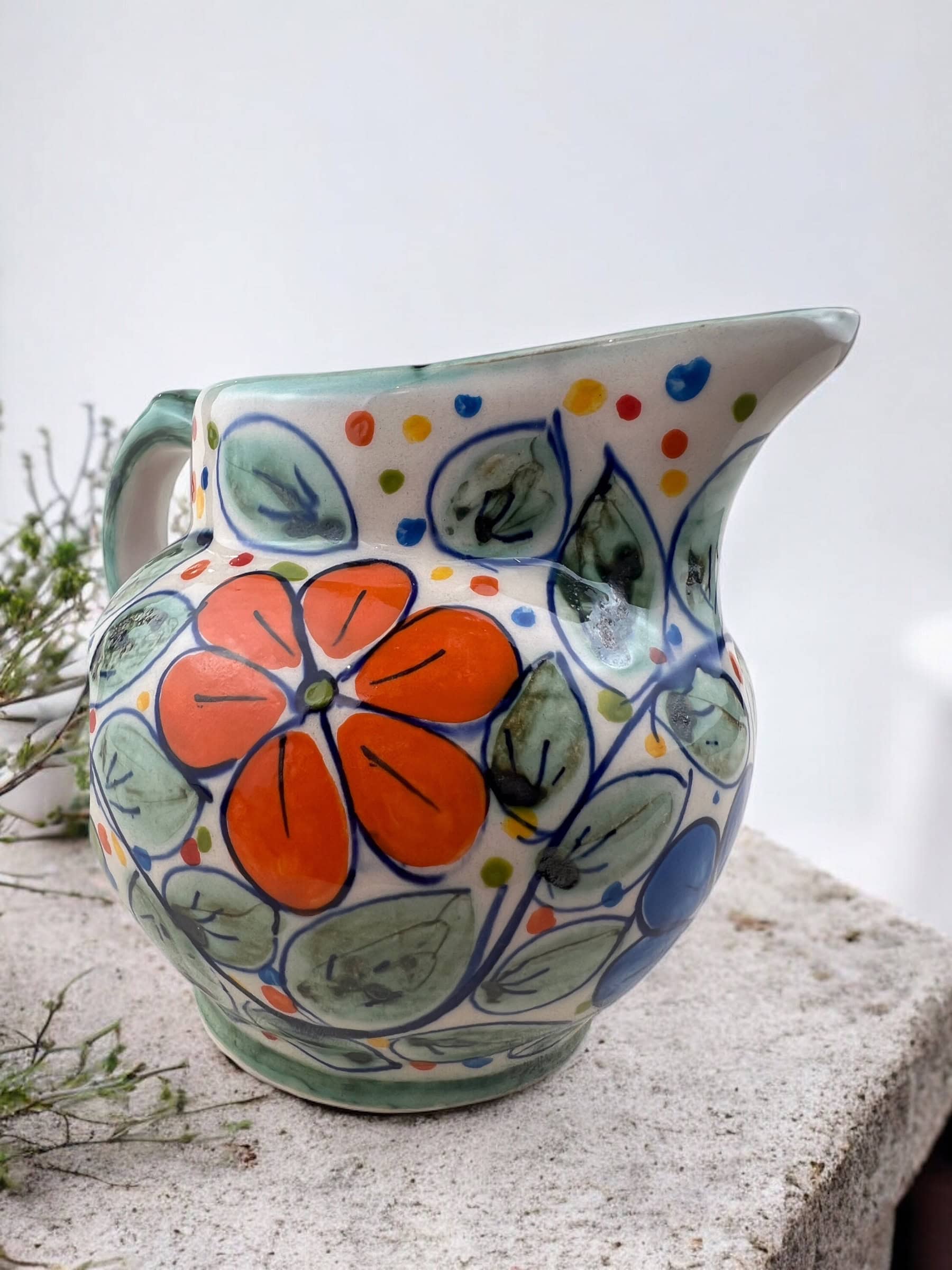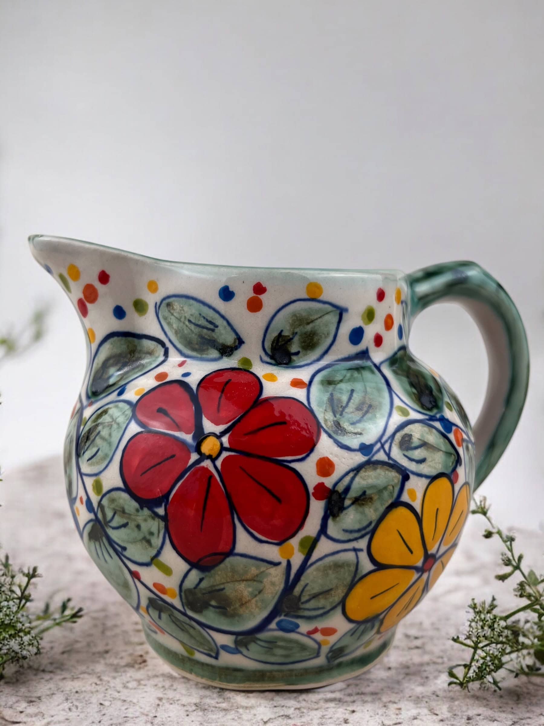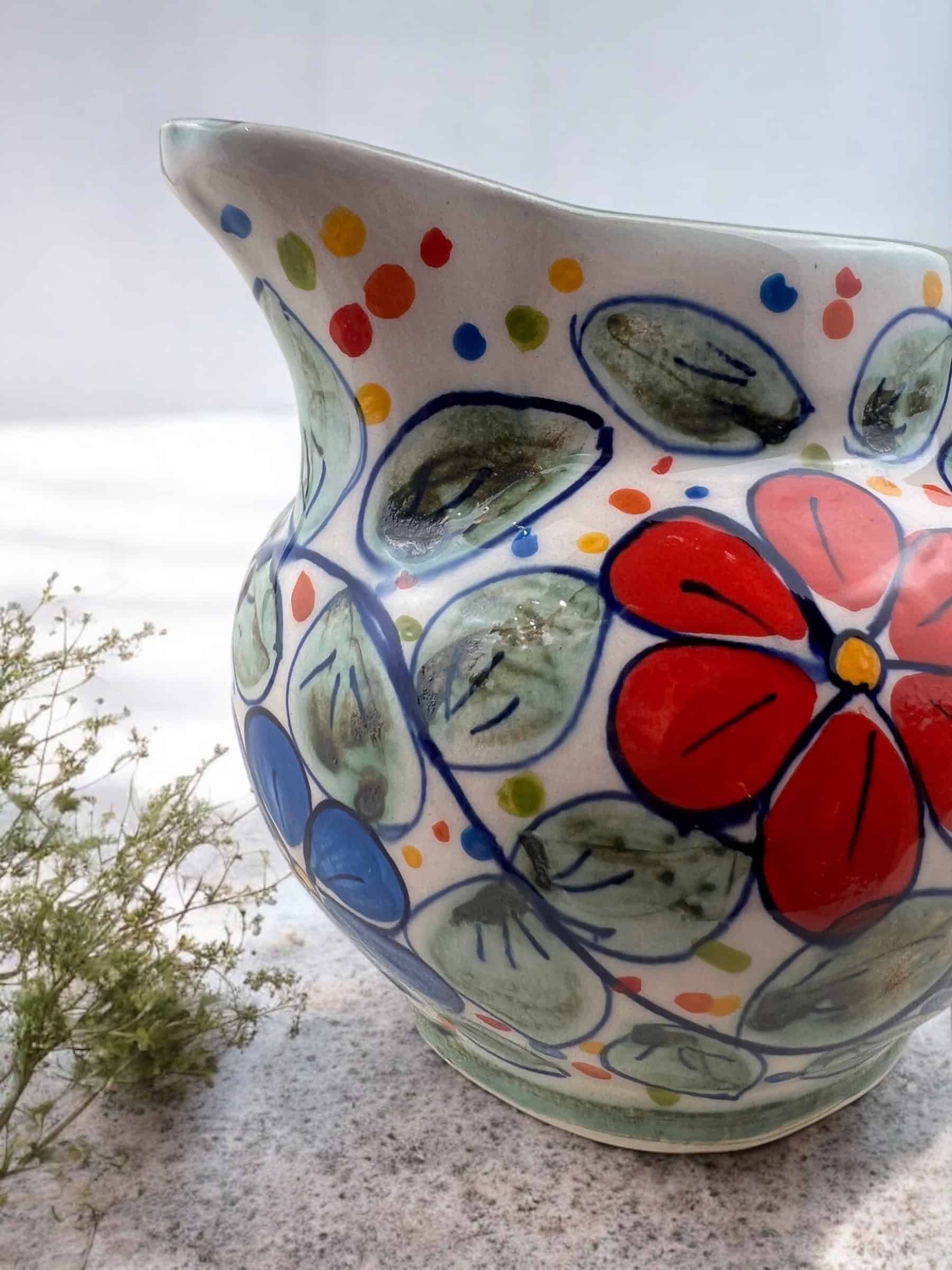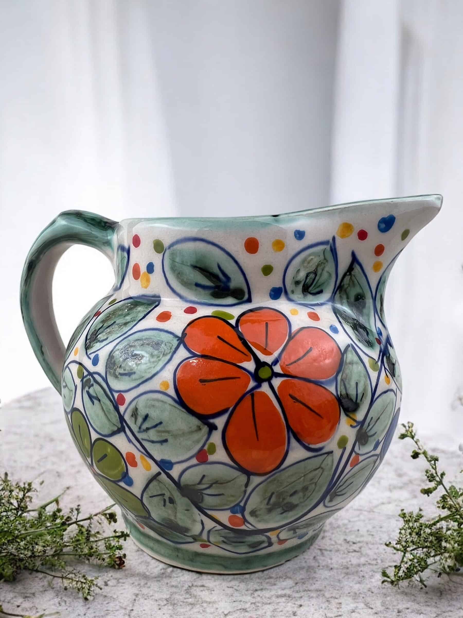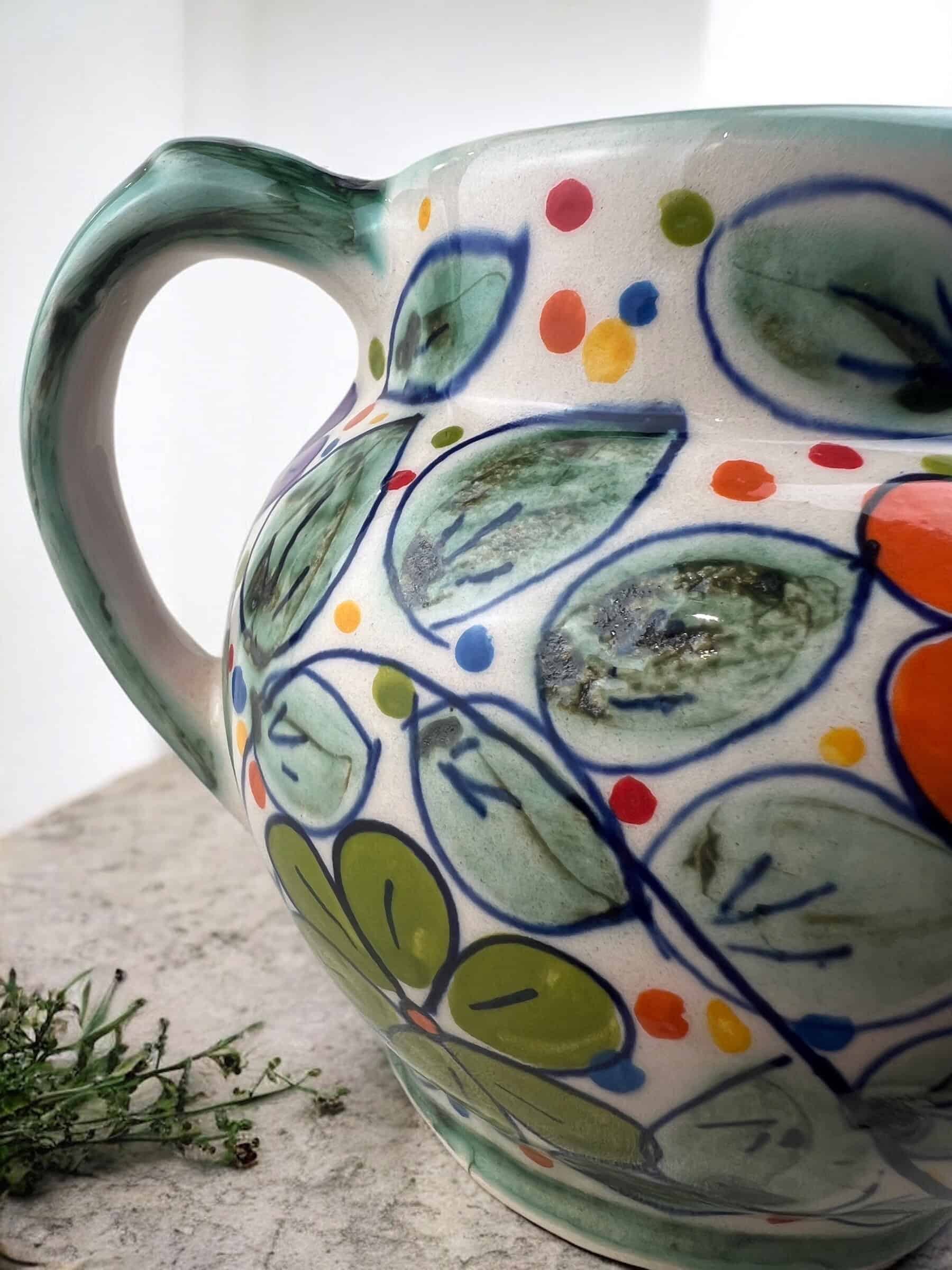Jarrita de cerámica con asa, hecha y pintada a mano por artesanos limeños. Cada pieza es única por su elaboración artesanal. Perfecta para leche en tus lonches, salsas para tus platillos o hasta como florerito para tus lindas flores.