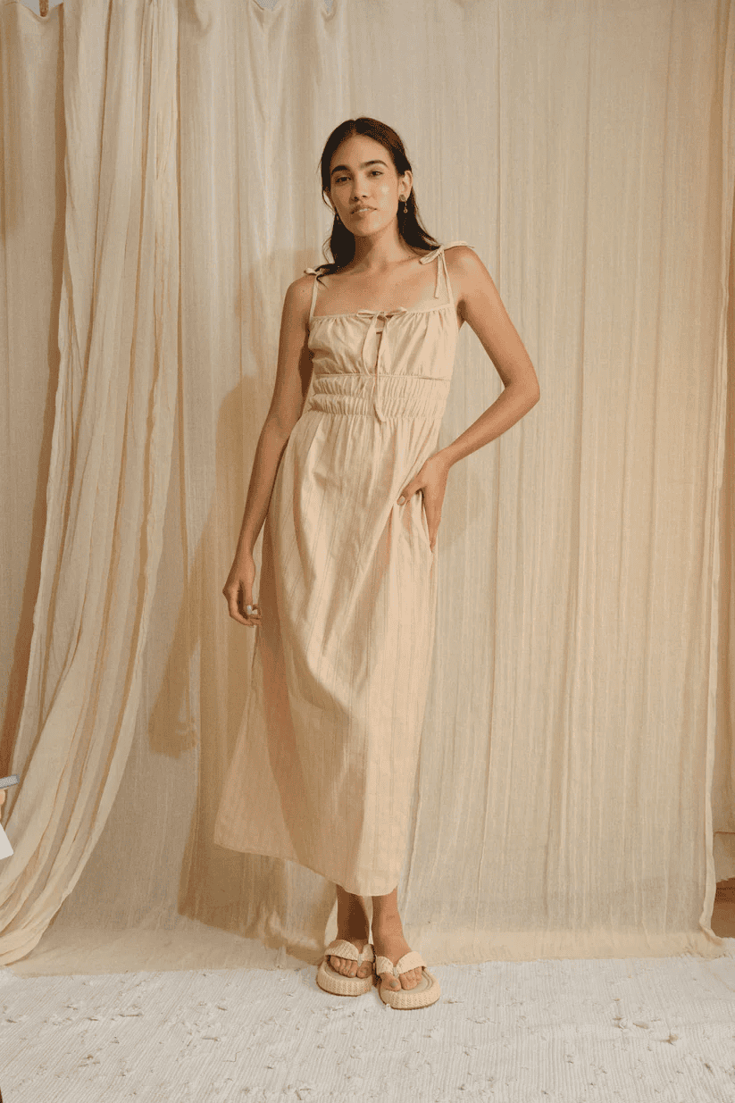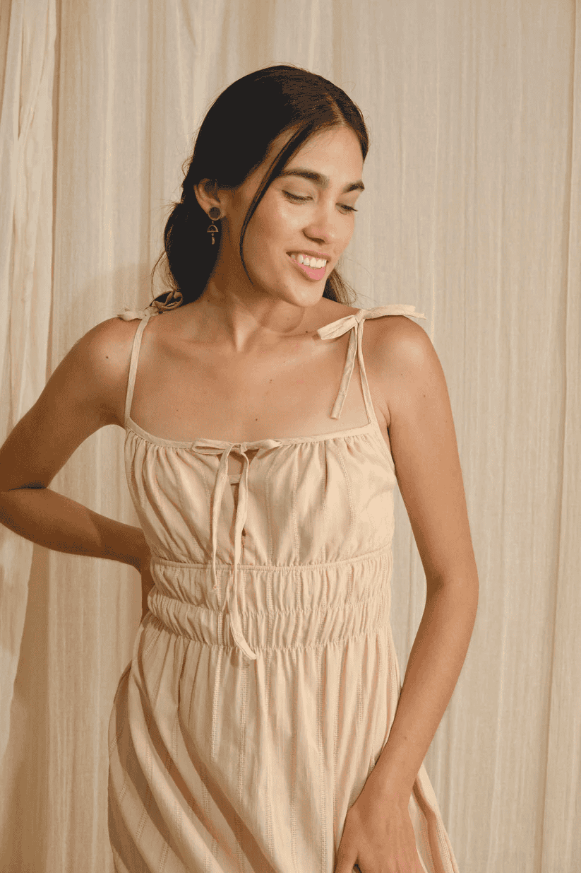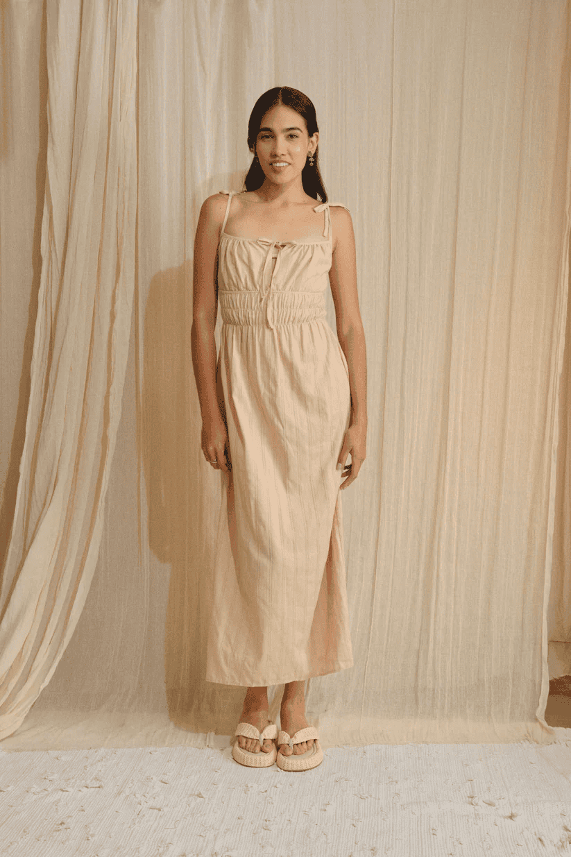 Vestido largo con tirantes que se amarran para un mejor ajuste, corte holgado y detalle de elástico en la parte de la cintura para un ajuste favorecedor. Este vestido es una prenda sencilla pero coqueta que gracias a su corte y su diseño, ofrece comodidad y versatilidad.