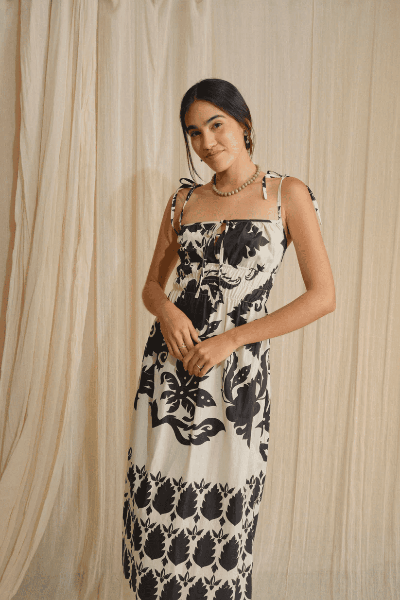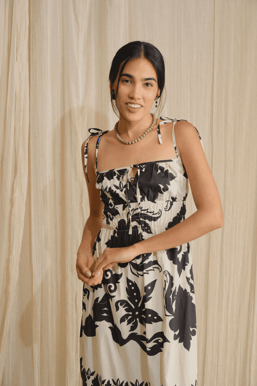 Vestido largo con tirantes que se amarran para un mejor ajuste, corte holgado y detalle de elástico en la parte de la cintura para un ajuste favorecedor. Este vestido es una prenda sencilla pero coqueta que gracias a su corte y su diseño, ofrece comodidad y versatilidad.