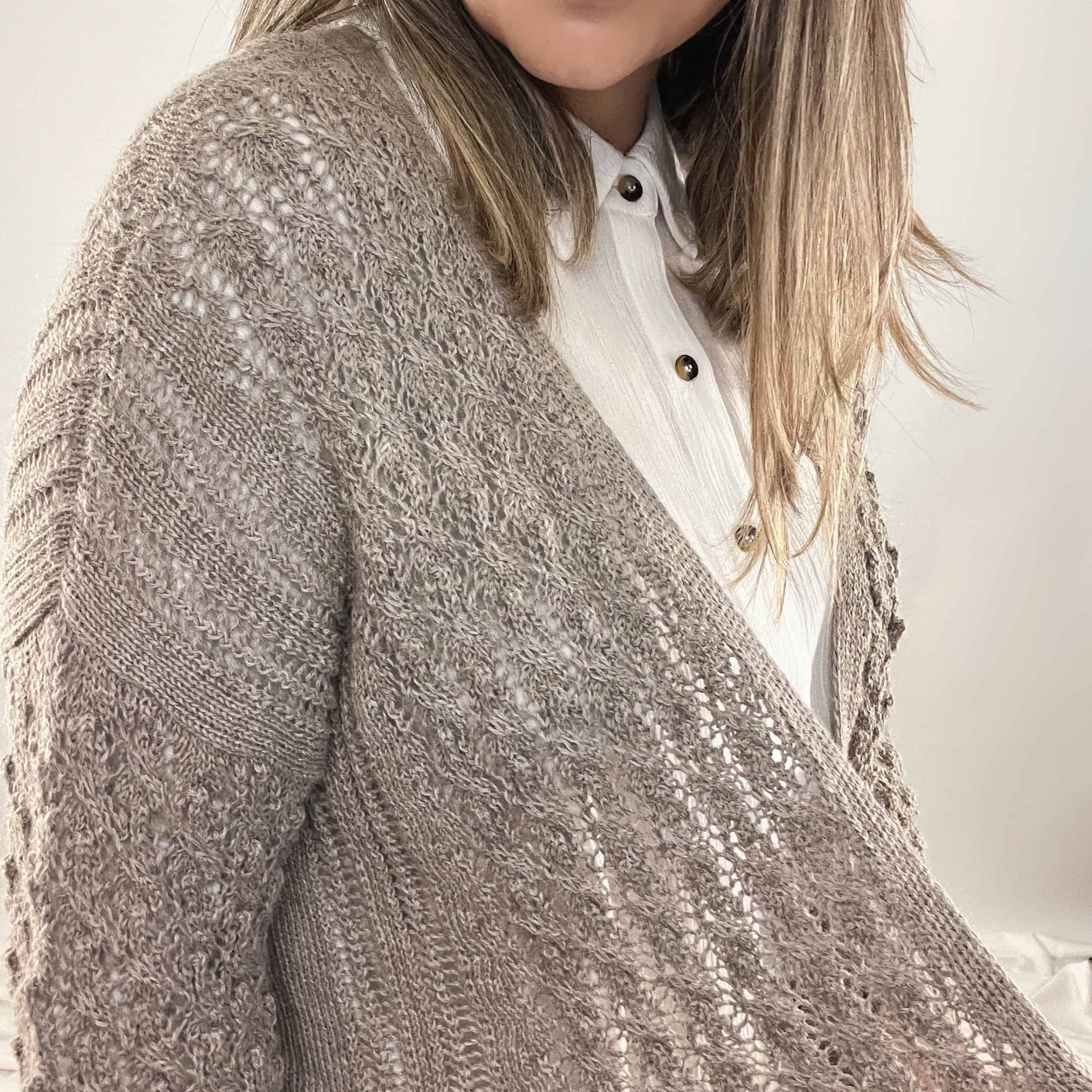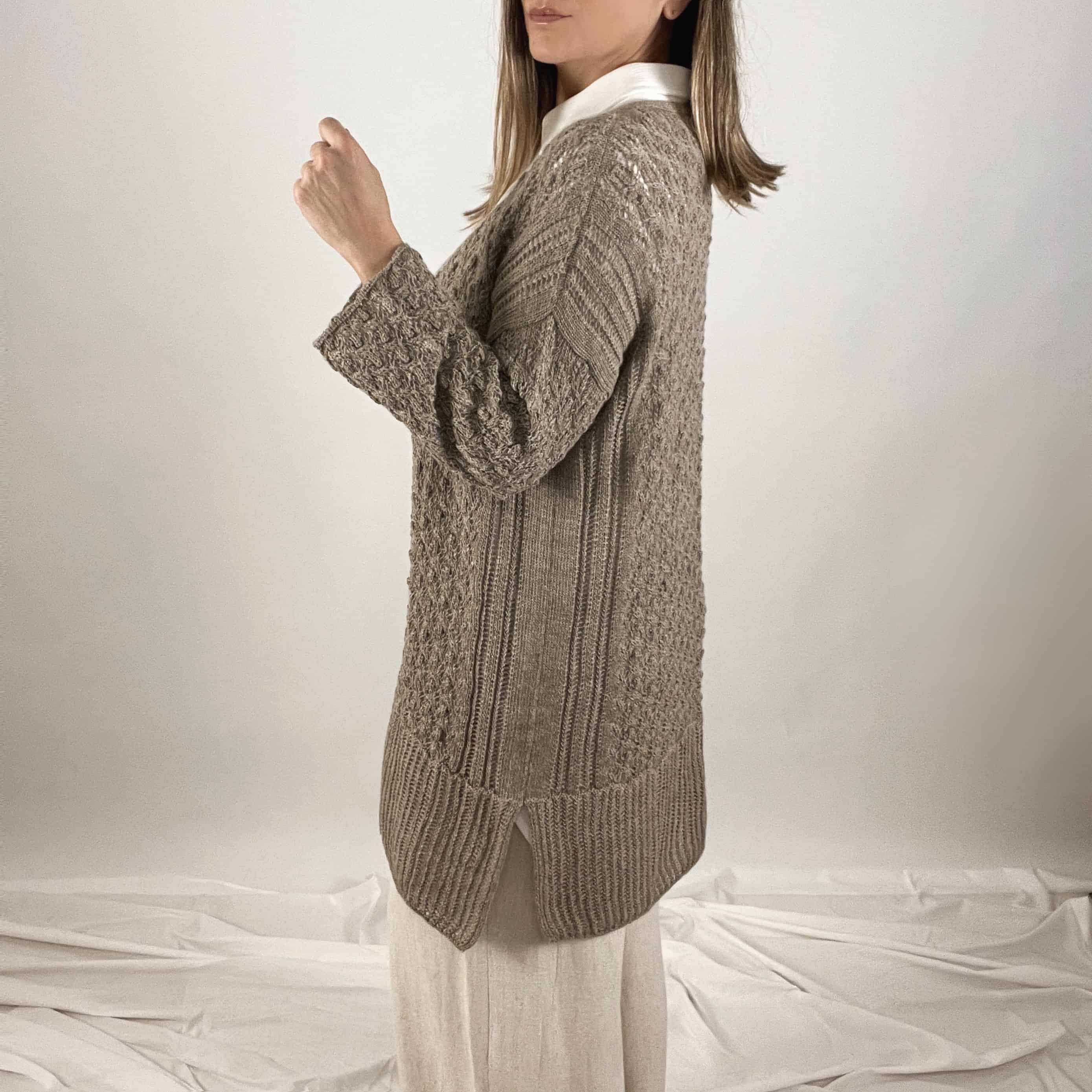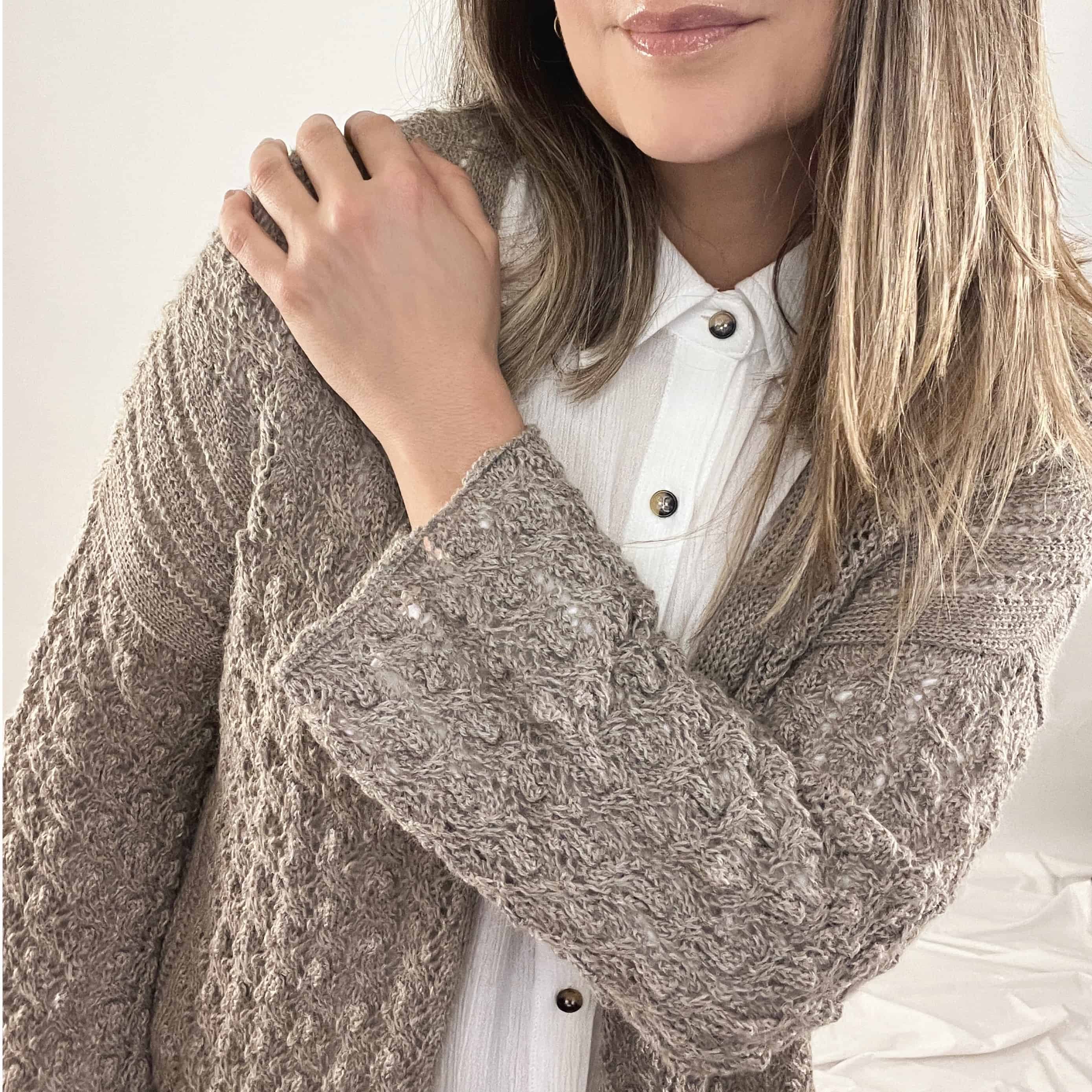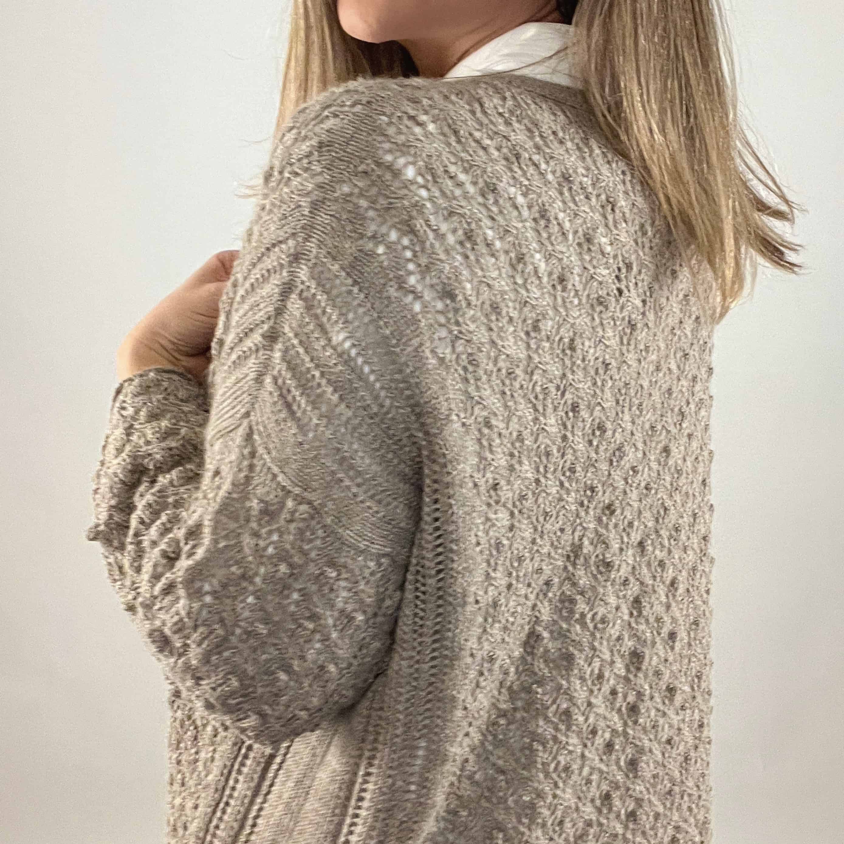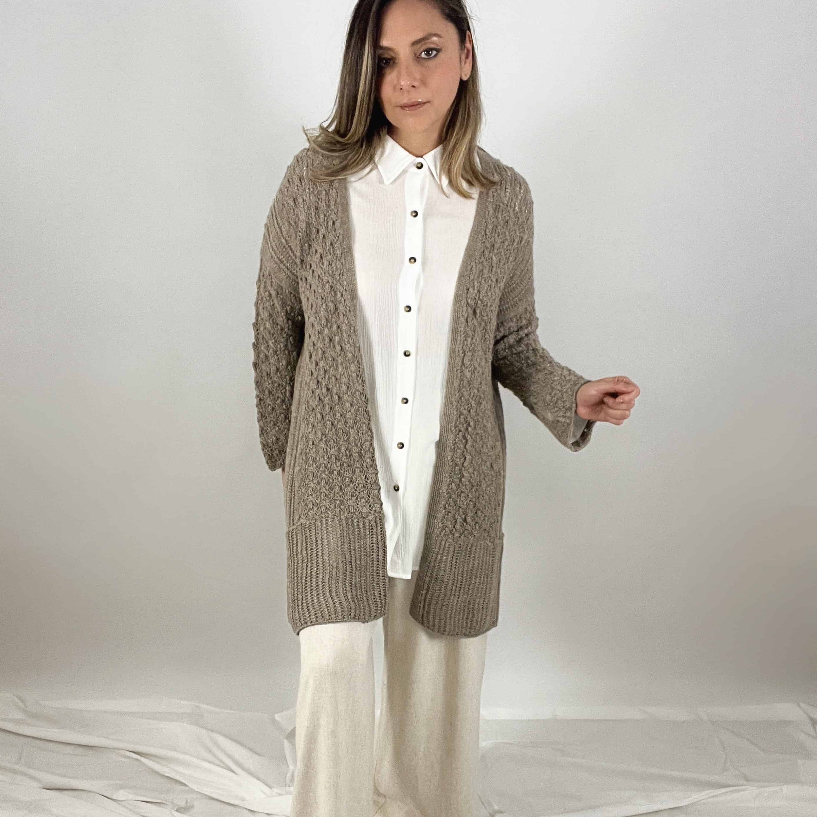 Cardigan de baby alpaca, con puntos calados, cómodo, con caída suave y versátil. Hecho por artesanos peruanos.