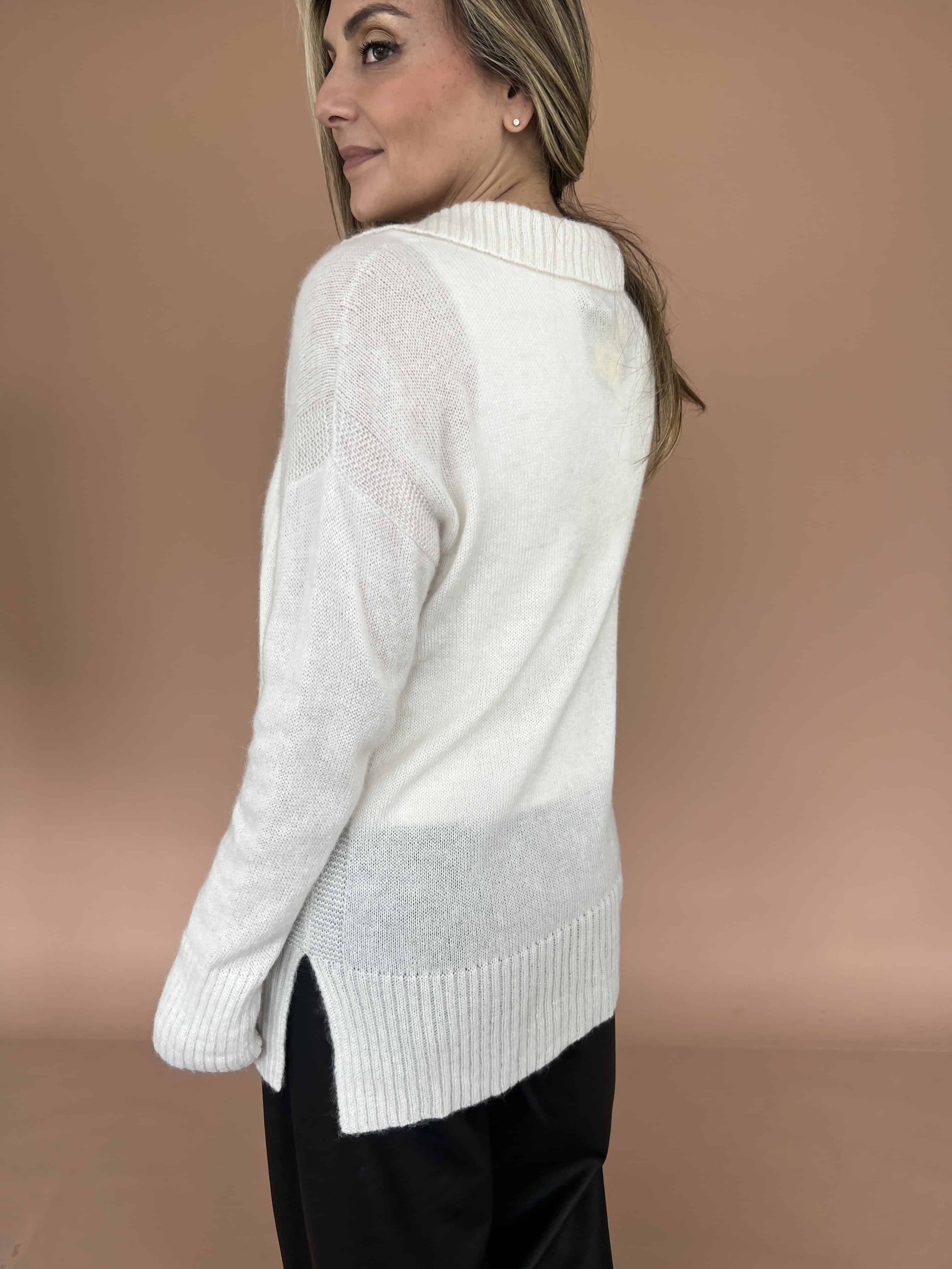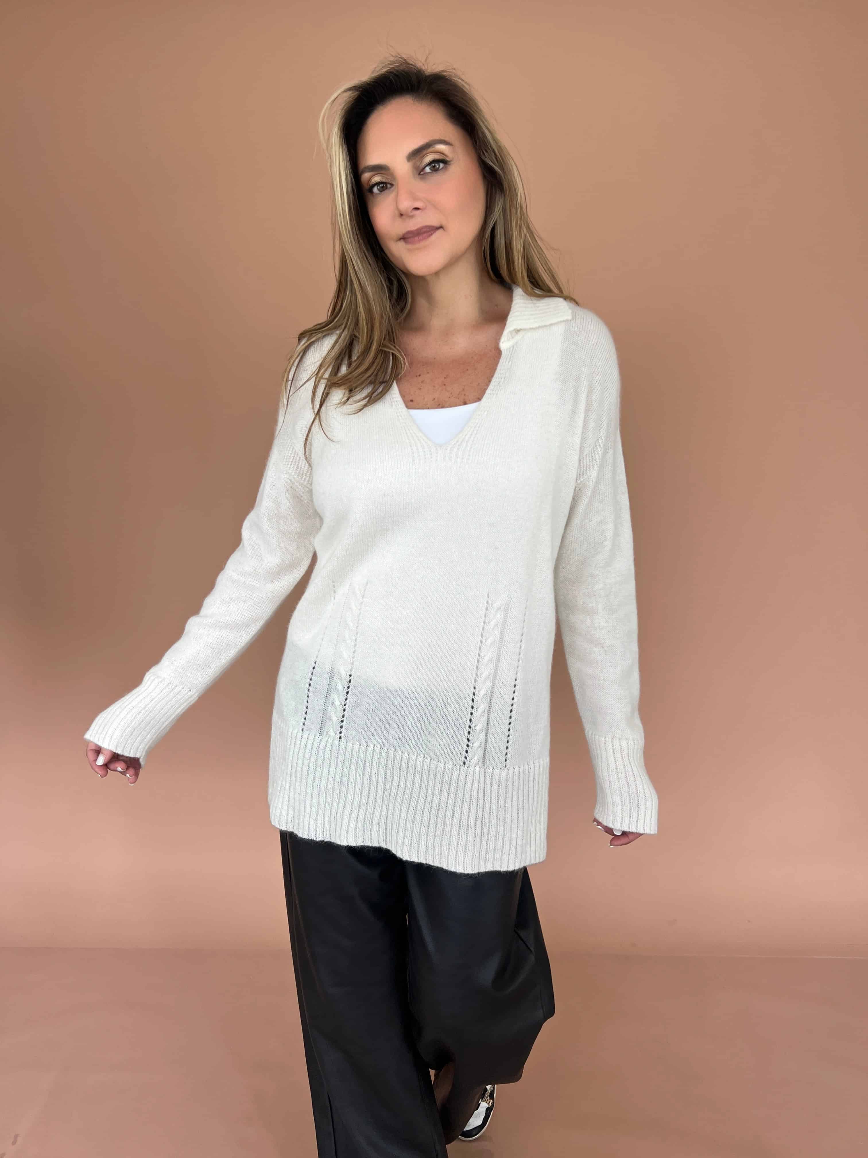 Sweater de baby alpaca con cuello camisero oversize un estilo único.