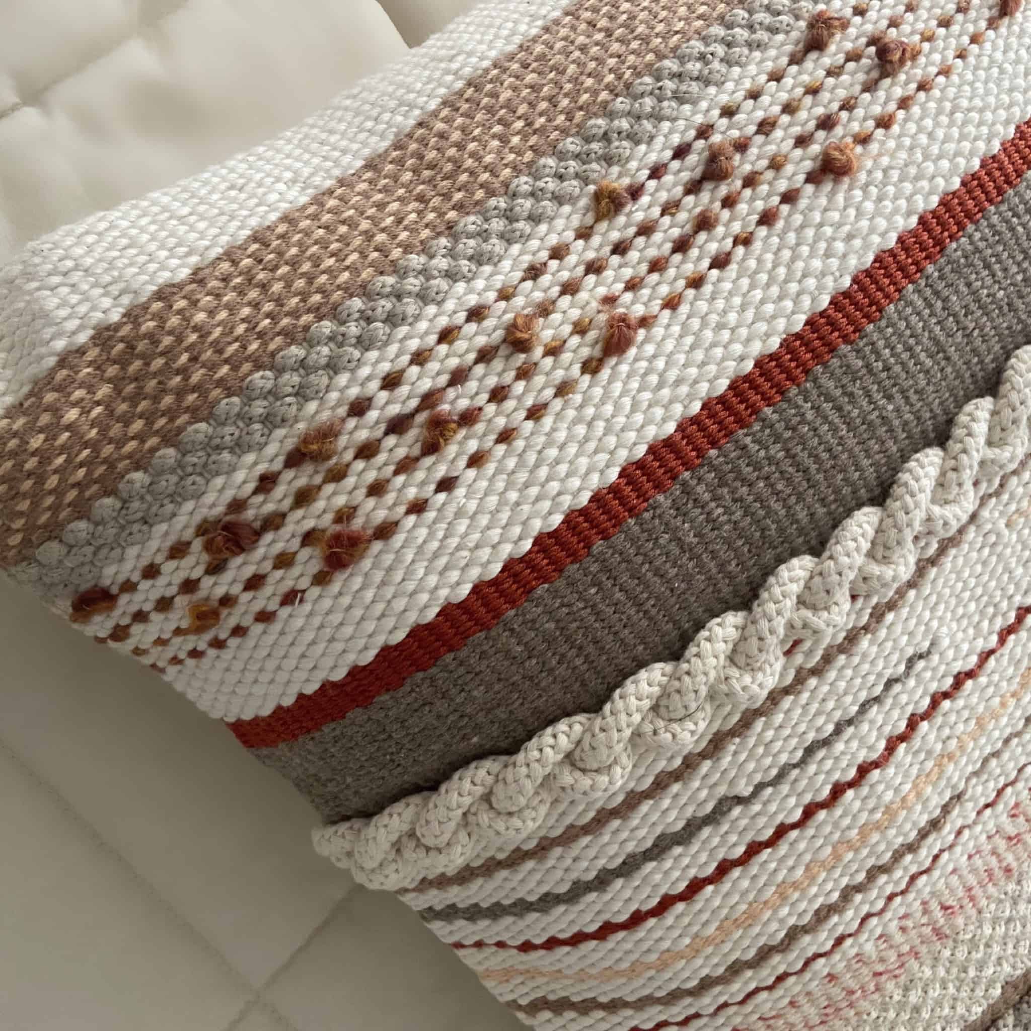 Cojín tejido a mano en telar, que combina distintos puntos. Trabajado principalmente con fibras de algodón de distintos espesores y otros materiales que permiten lograr texturas especiales.