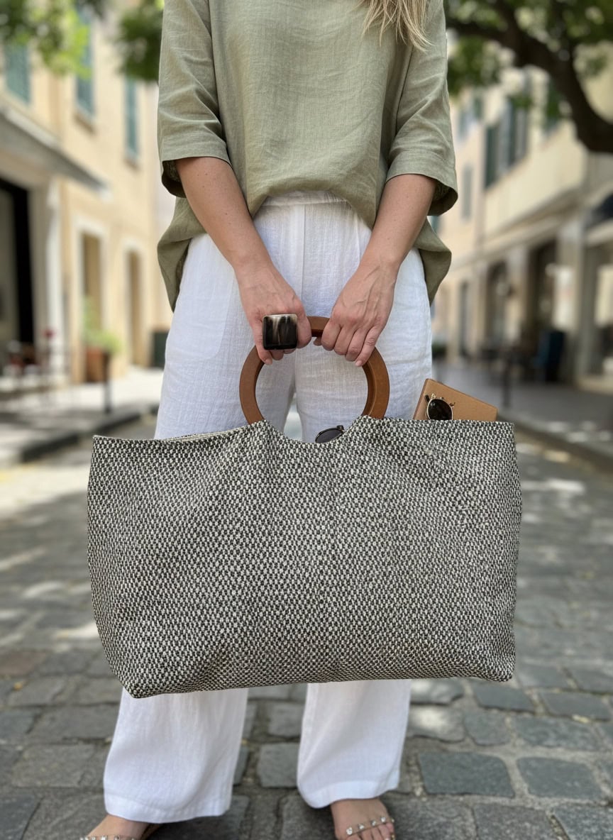 Maxibolso en algodón de textura suave, con asa circular de madera que aporta un toque sofisticado y moderno. Su diseño amplio lo hace práctico y cómodo para uso diario.