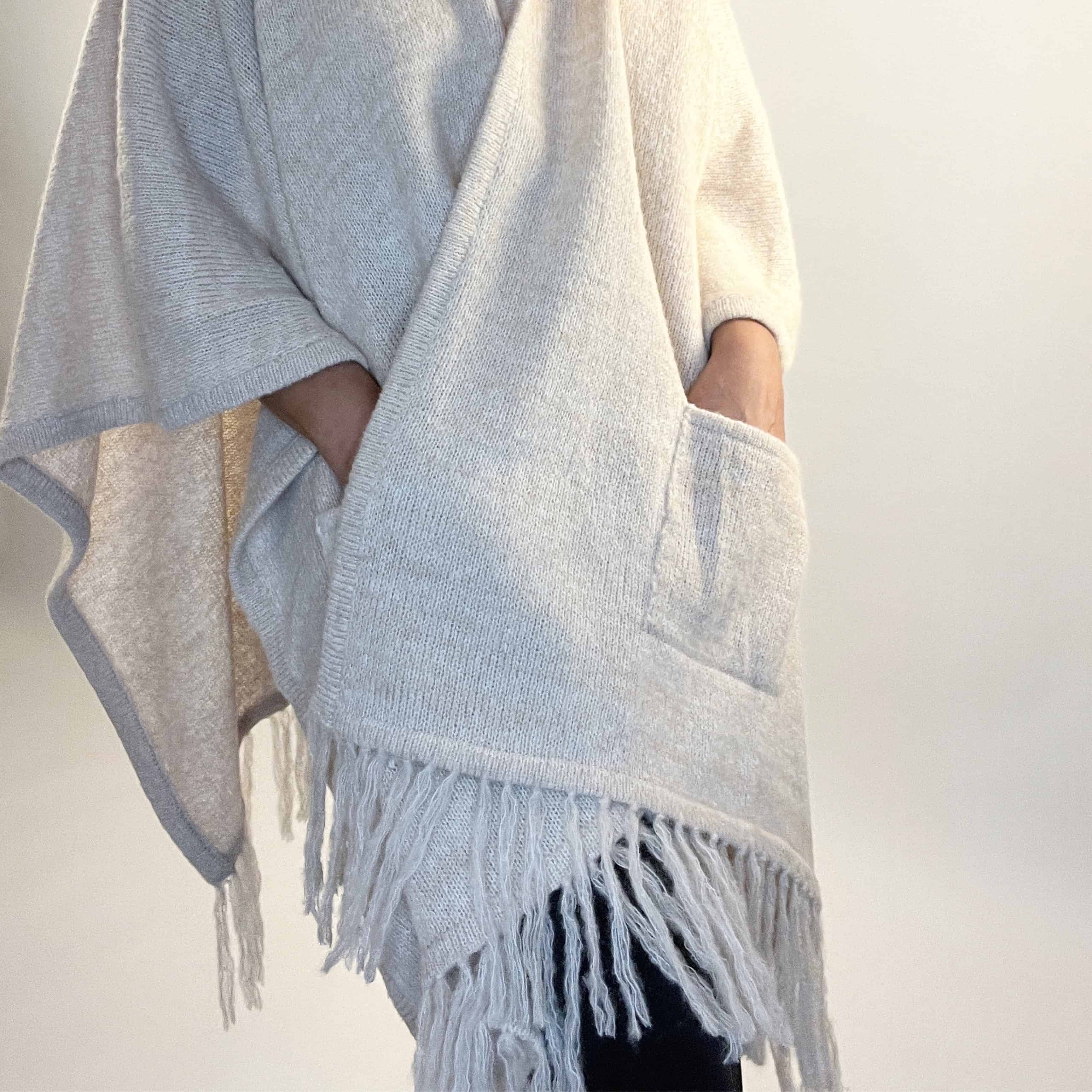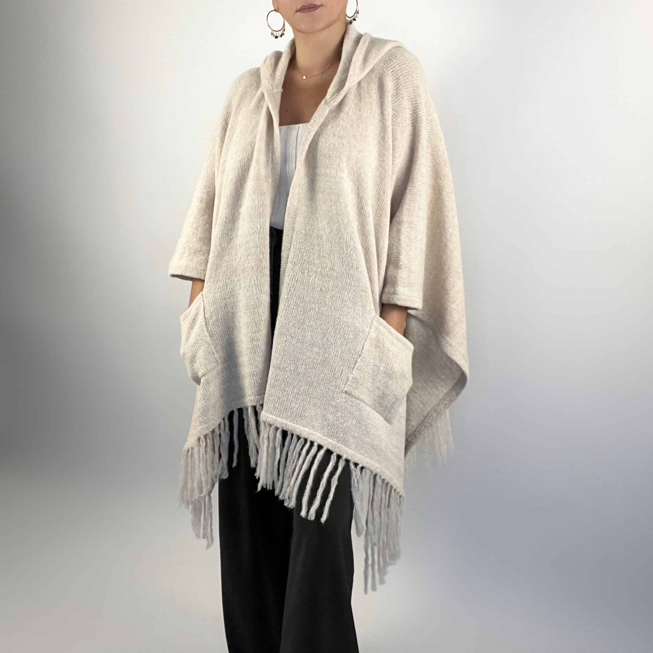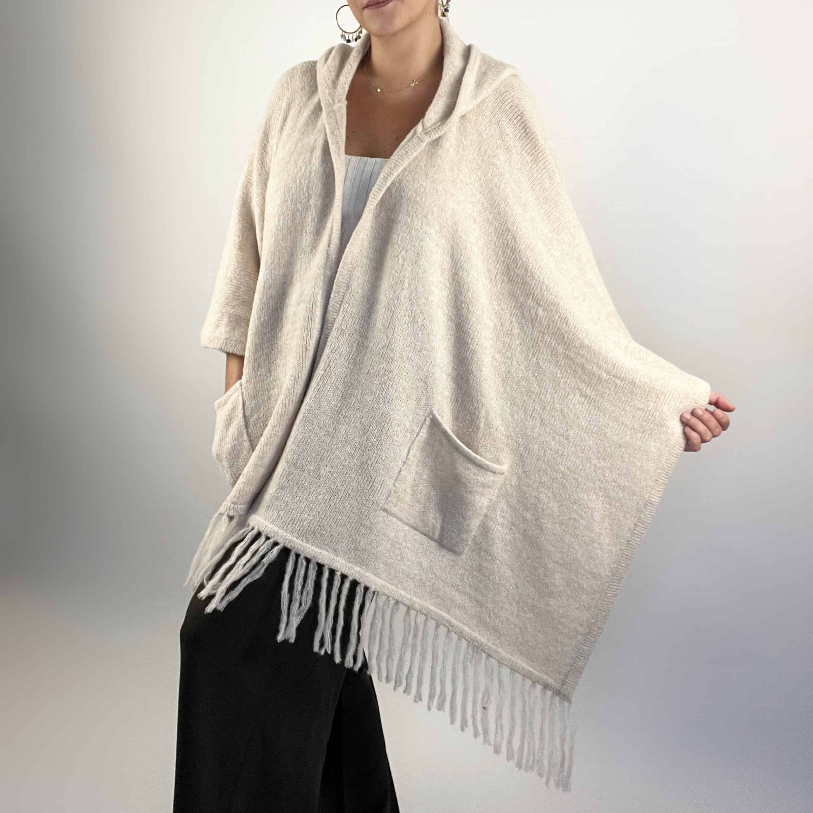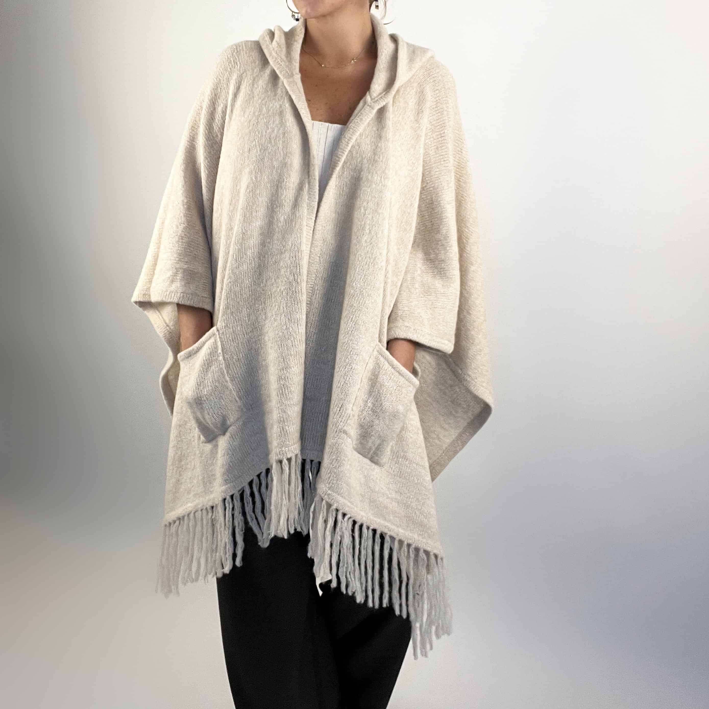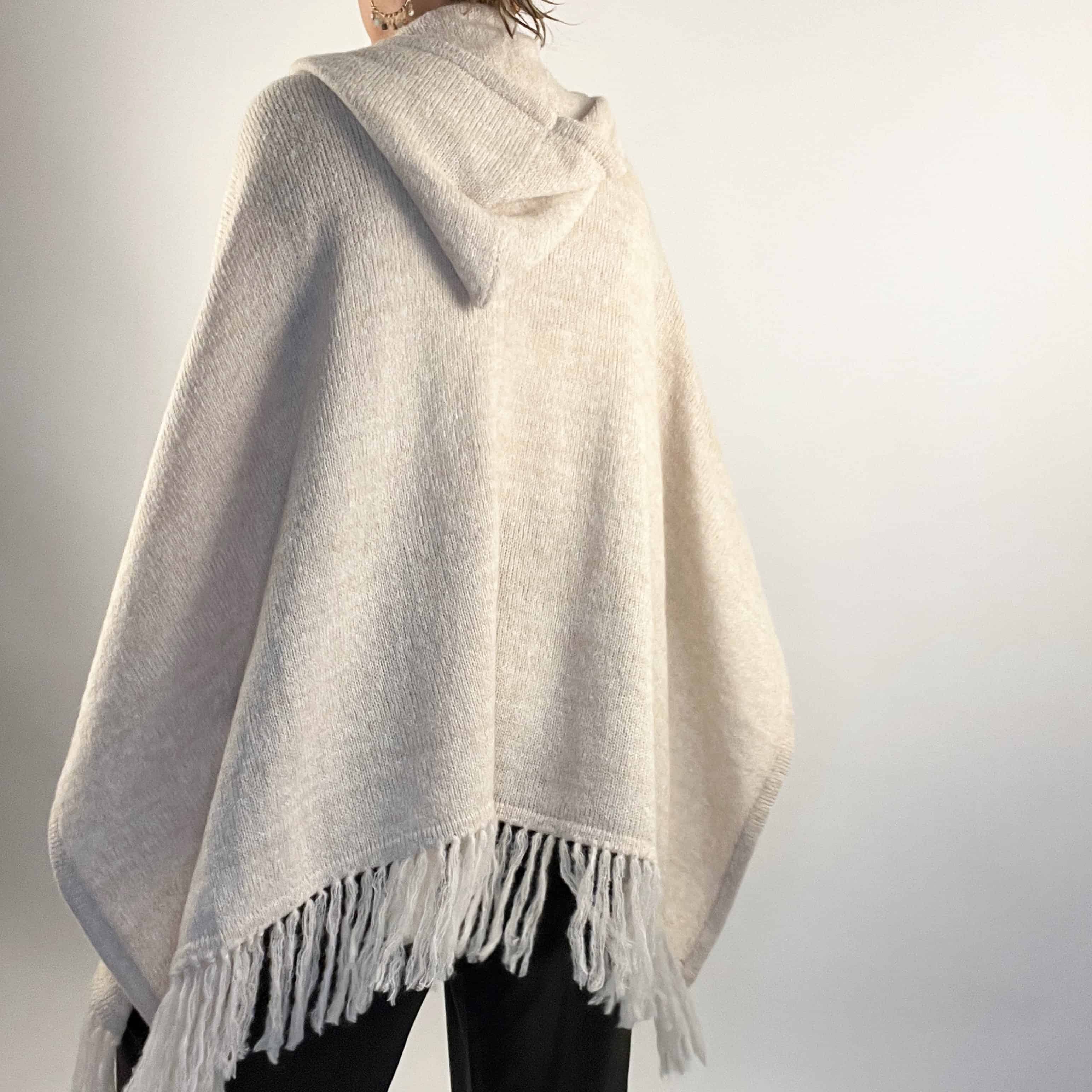 Ruana con flecos y capucha, hecha a mano en 100% alpaca por artesanos del Perú.