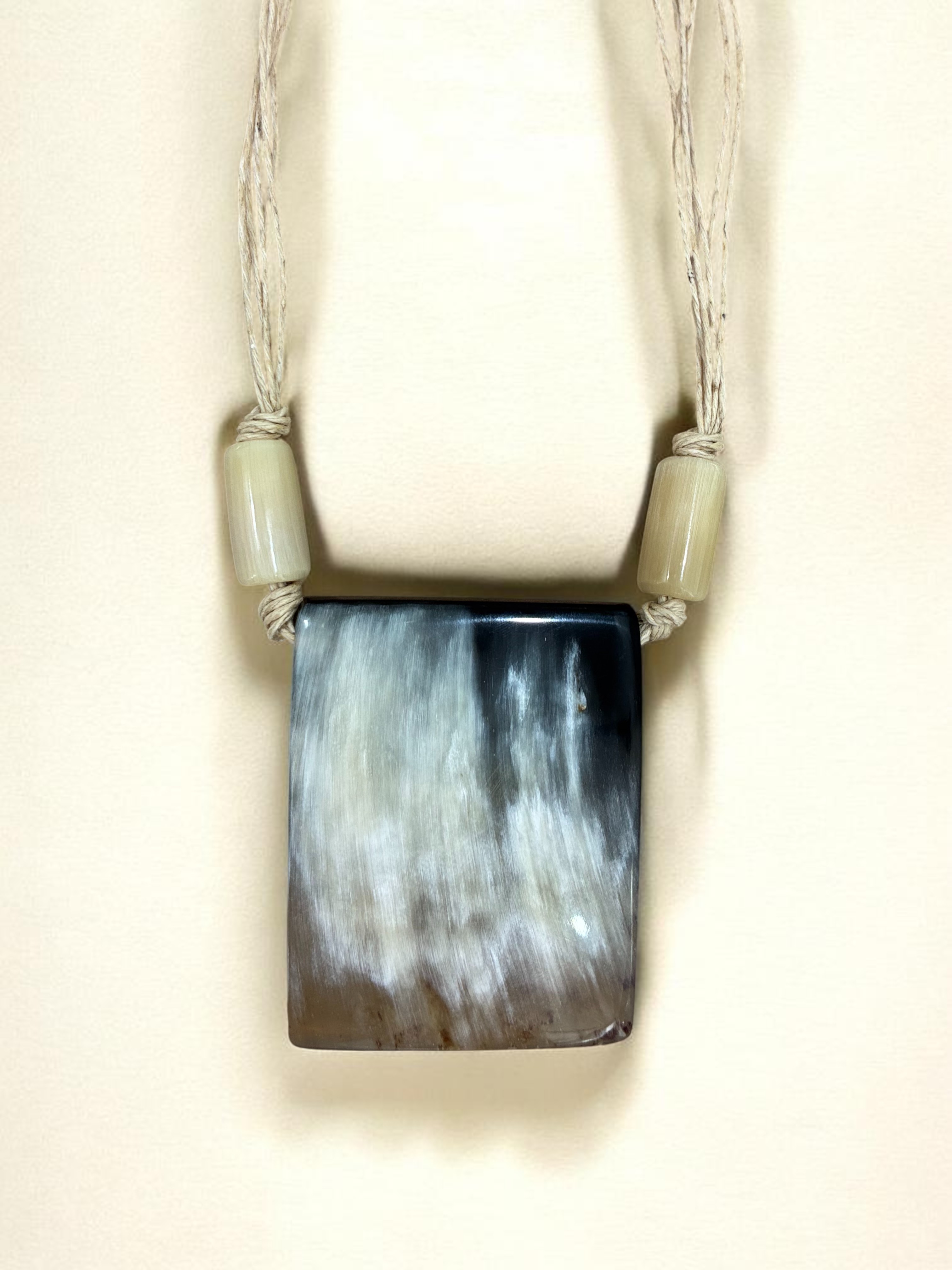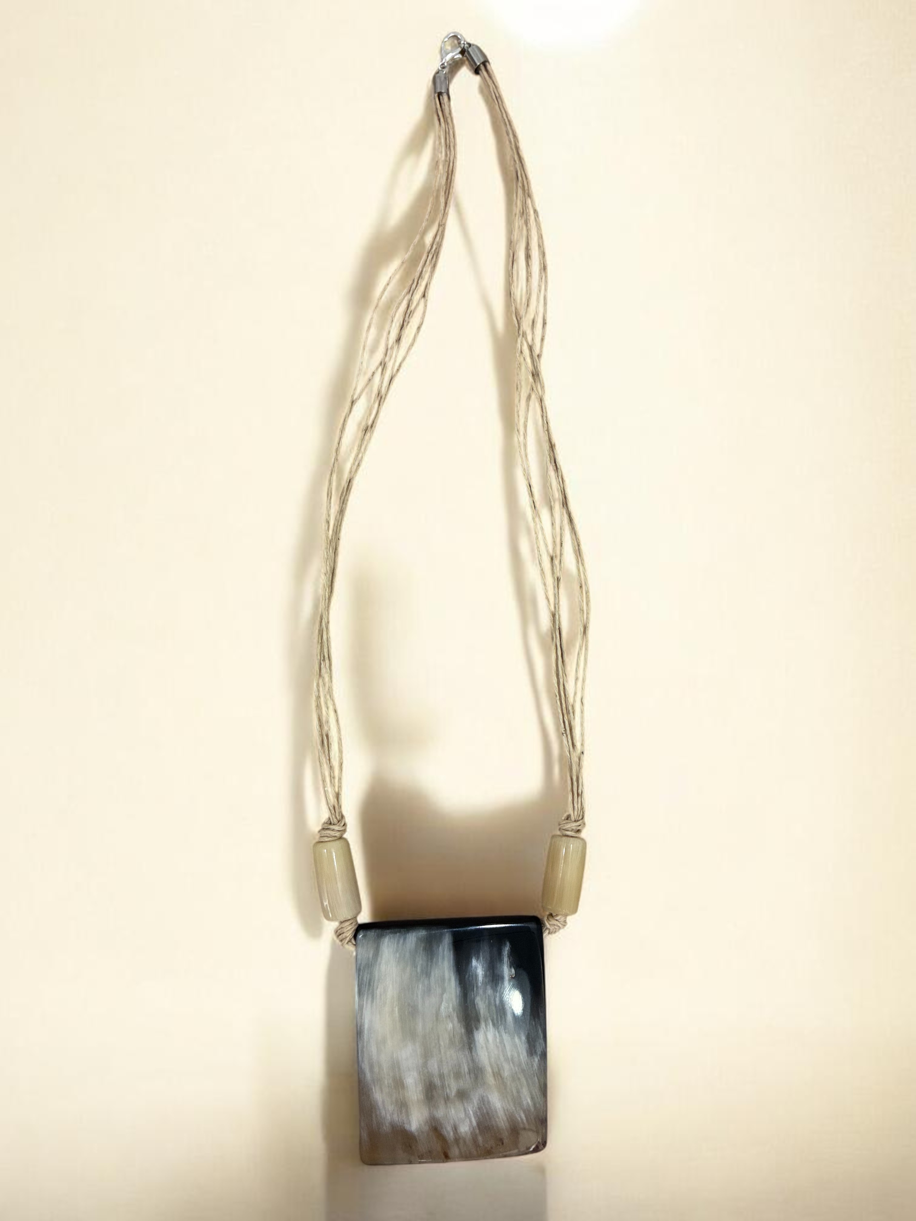 Collar largo hecho a mano en cacho de toro reciclado. La belleza del material y el trabajo fino artesanal dan como resultado una pieza única y sostenible.