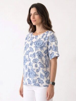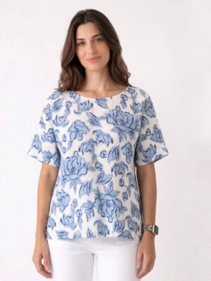 Blusa Crop en tela rayón con efecto corrugado. Es corta y de silueta holgada, con una pinza trasera para darle mejor caída. De cuello camisa y botones de nácar.