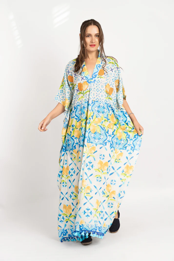 Diseño, confección y tela italiana. Kaftán largo con estampado y cuello en V. Su silueta amplia y fluida brinda frescura y comodidad, ideal para días de playa o para un look relajado y veraniego. Detalles decorativos en el borde añaden un toque artesanal y distintivo.