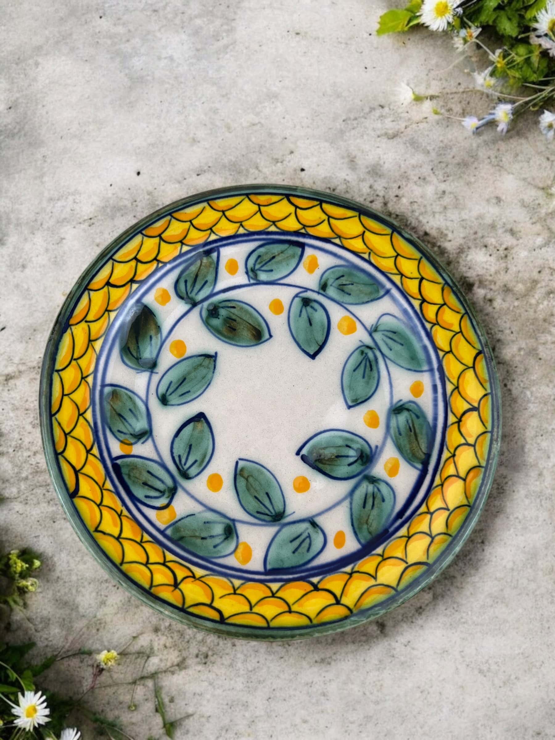 Taza y plato de cerámica hecha y pintada a mano por artesanos limeños. !Excelente para servir la bebida caliente que prefieras!