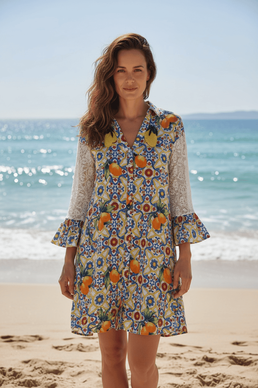 Diseño, confección y tela italiana. Vestido camisero con cuello en V y cierre de botones al frente. Presenta delicadas aplicaciones de encaje en las mangas que aportan un toque femenino y distintivo.