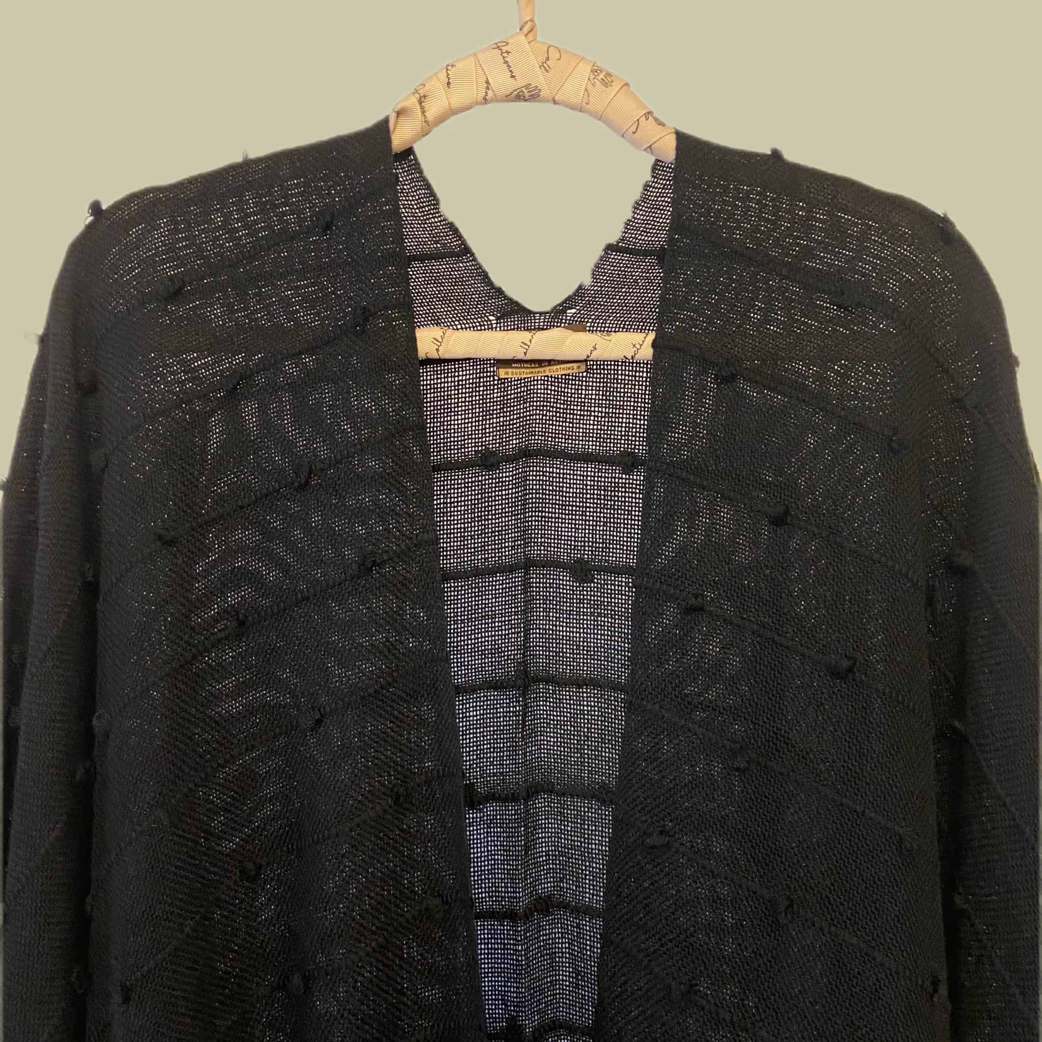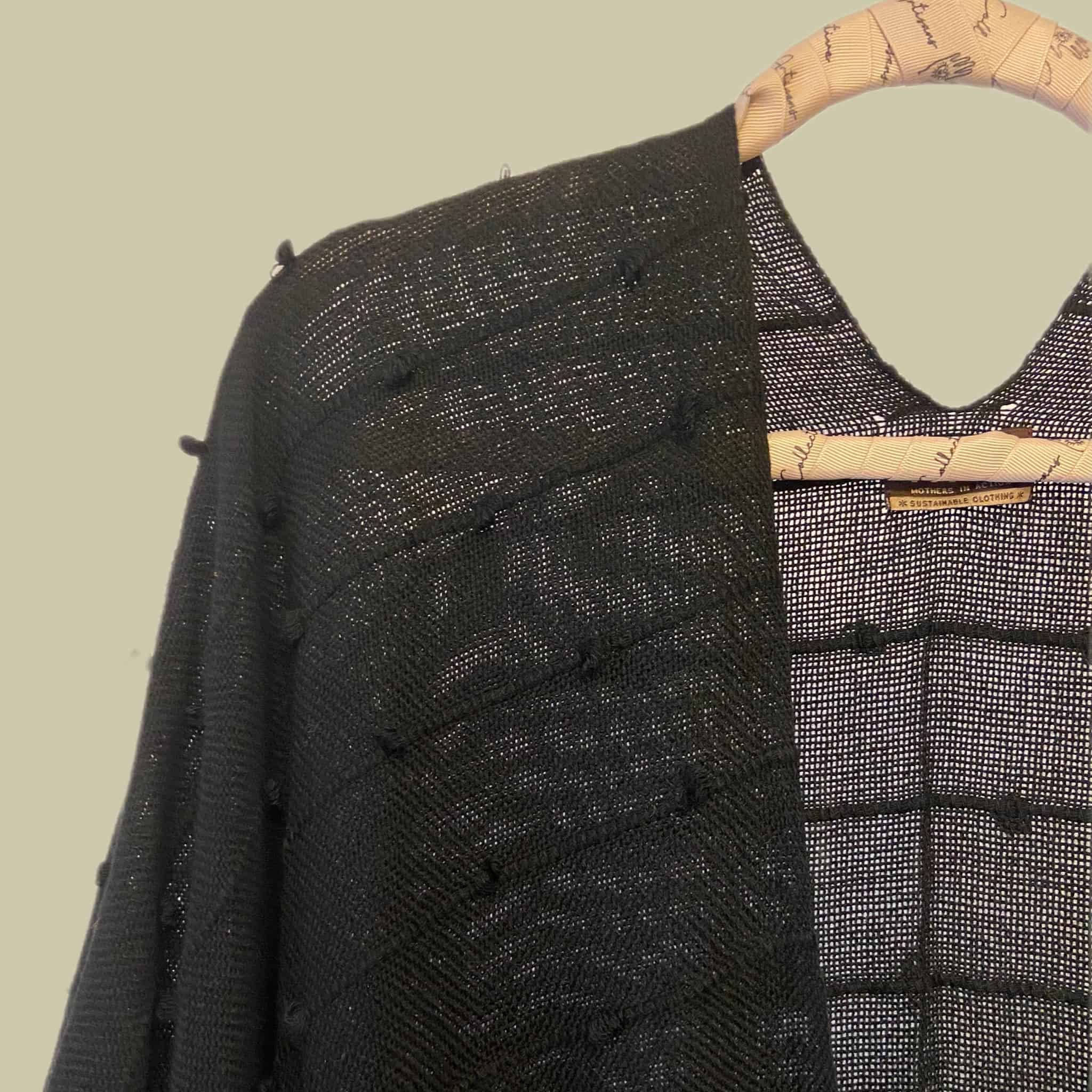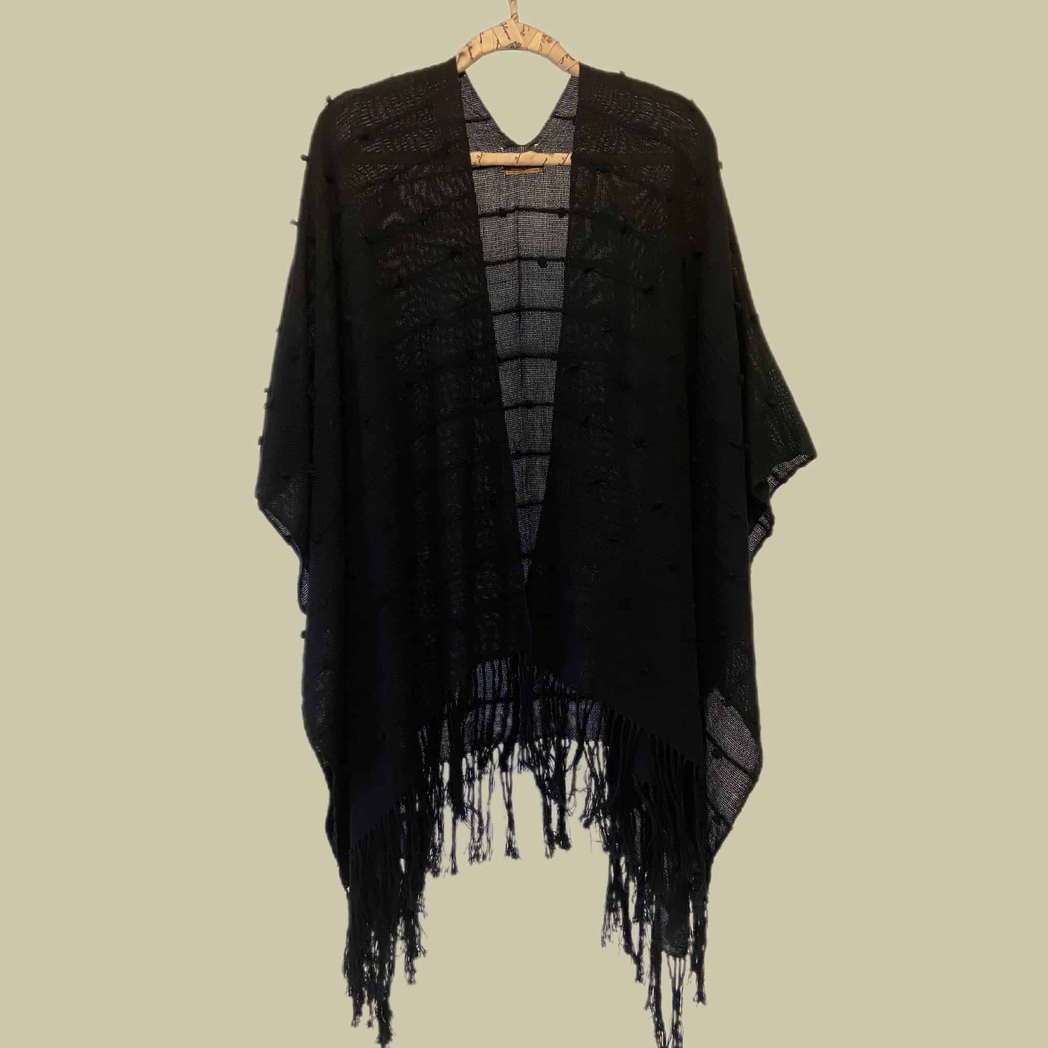 Ruana de algodón orgánico hecho en telar con líneas, puntos y flecos