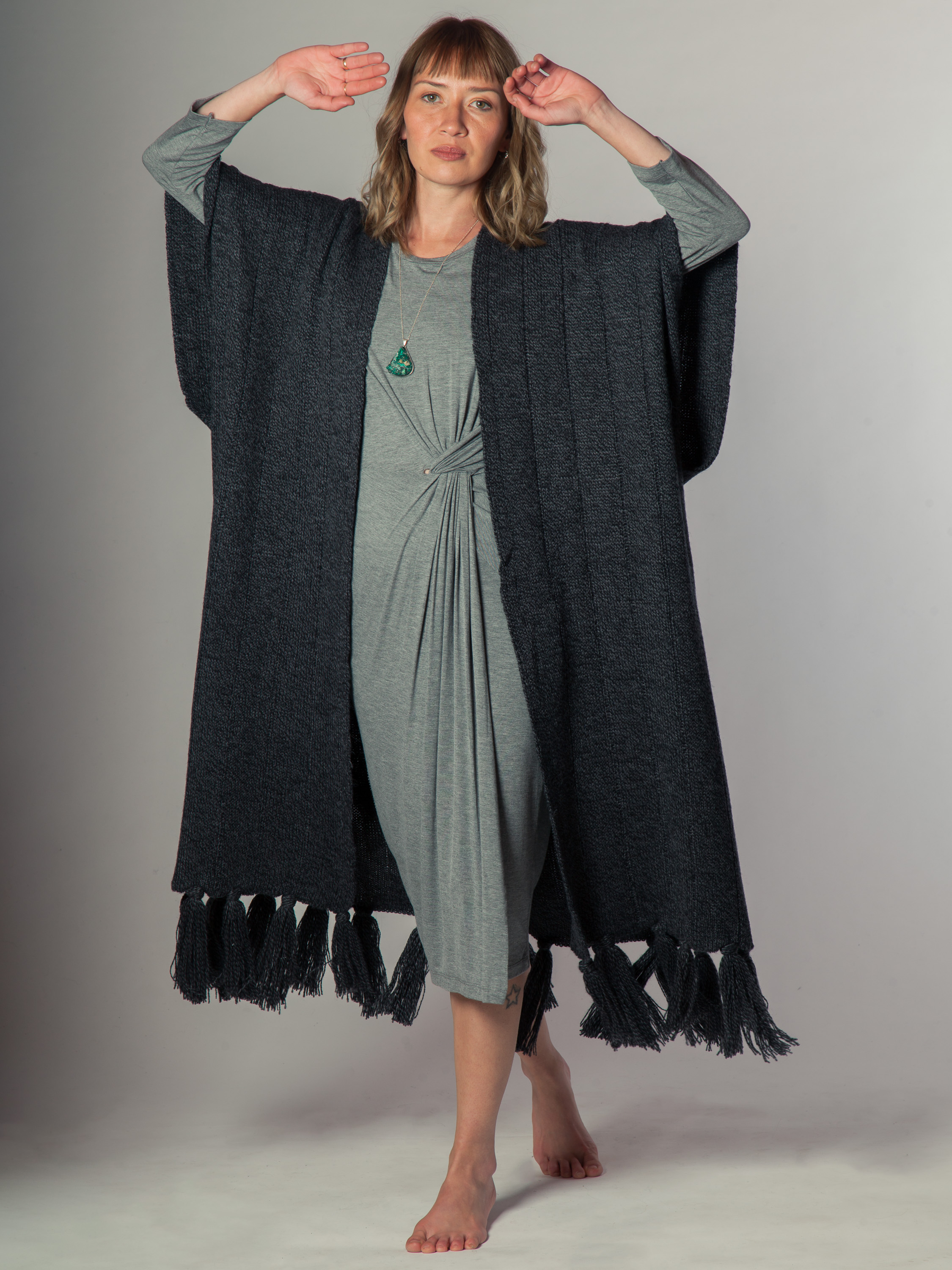 Entre ruana y abrigo, esta pieza tejida en intarcia, es un diseño innovador y funcional. Clásico y contemporáneo al mismo tiempo, ideal para climas fríos.