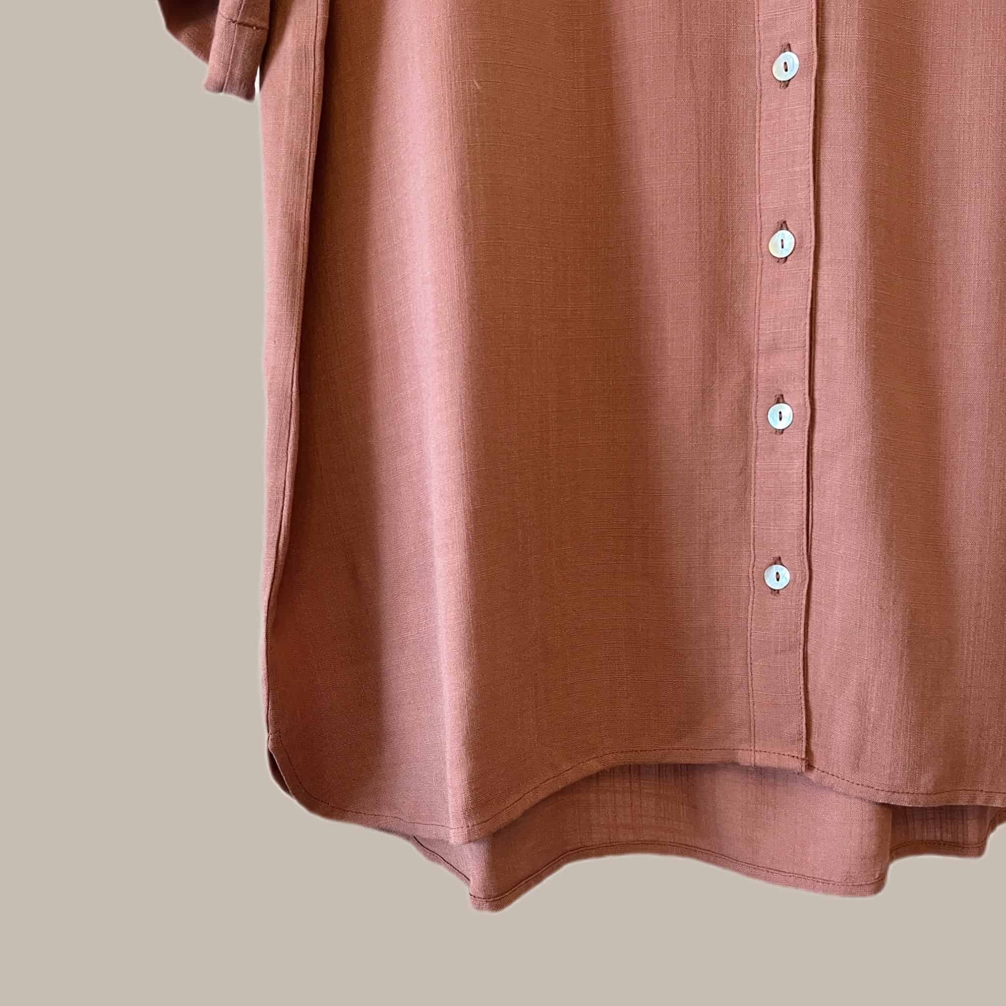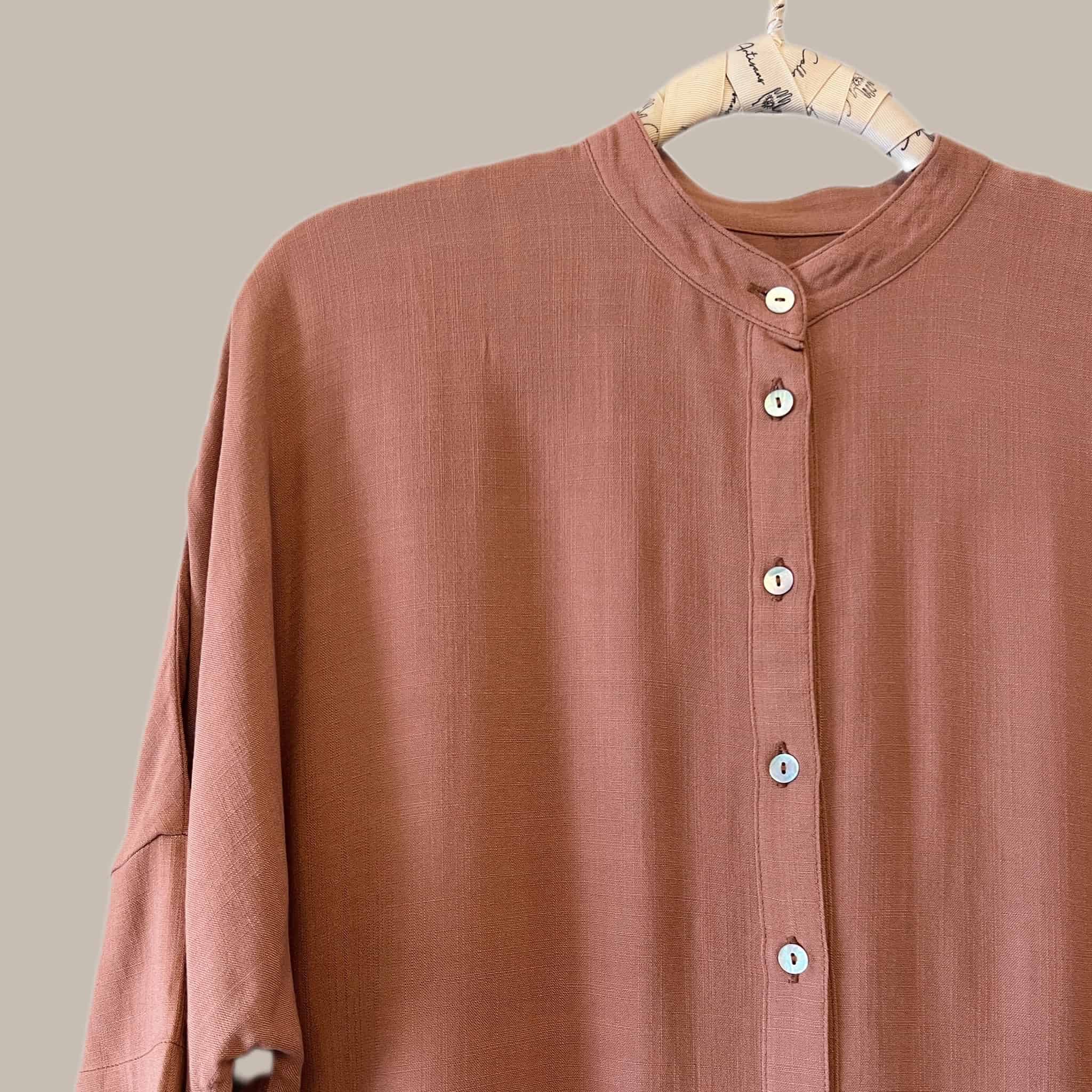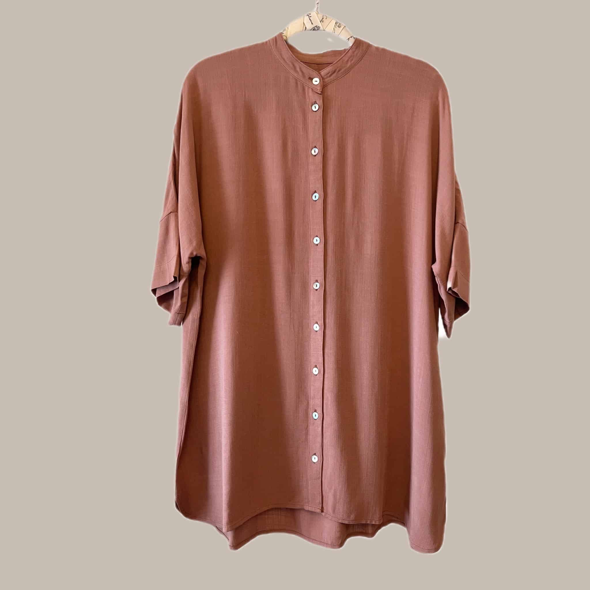 Blusa Vestido en tela rayón con efecto corrugado, cuello redondo sin solapa y botones de carey. Se puede usar como blusa o como vestido corto. .
