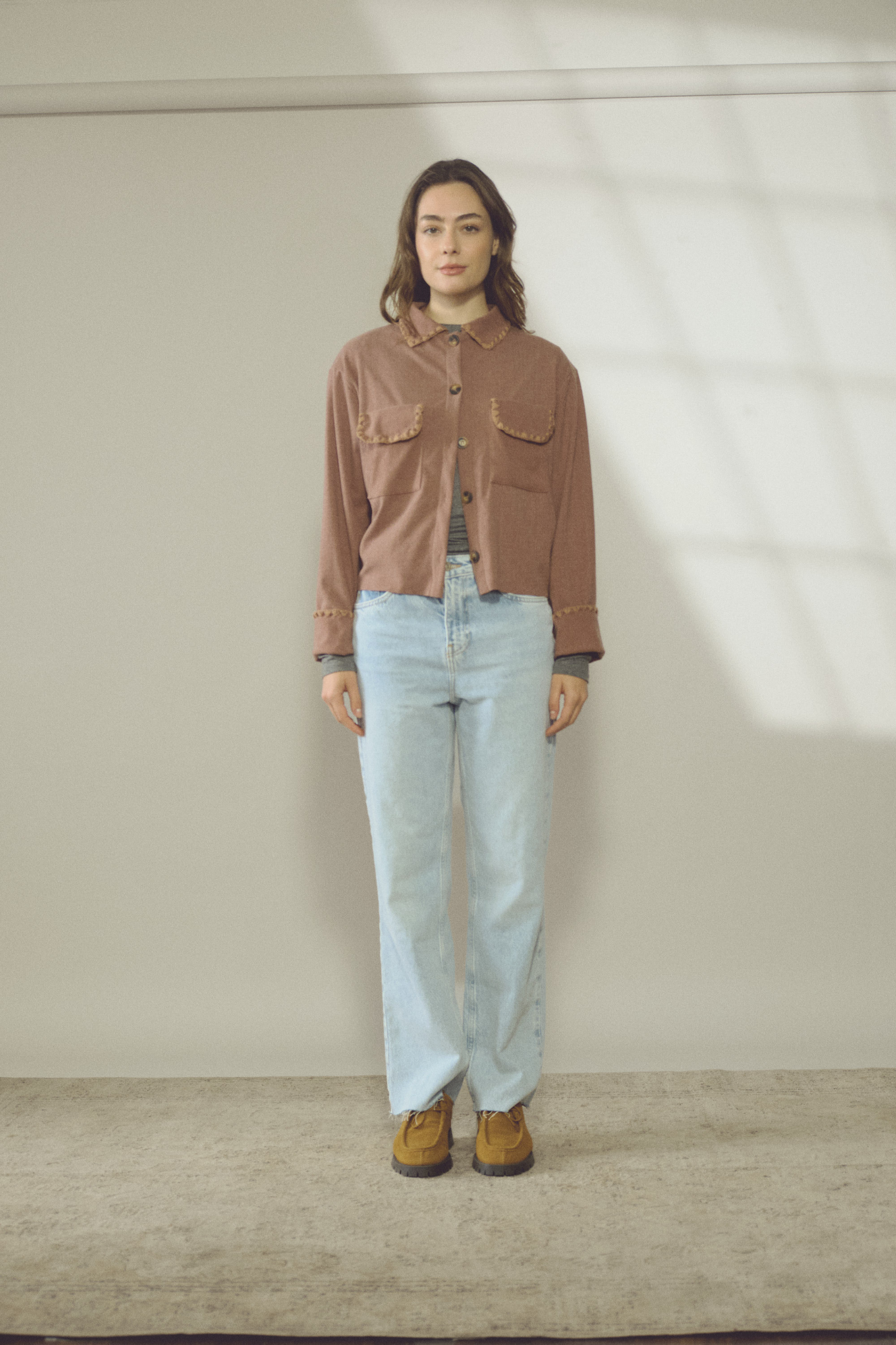 Blusa de manga larga en algodón, con bolsillos frontales funcionales y delicados bordados hechos a mano. Comodidad con un toque único.