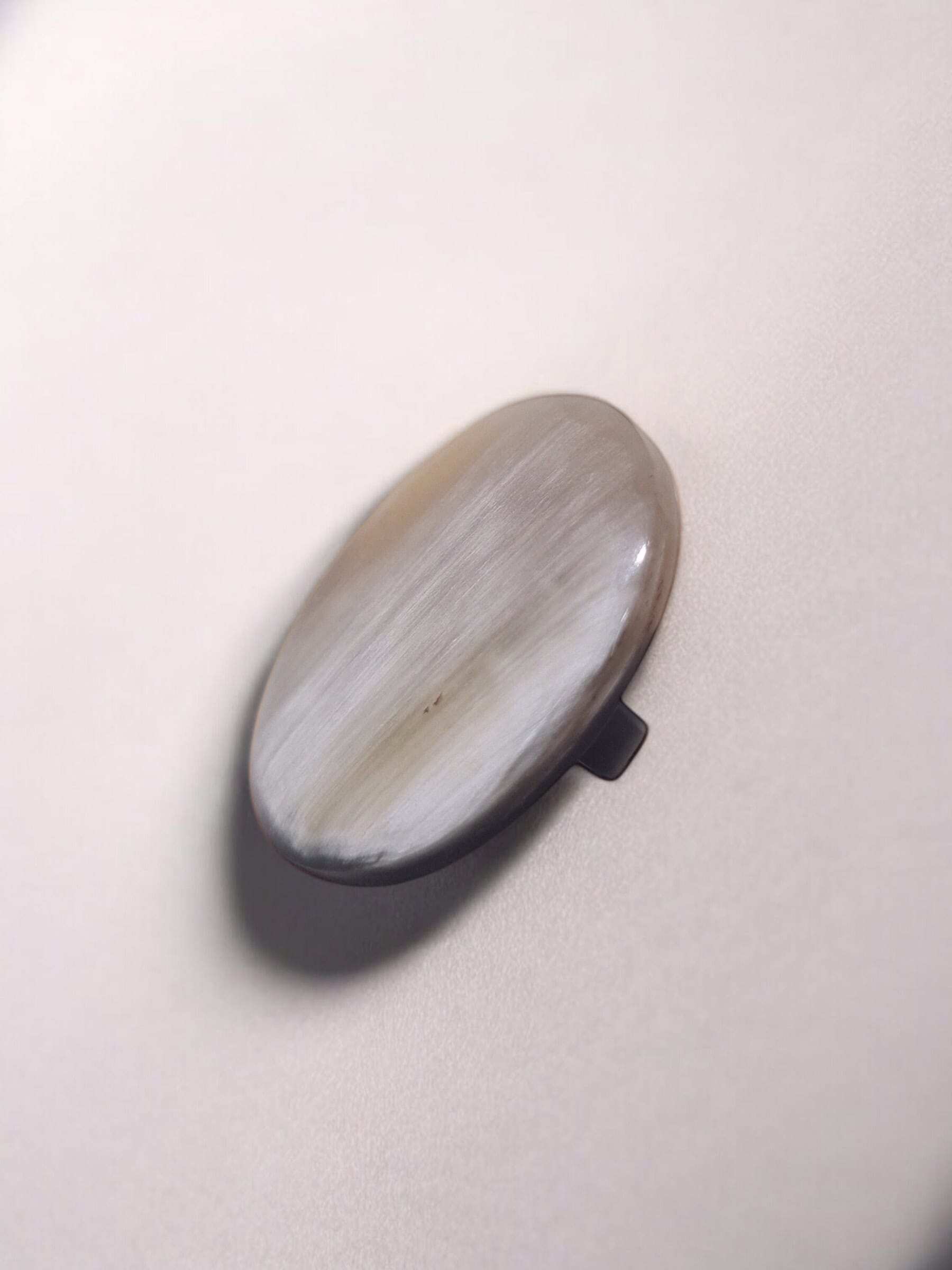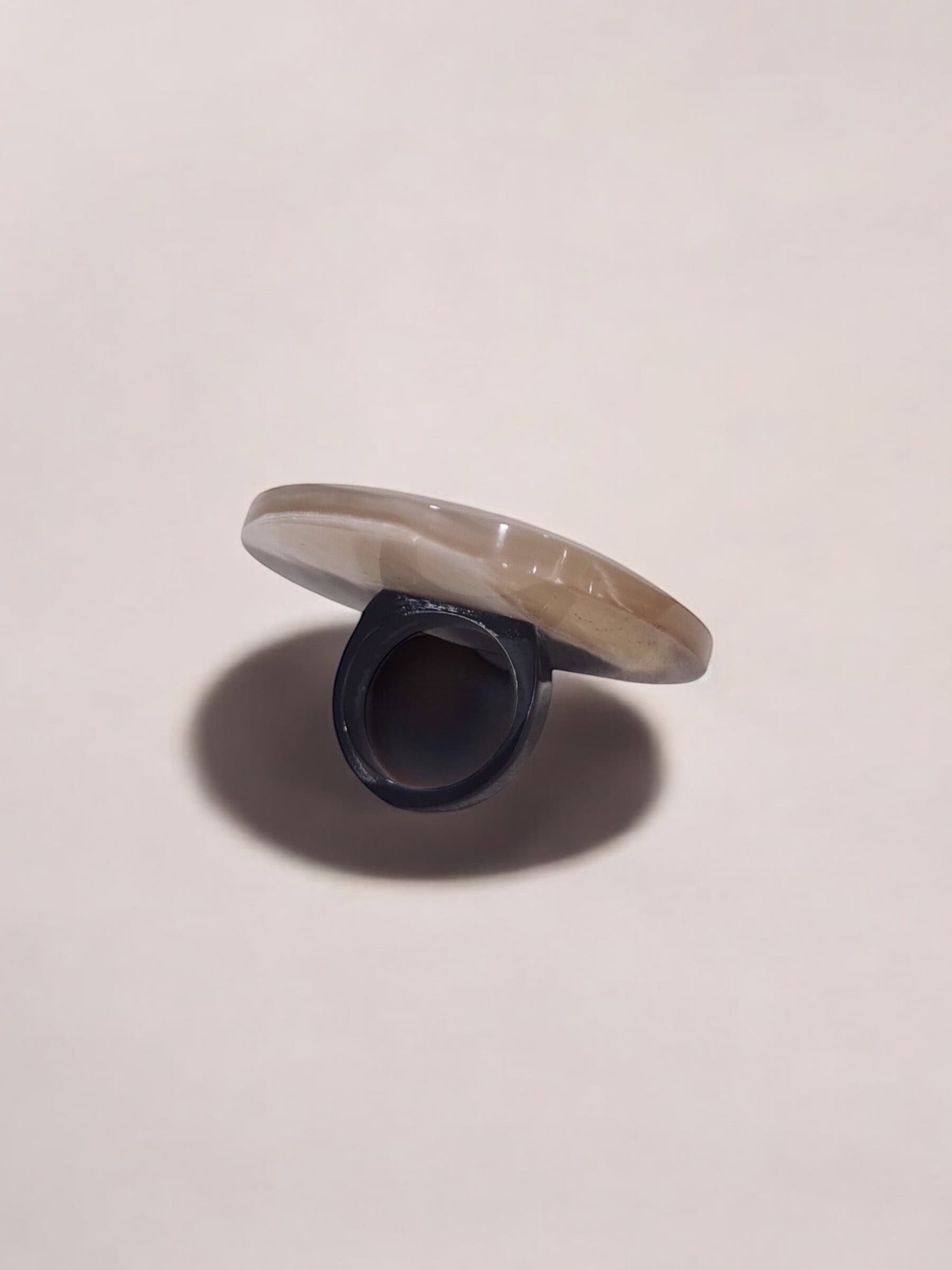 Anillo hecho a mano en cacho de toro reciclado. La belleza del material y el trabajo fino artesanal dan como resultado una pieza única y sostenible.