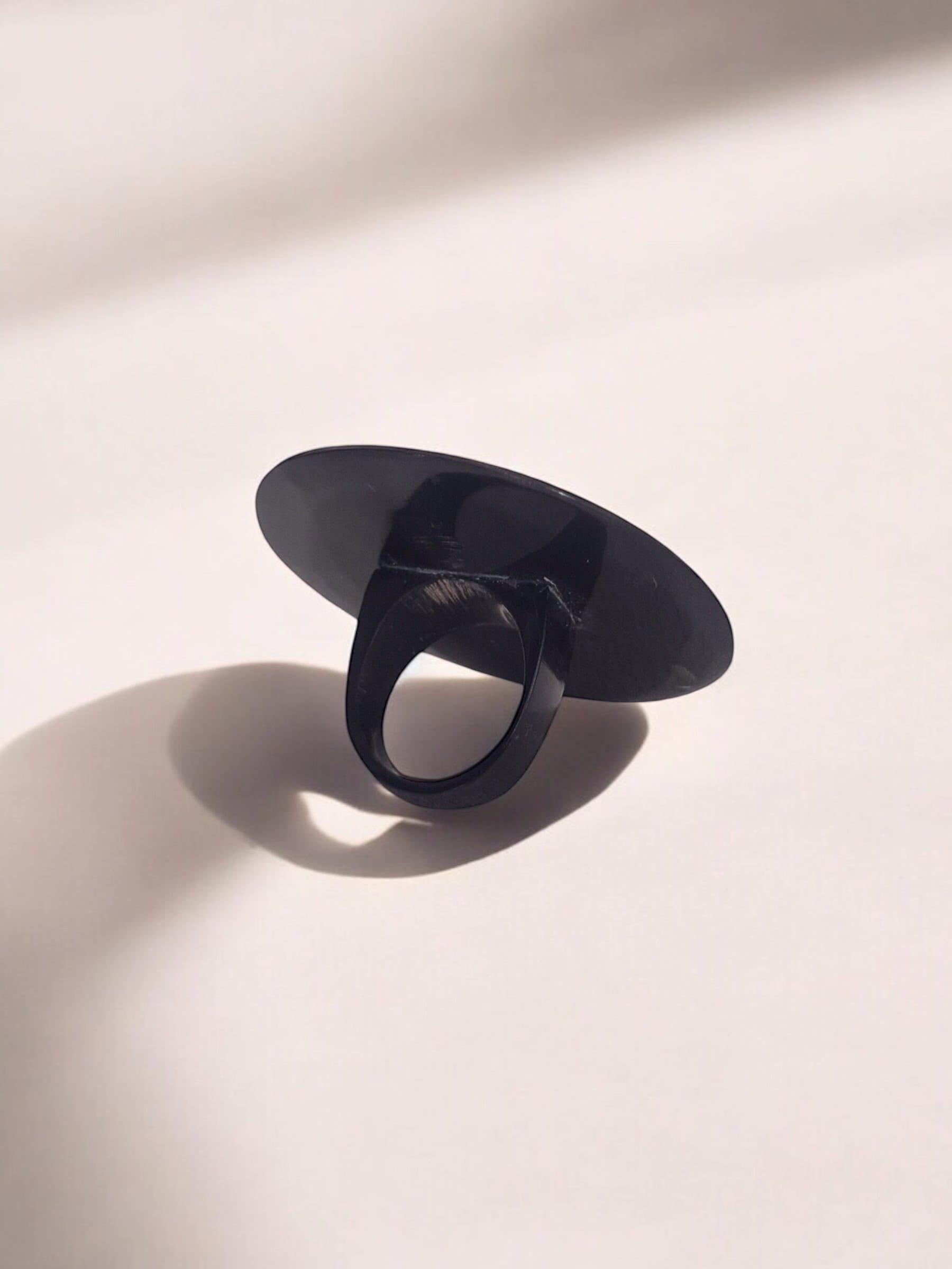 Anillo hecho a mano en cacho de toro reciclado. La belleza del material y el trabajo fino artesanal dan como resultado una pieza única y sostenible.