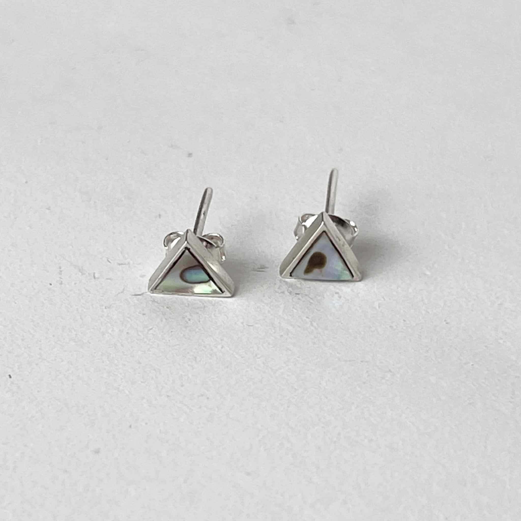 Aretes de plata 925 con concha de abalón en forma de triángulo. El abalón fomenta la paz y la calma en situaciones muy emocionales. Estimula la intuición y la imaginación. Ayuda a sentir la belleza, el amor, consuelo, cariño, ternura, alegría y paz.