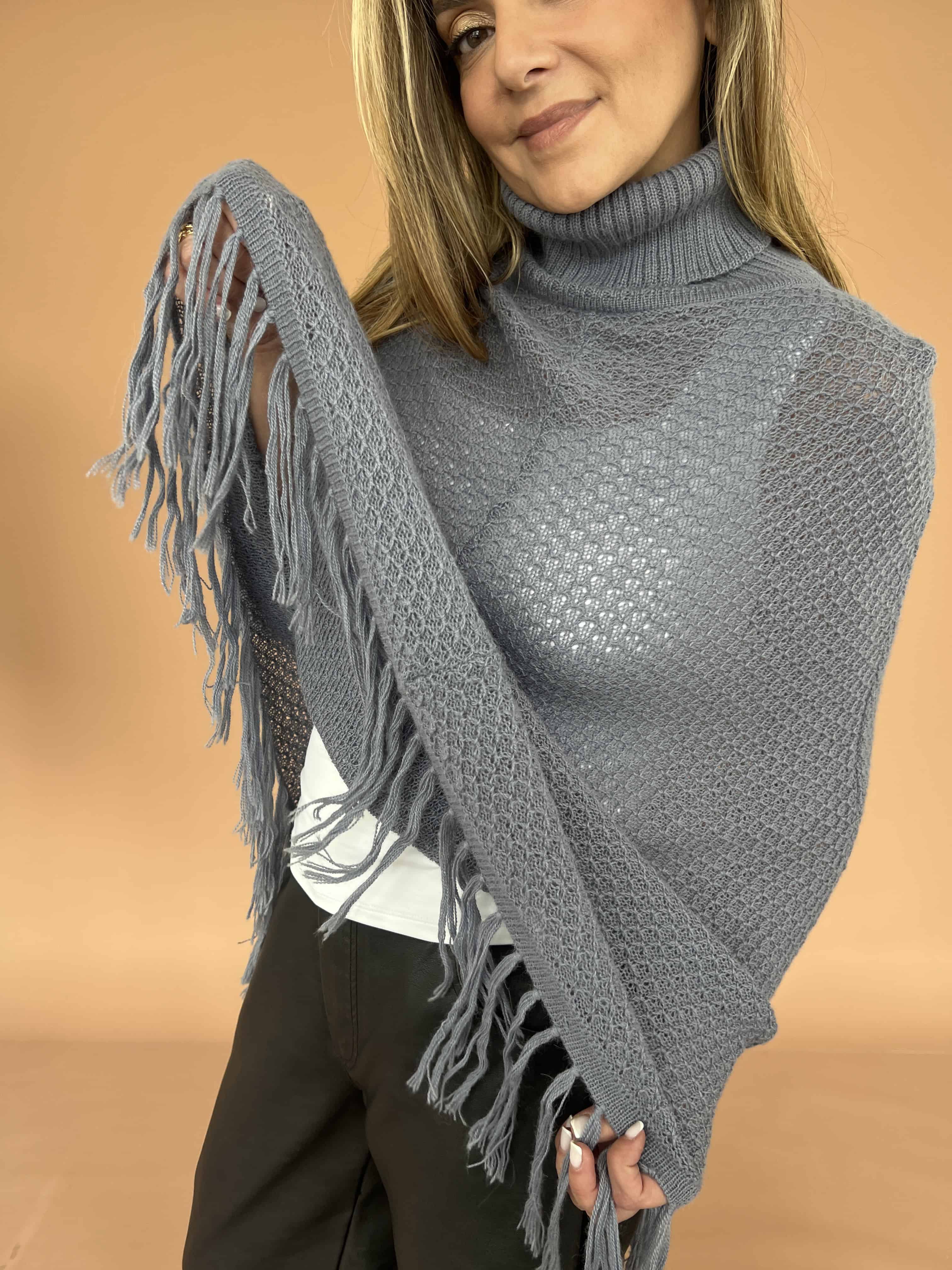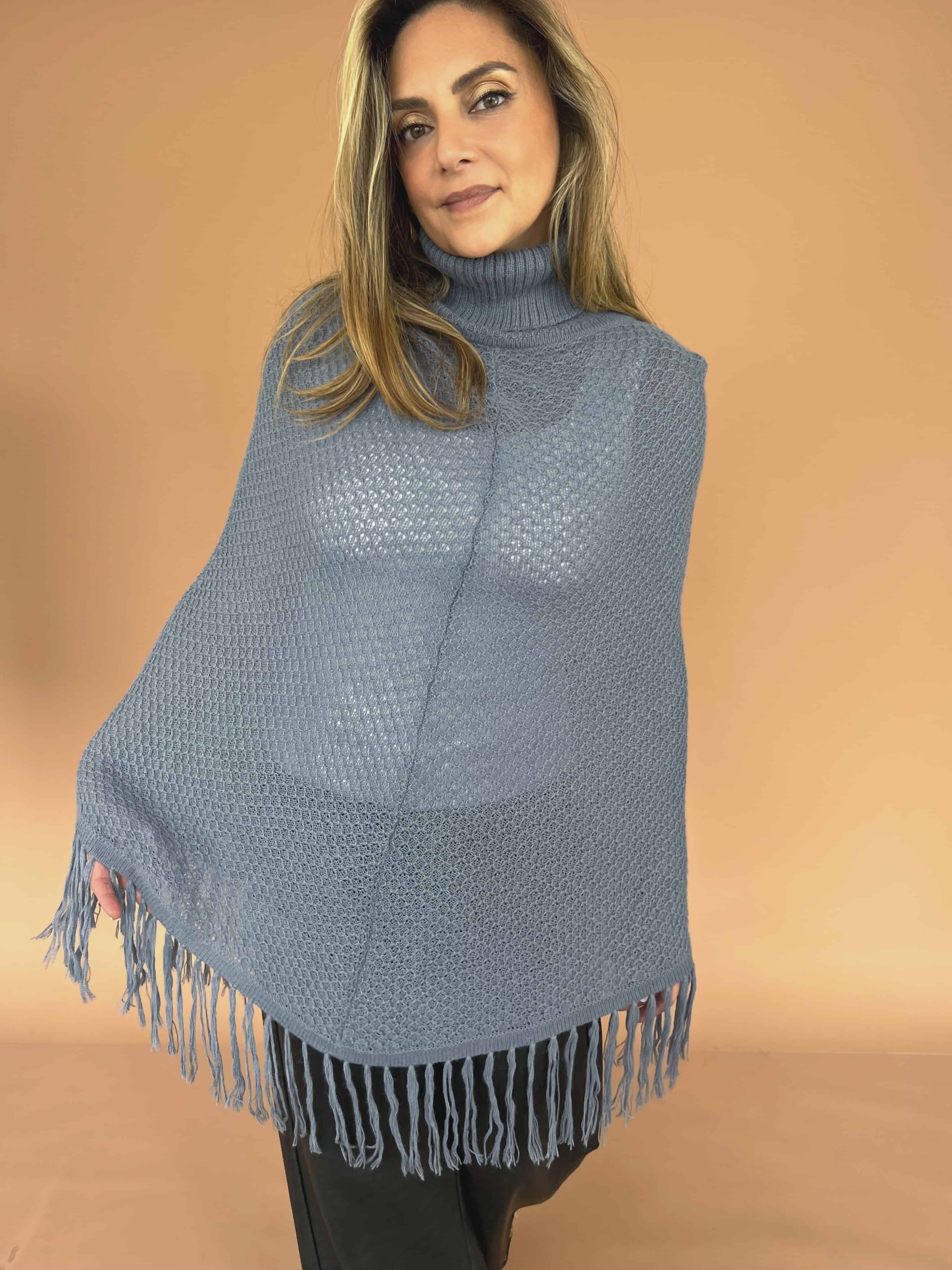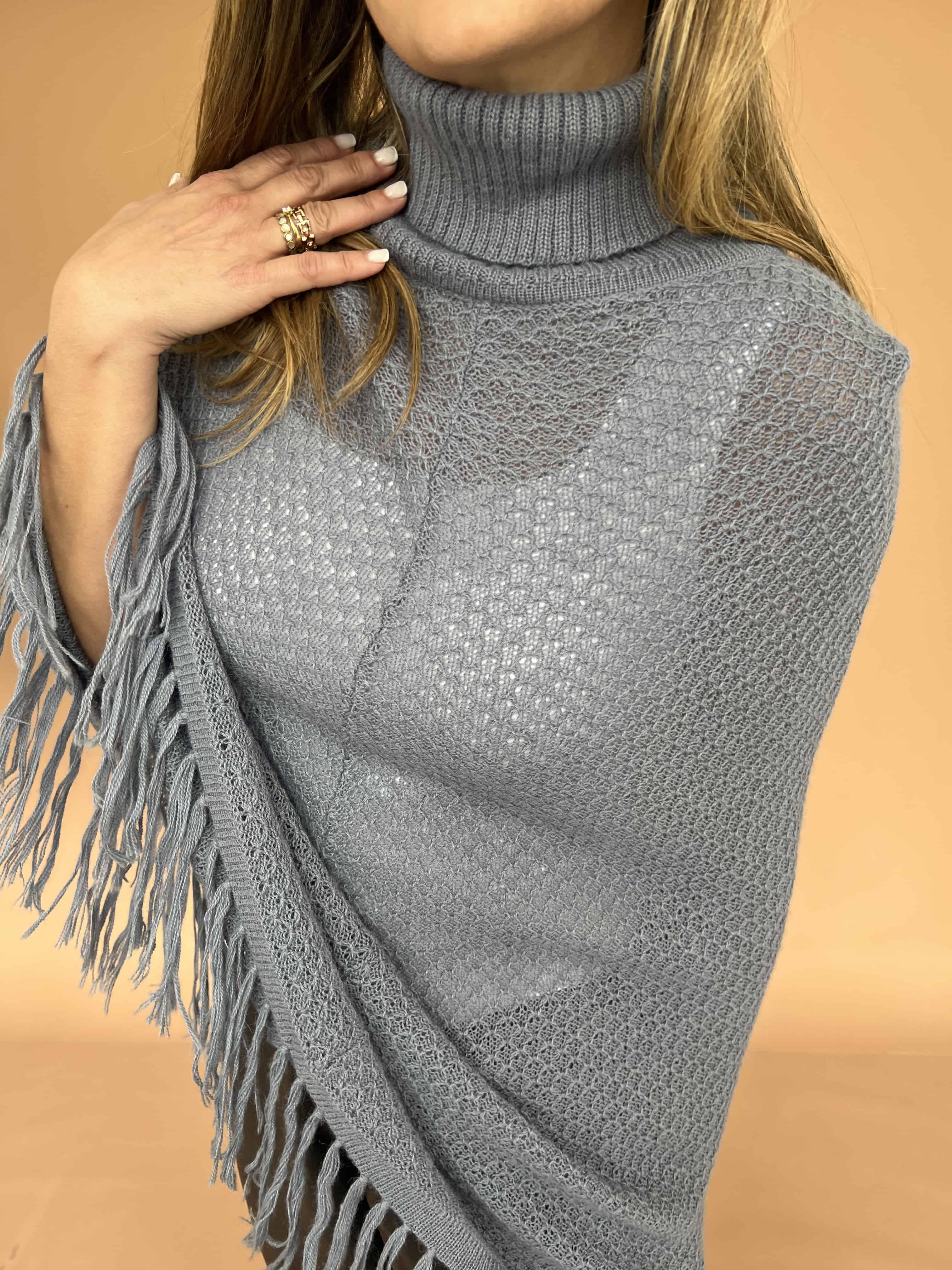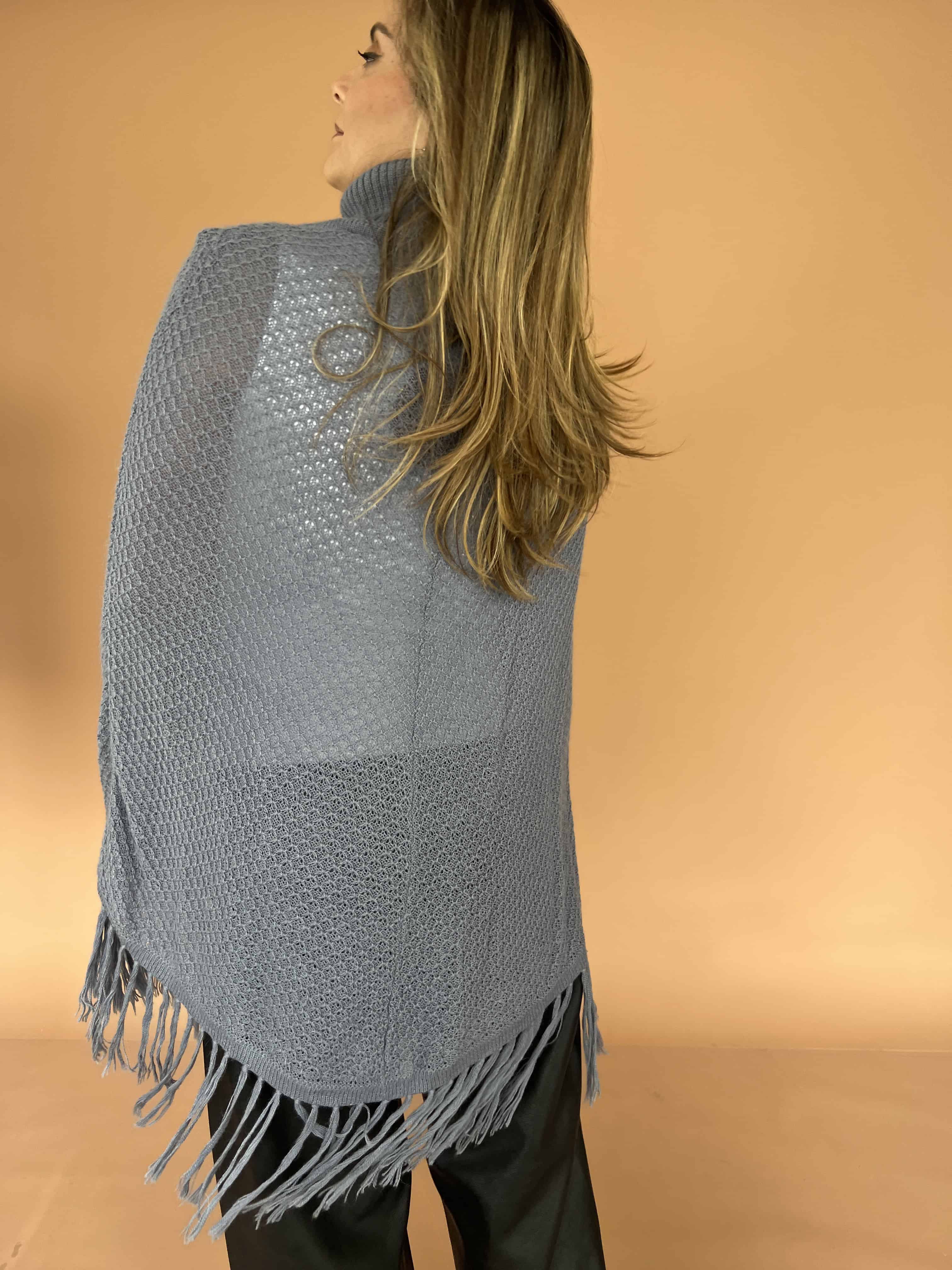 Poncho de alpaca con cuello alto tejido y flecos en el borde inferior. De textura suave y abrigadora.