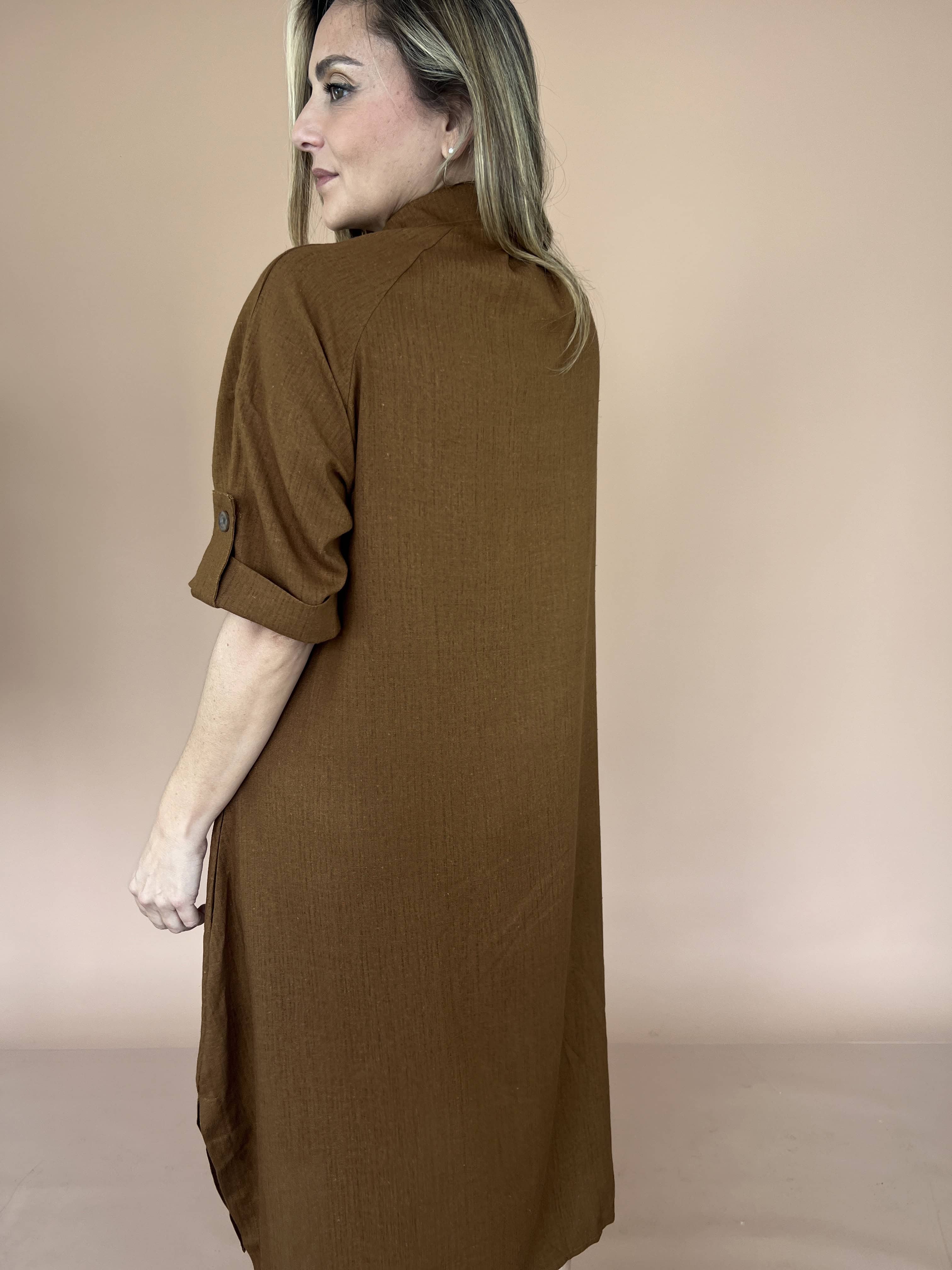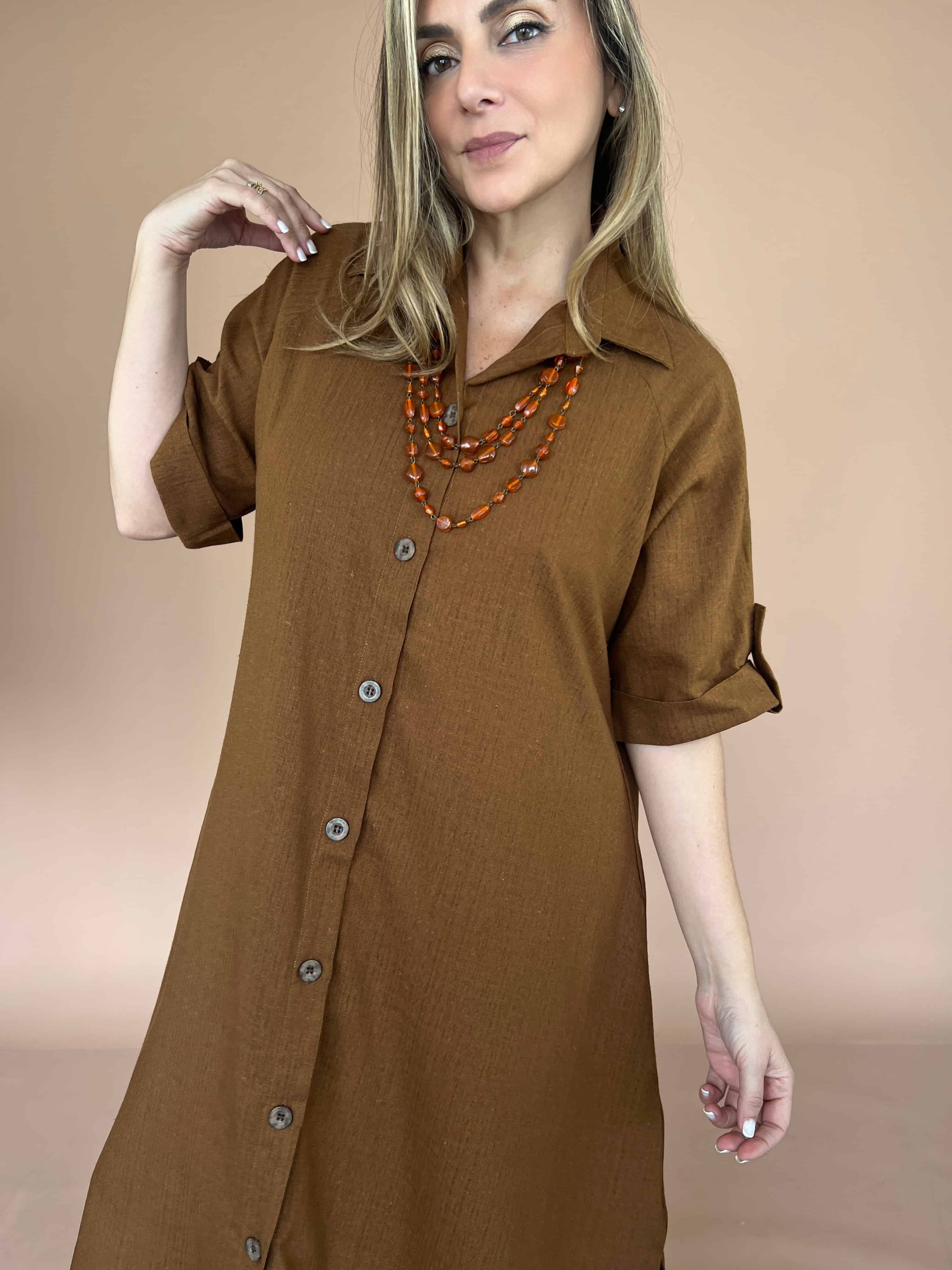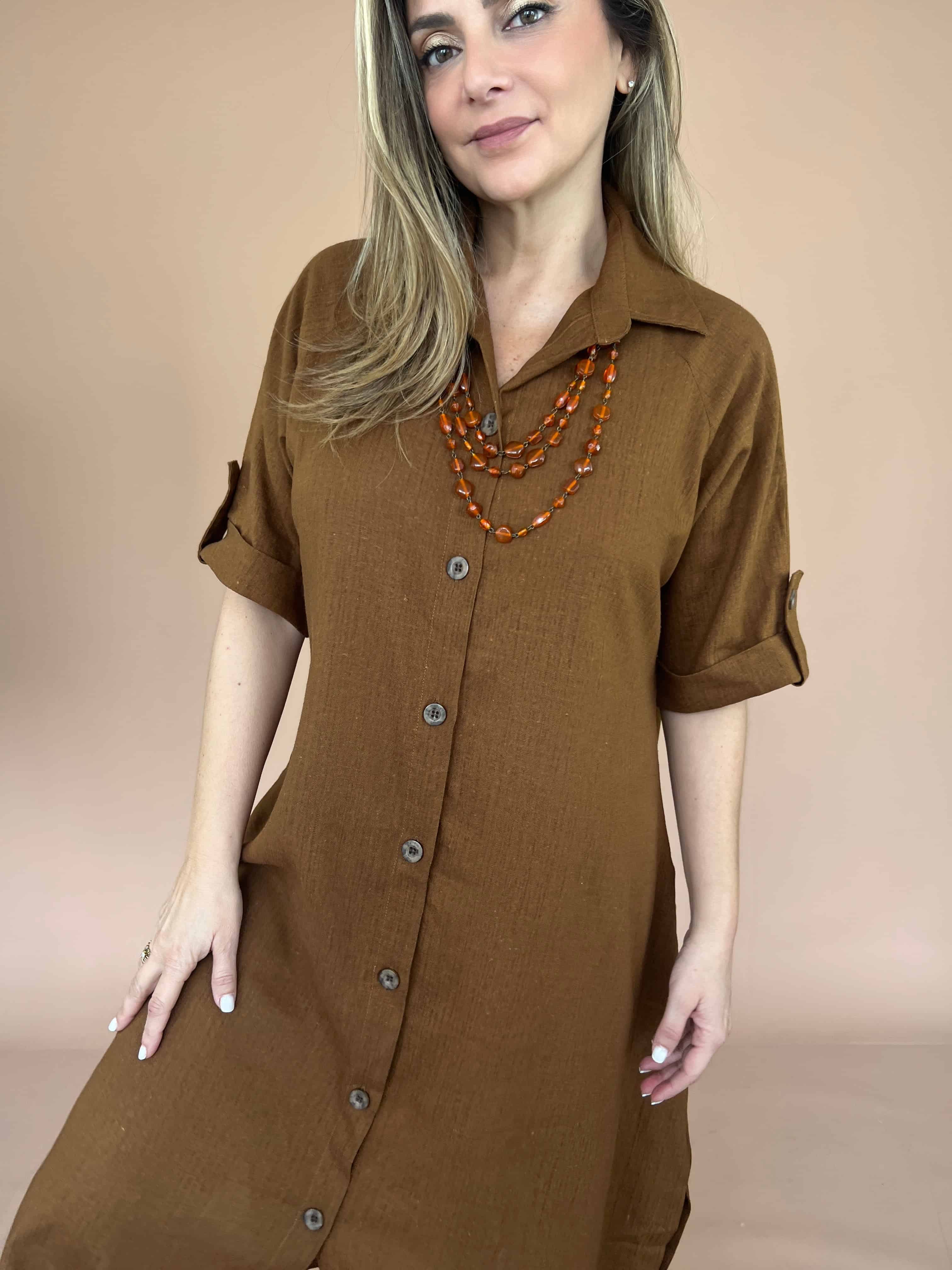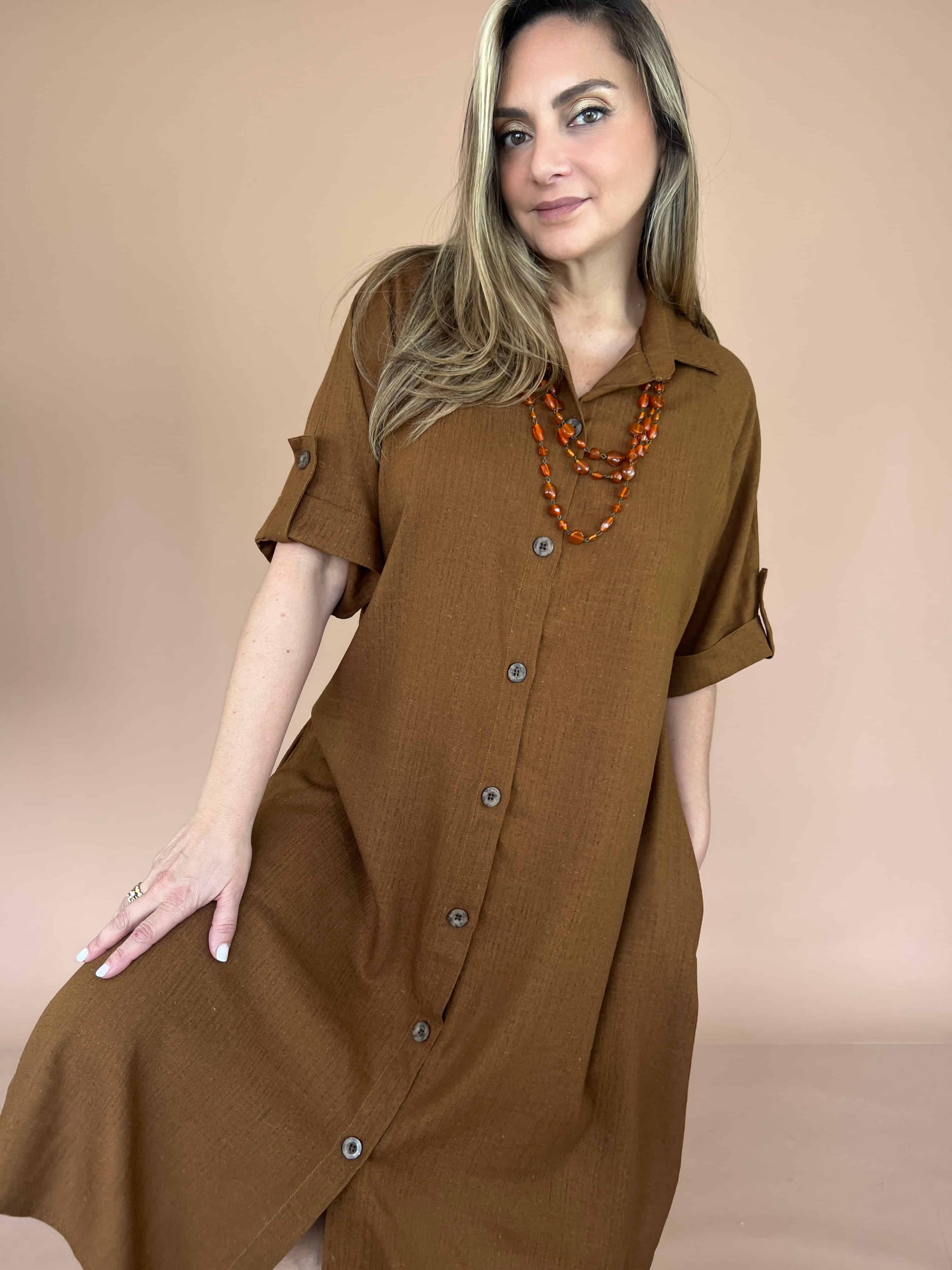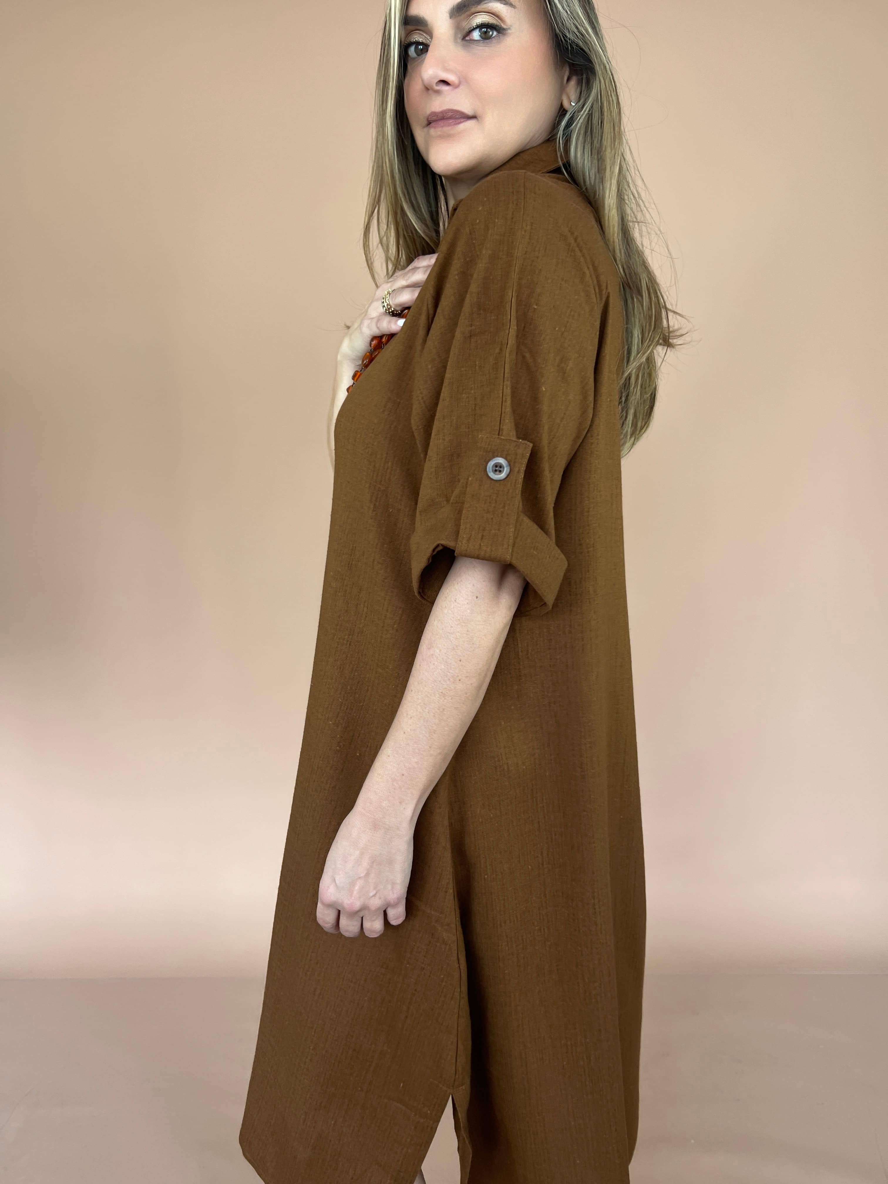Vestido largo camisero en lino, con botones de nácar y aberturas laterales que aportan movimiento. Su diseño ligero y de corte relajado lo convierte en una opción cómoda y elegante para el día a día.