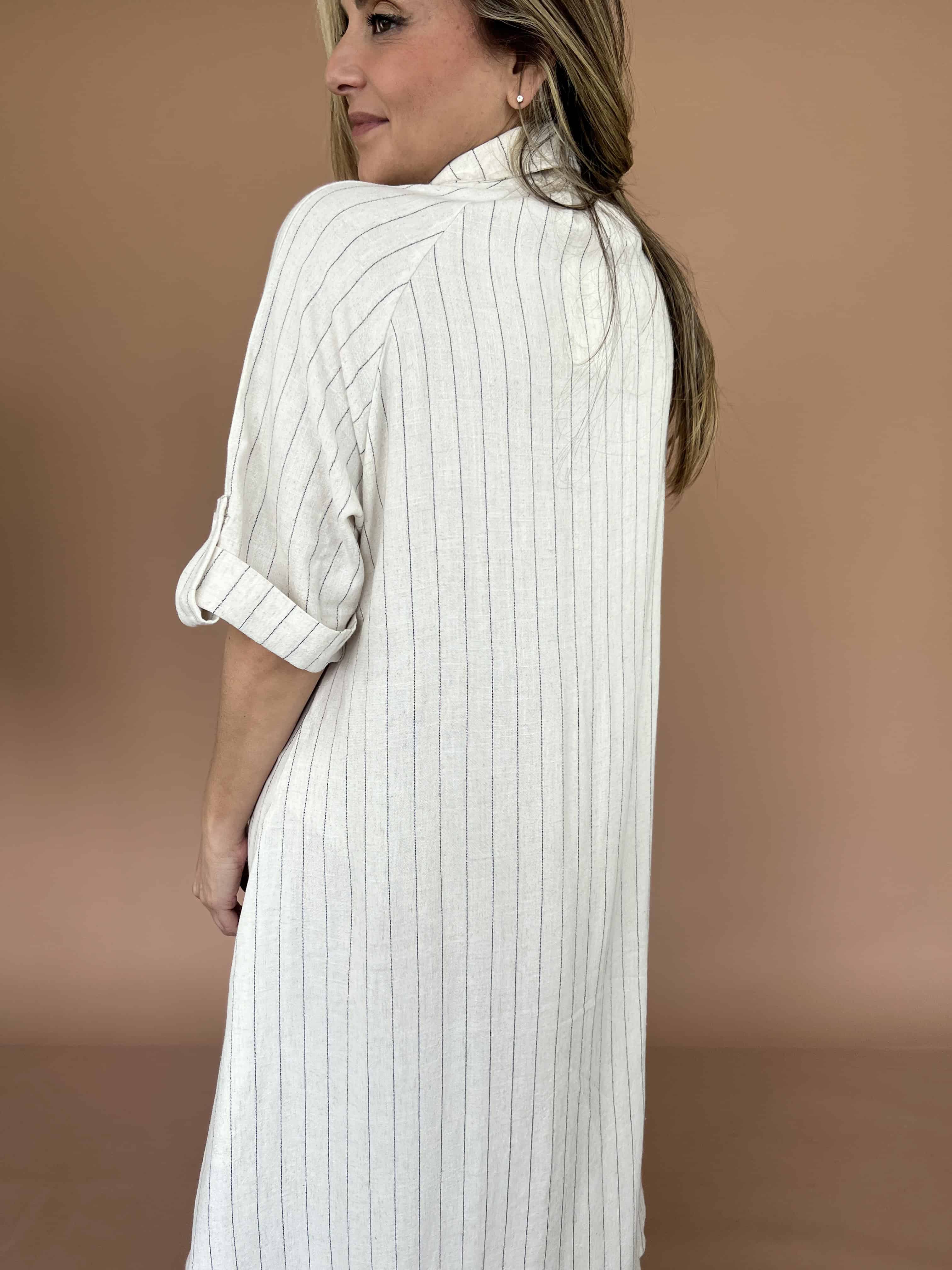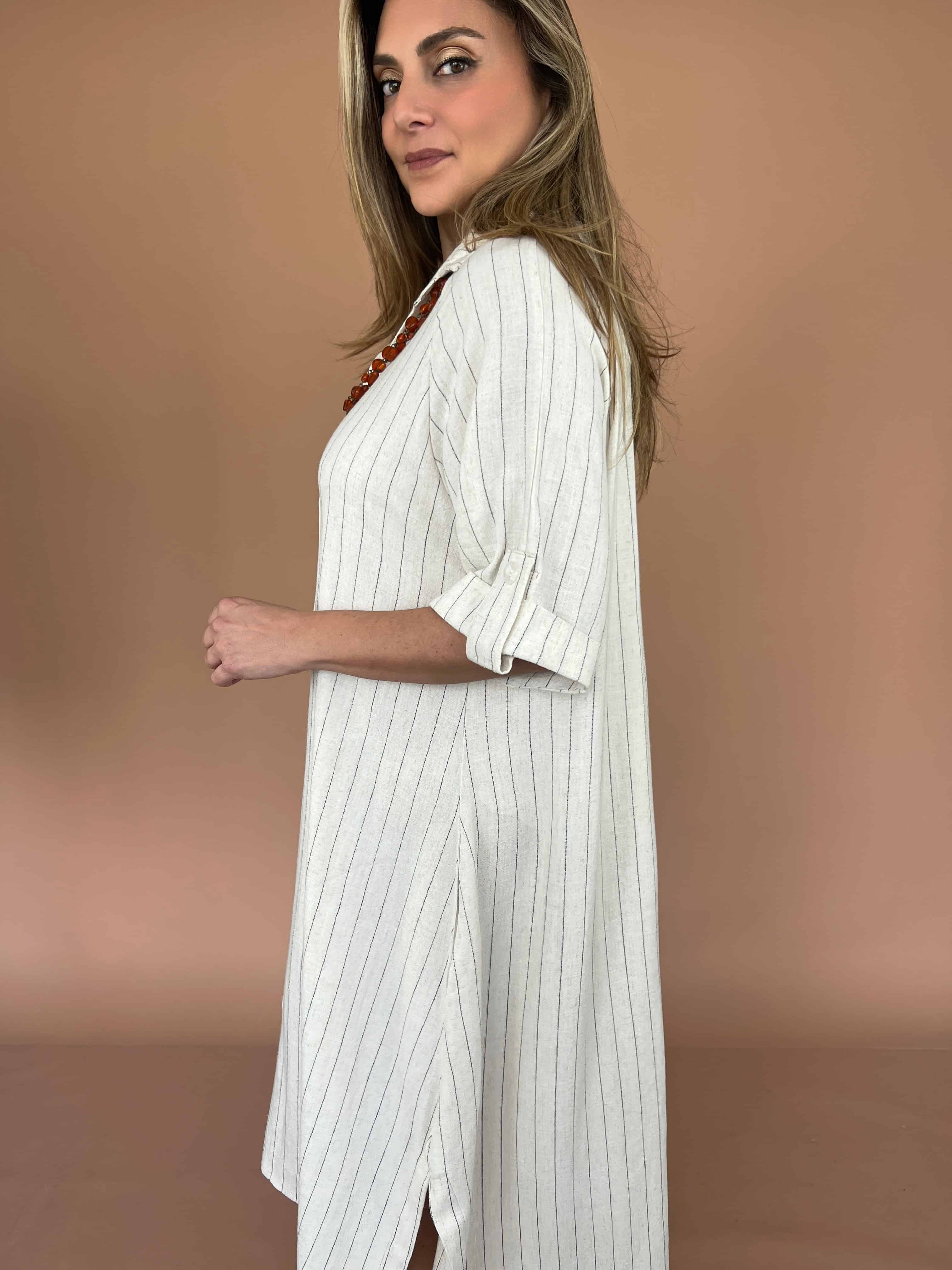 Vestido largo camisero en lino, con botones de nácar y aberturas laterales que aportan movimiento. Su diseño ligero y de corte relajado lo convierte en una opción cómoda y elegante para el día a día.
