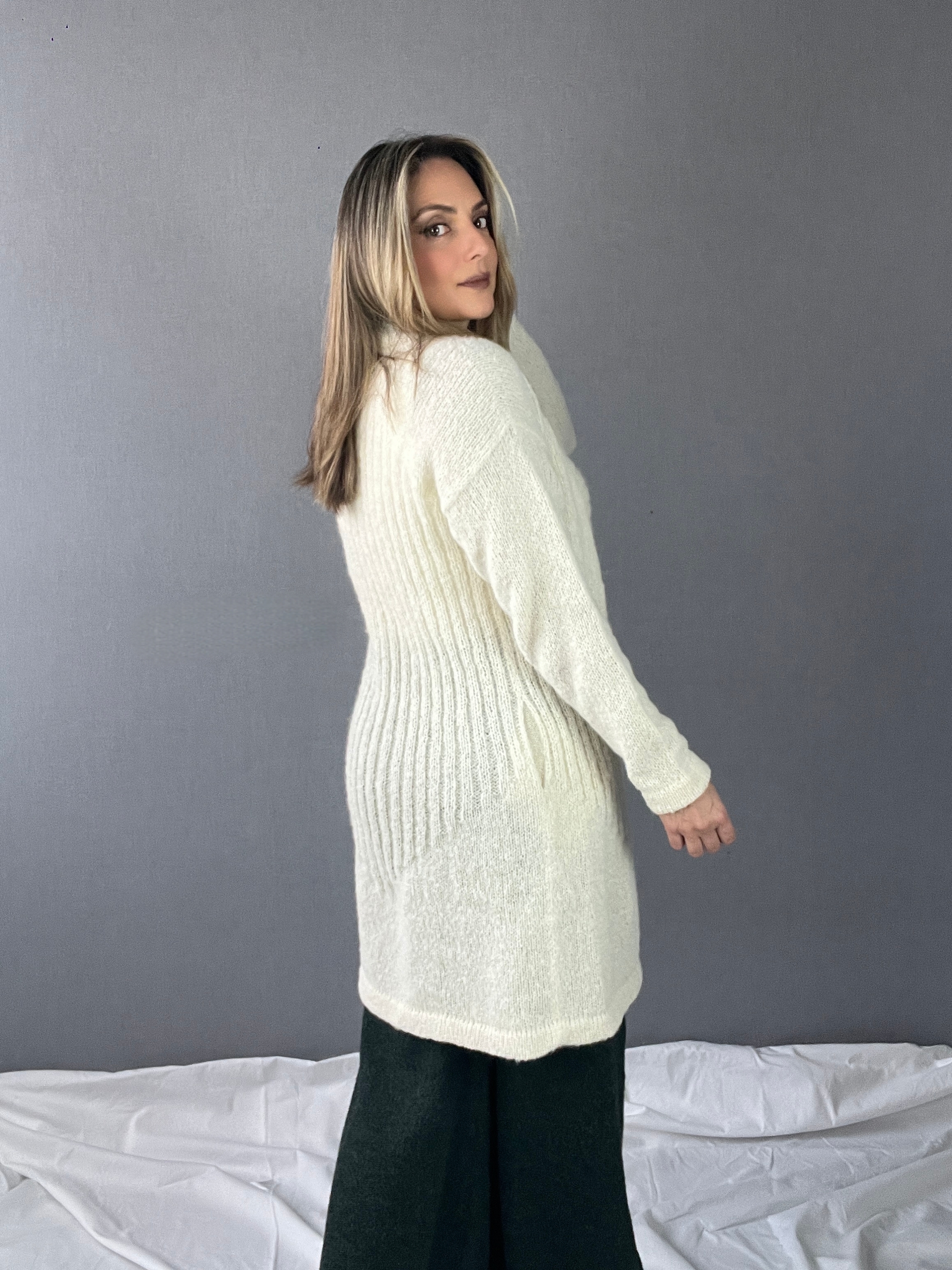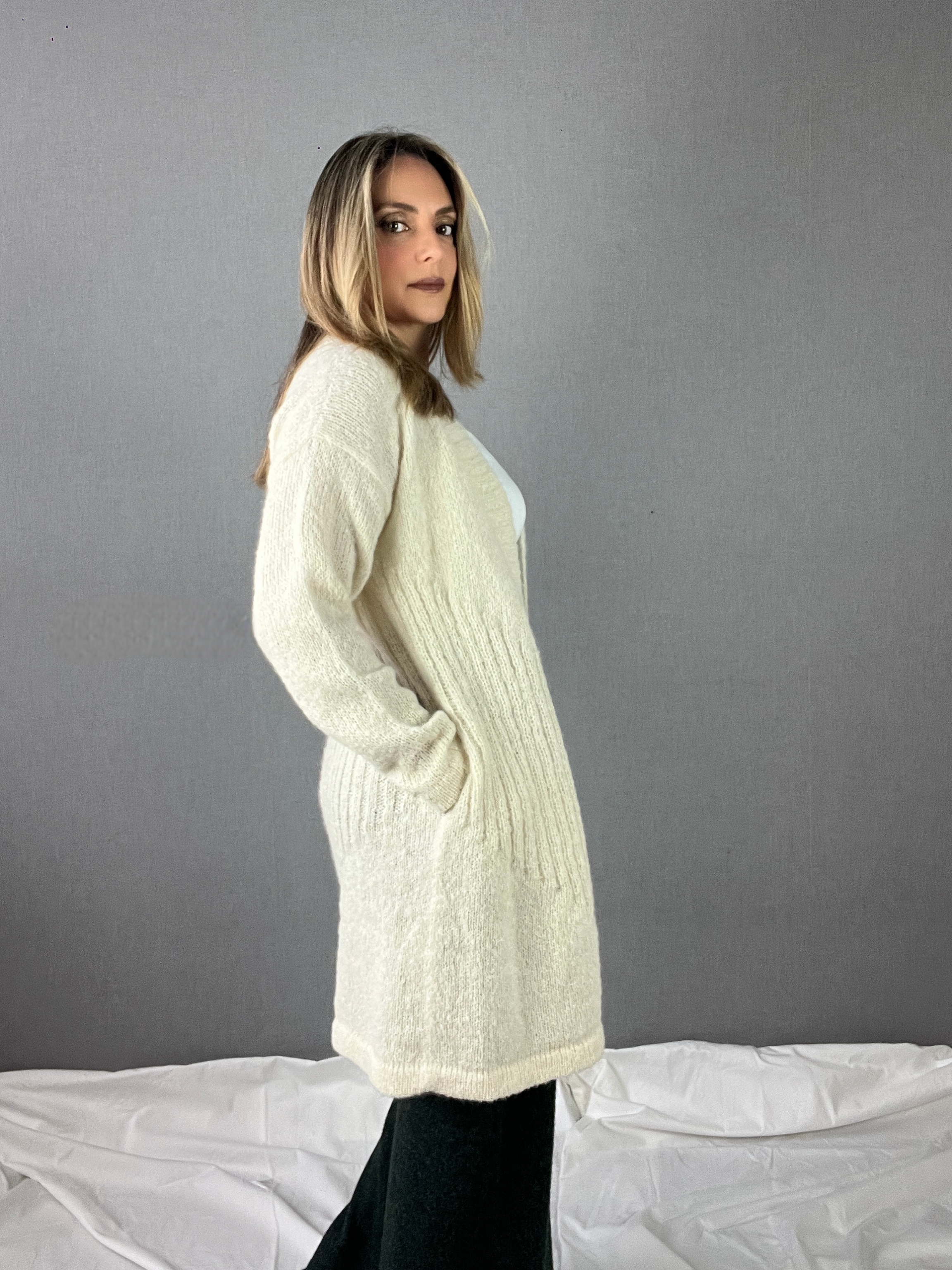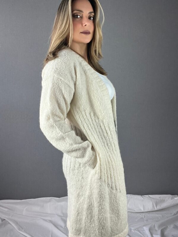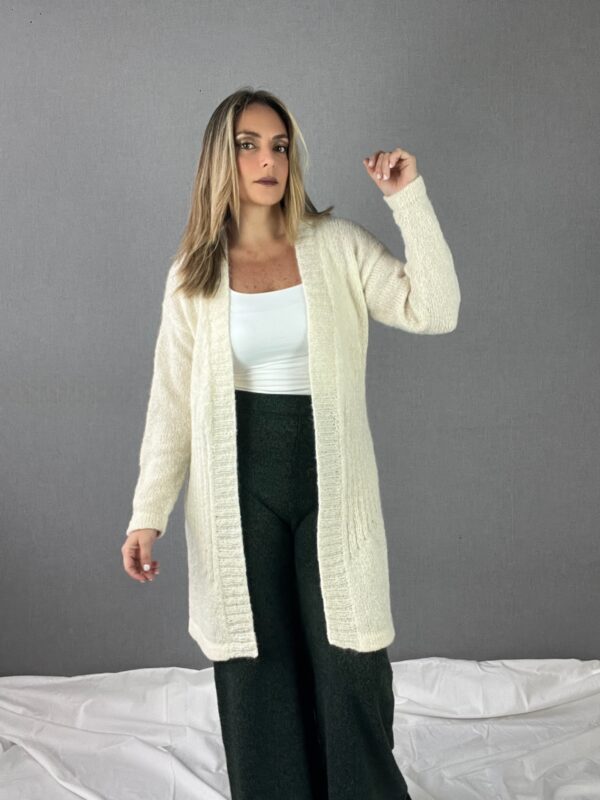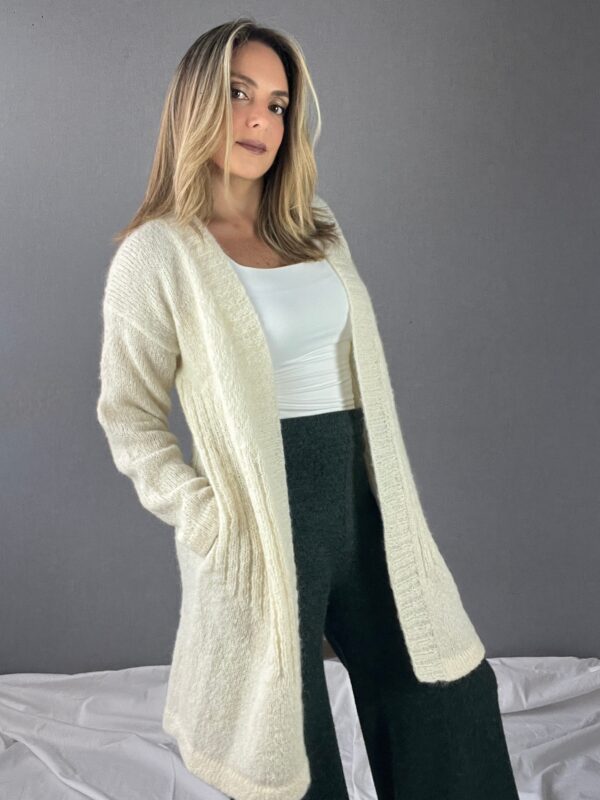 Cardigan de alpaca hecho a mano por tejedoras peruanas, diseño con patrones verticales para una apariencia mas esbelta, además de bolsillos ocultos en los laterales, súper ligero, cómodo y suave.