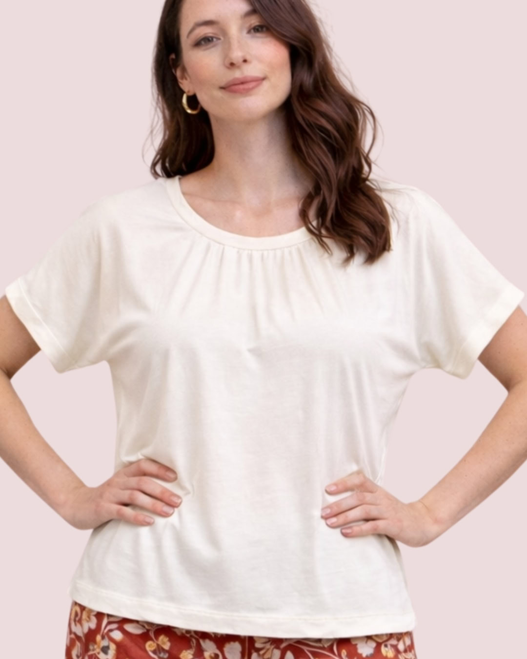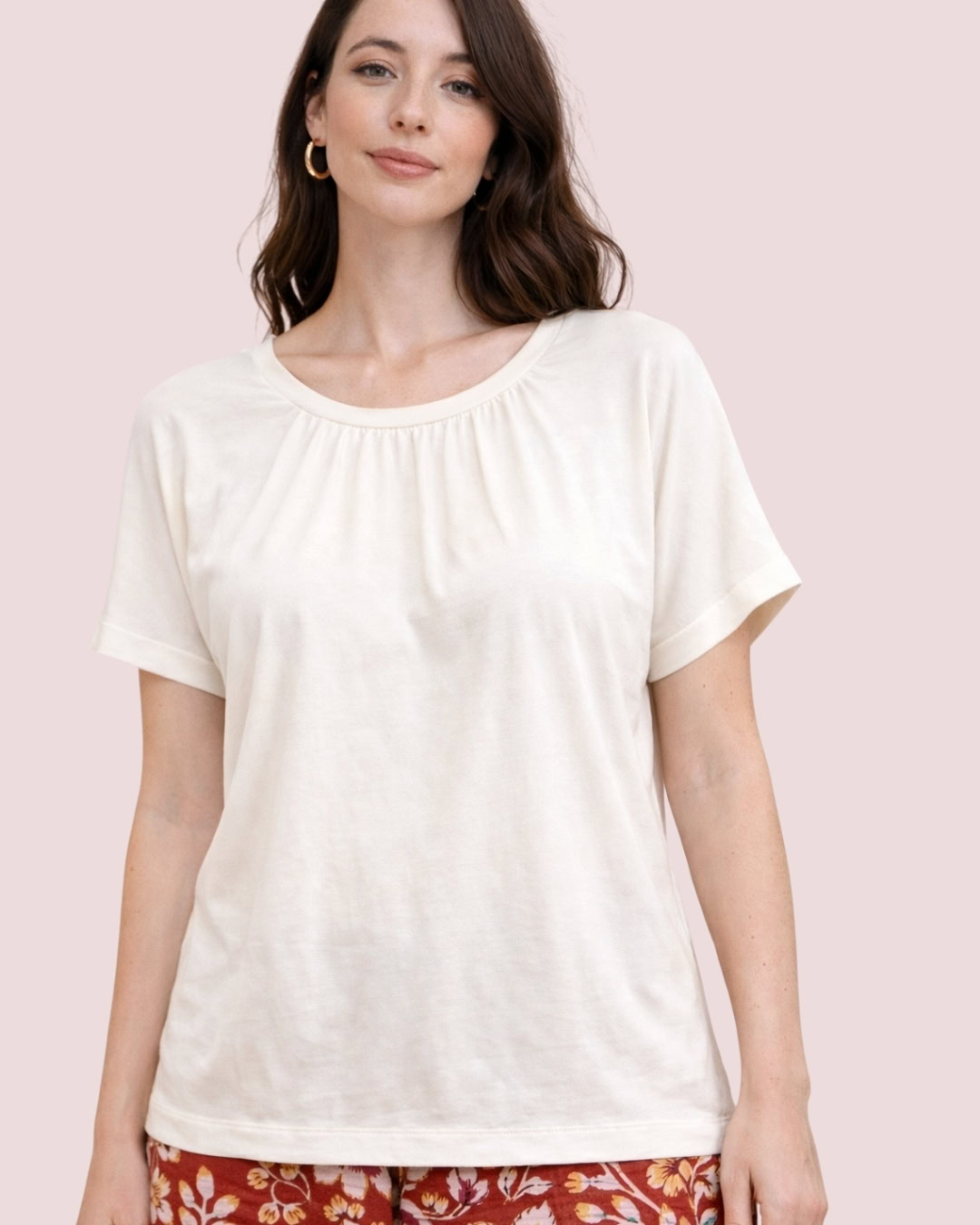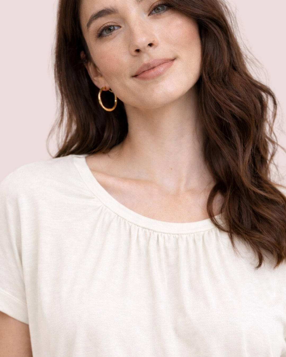 Polo de algodón, suave y cómodo al tacto. Presenta cuello redondo con delicado fruncido en la parte frontal que aporta un detalle femenino y sutil.