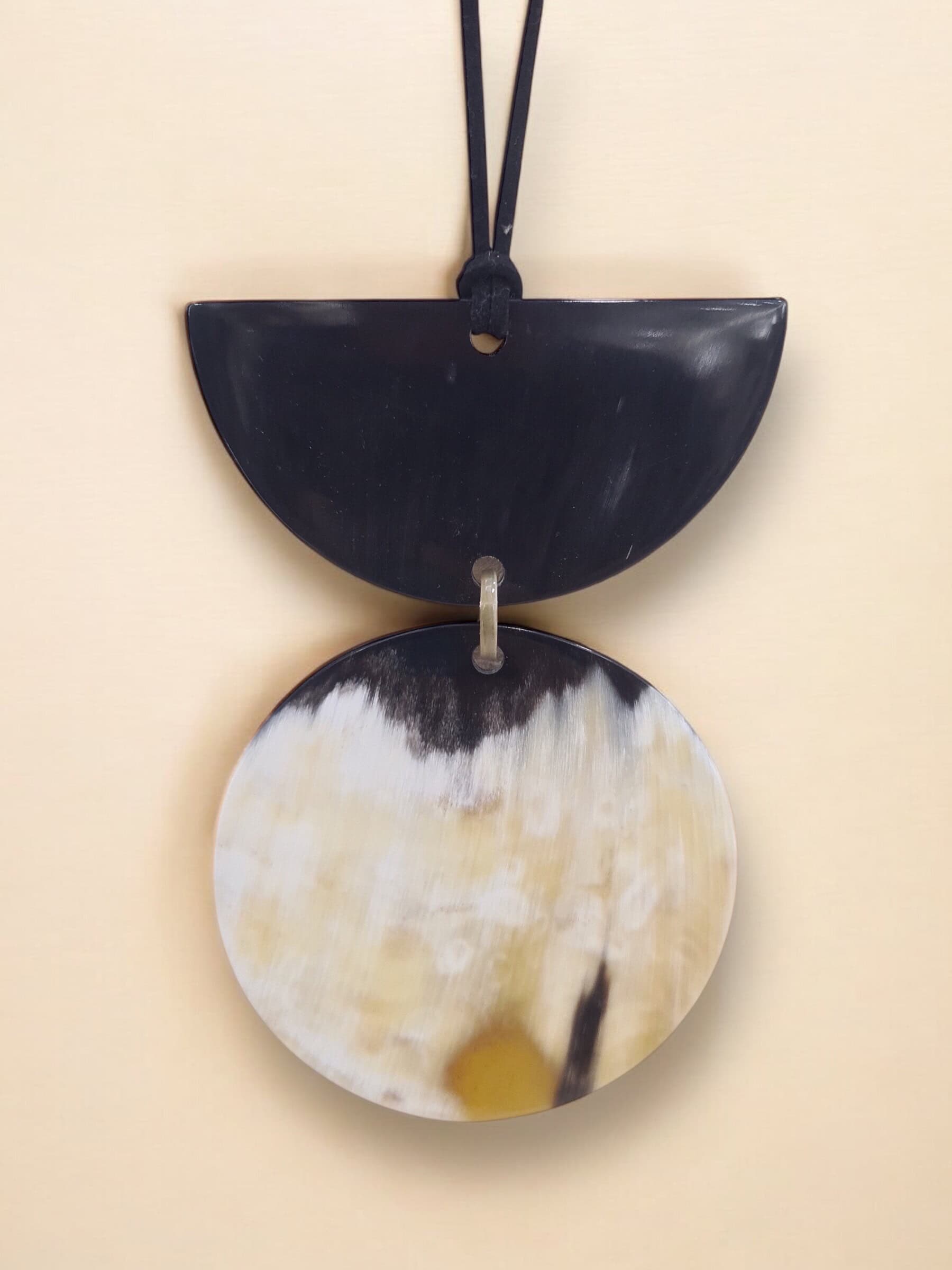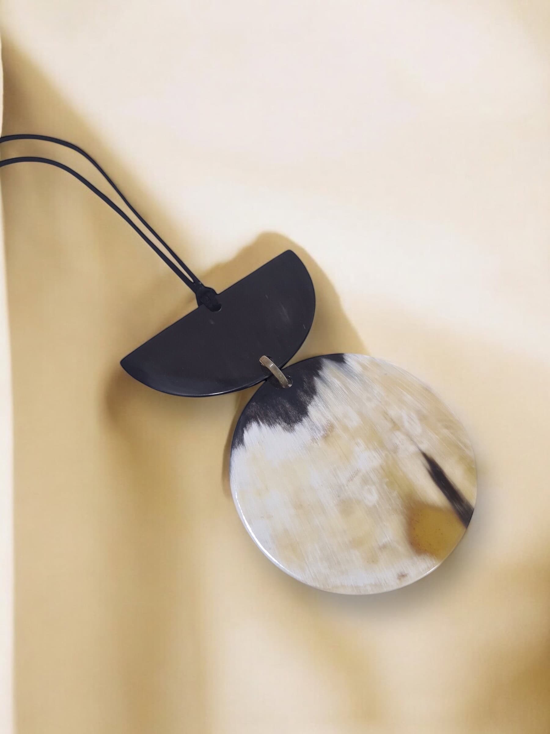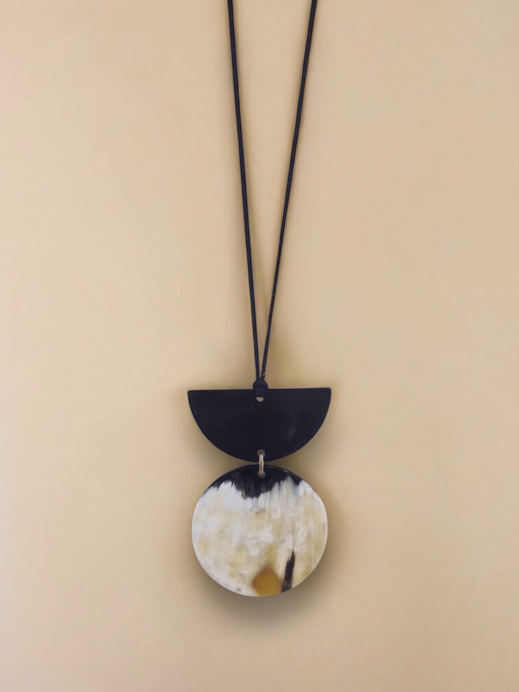 Collar largo hecho a mano en cacho de toro reciclado. La belleza del material y el trabajo fino artesanal dan como resultado una pieza única y sostenible.