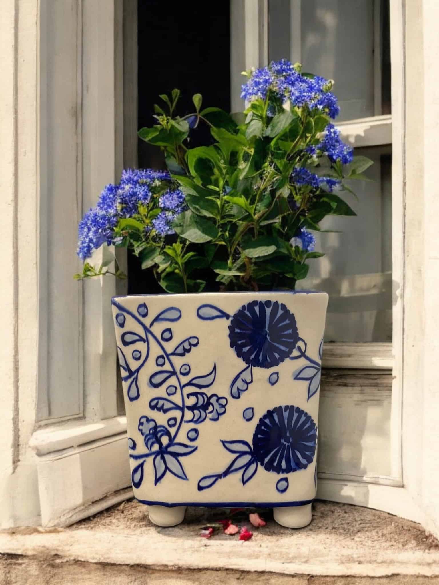 Maceta cuadrada de cerámica hecha y pintada a mano por artesanos limeños. Ideal para orquídeas, plantas aromáticas, plantas de temporada, etc.