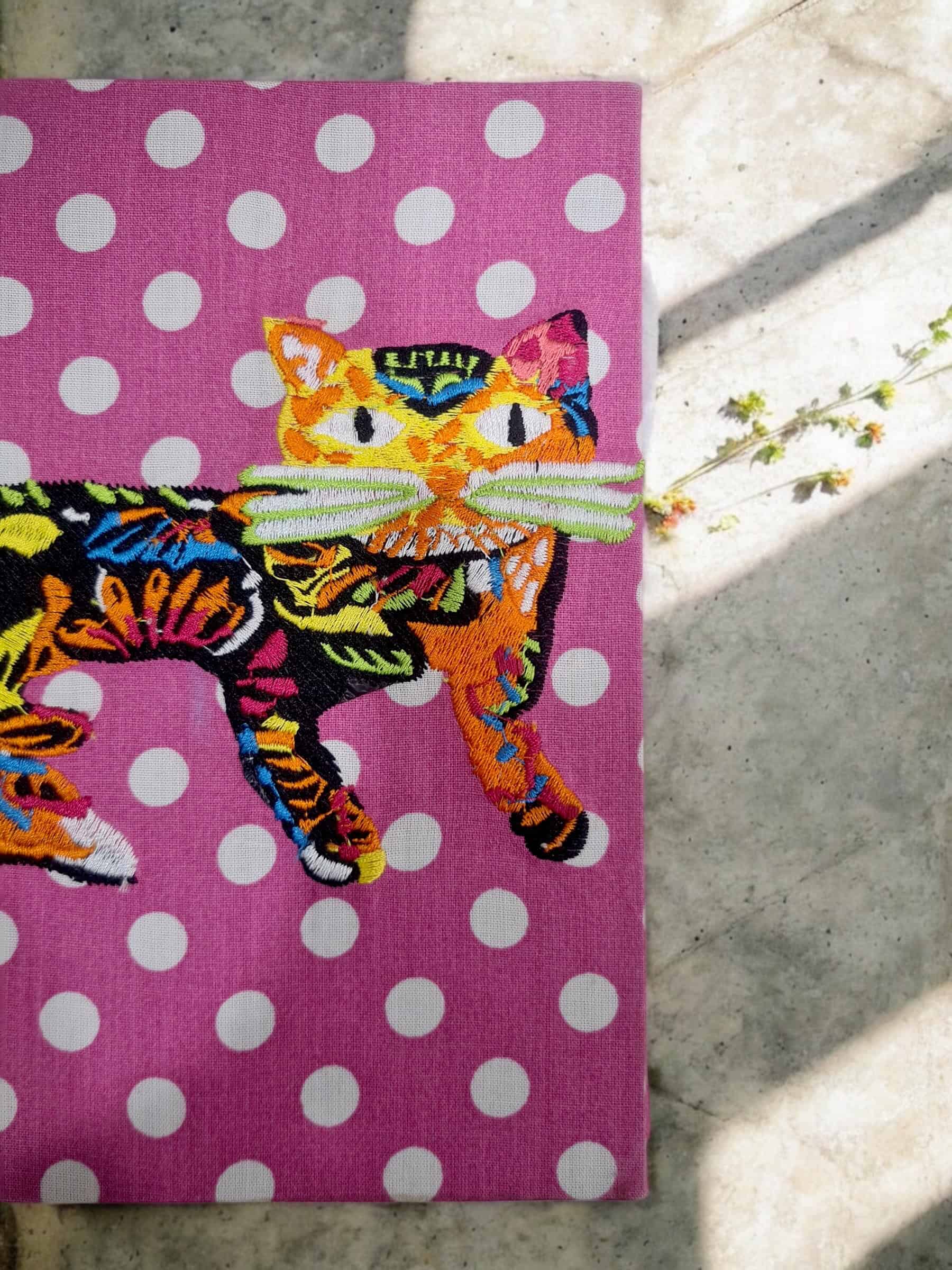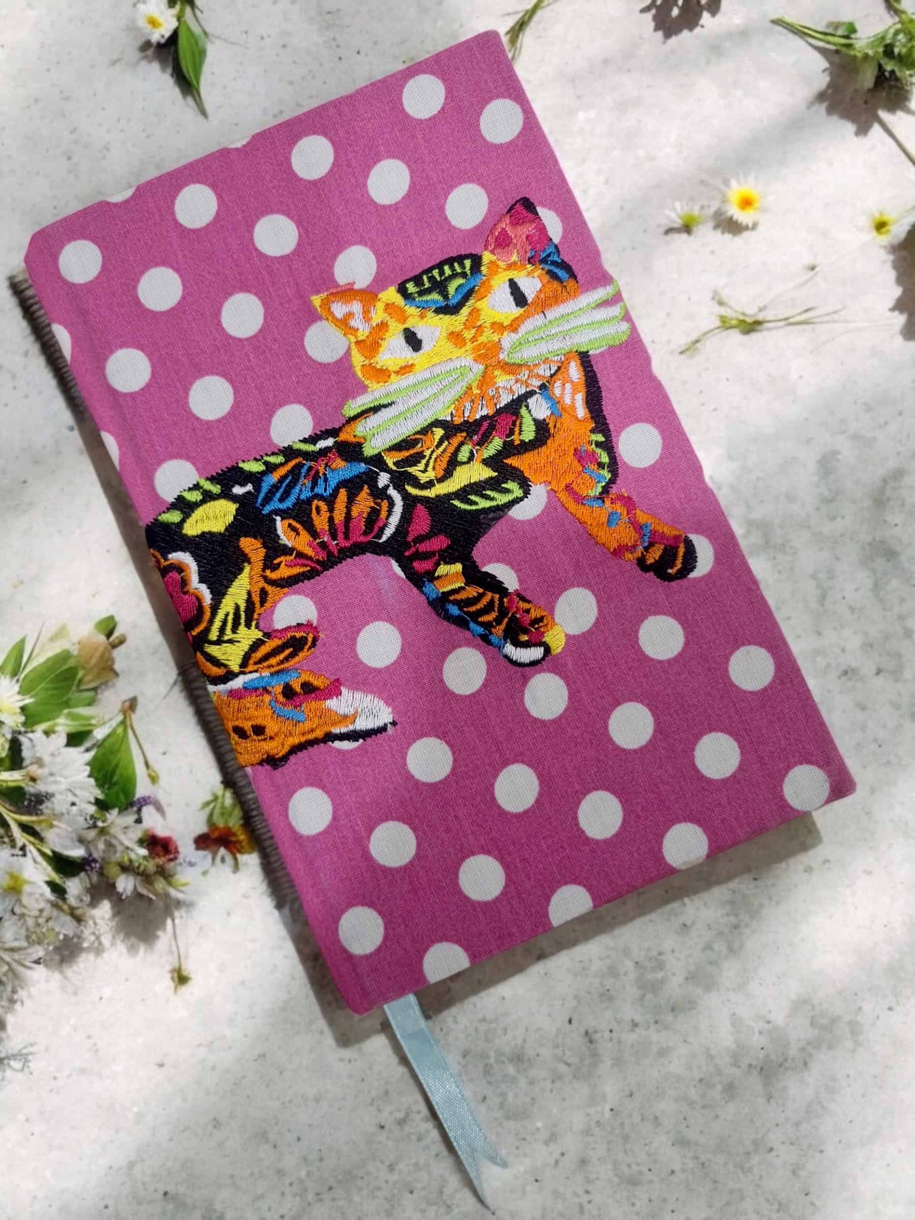 Libreta de autor bordada a partir de una ilustración, collage textil, encuadernación cosida a mano, cubierta dura, hojas de papel marfil de 83g. Pieza única.