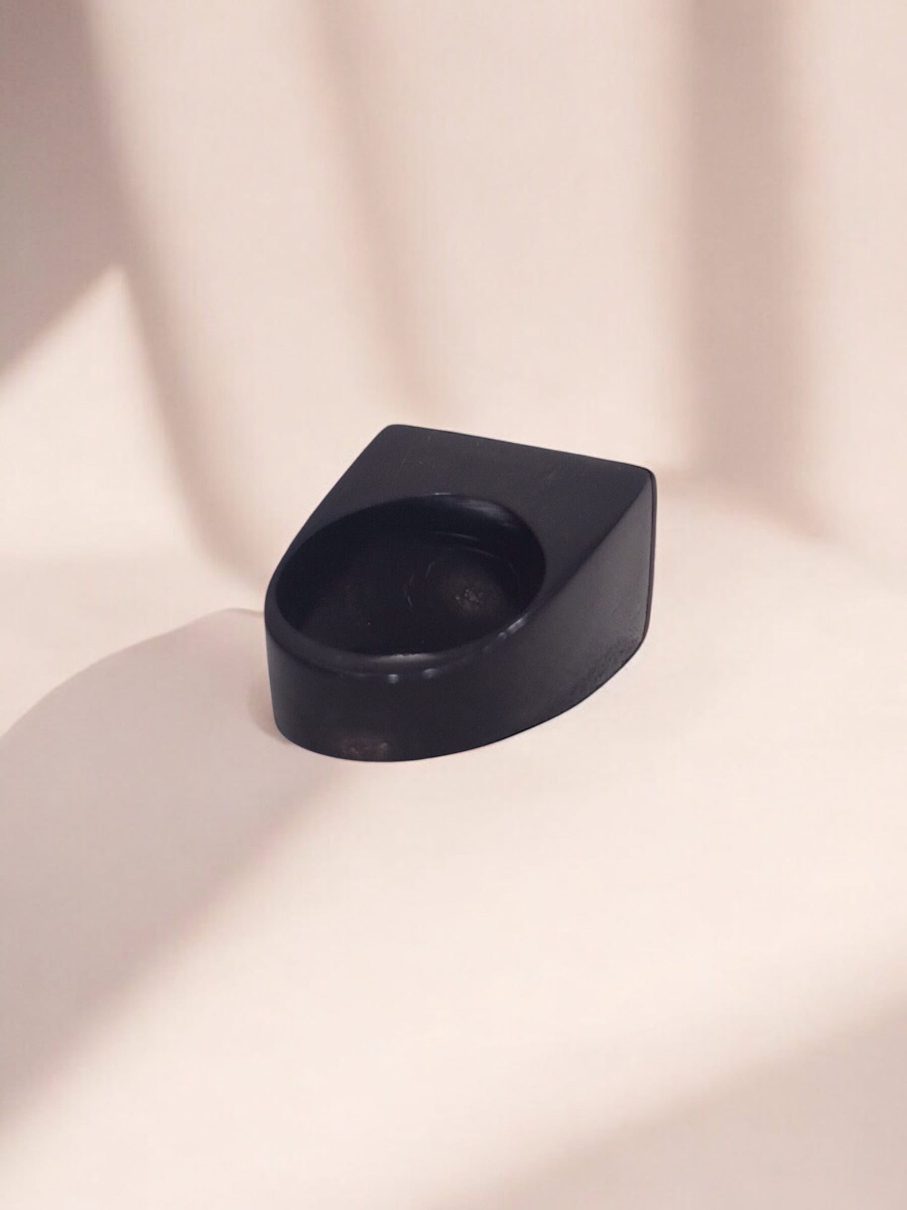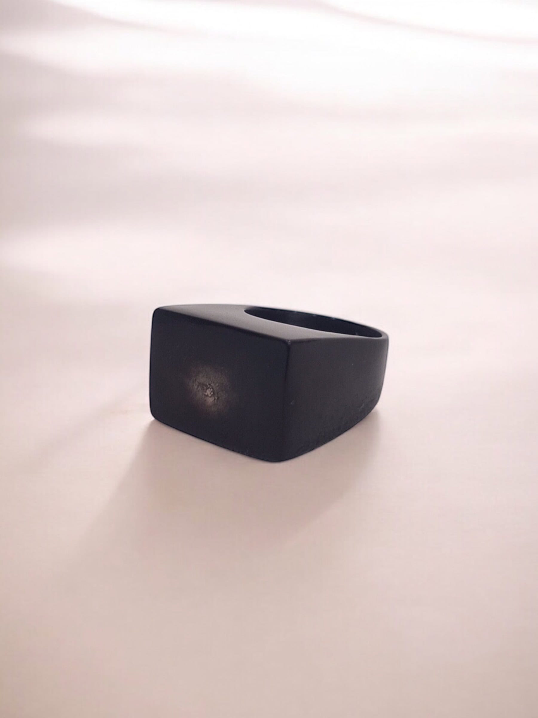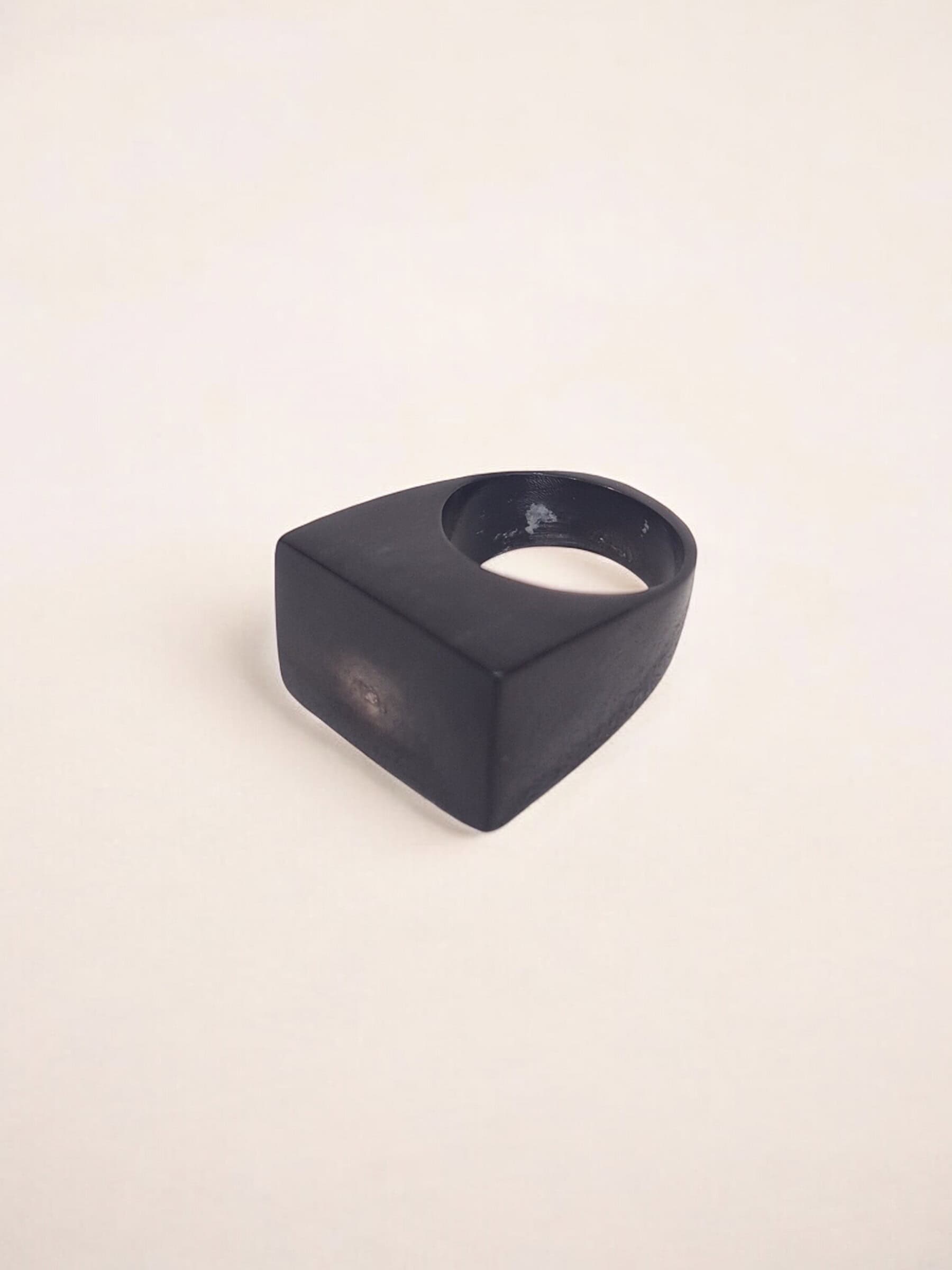 Anillo hecho a mano en cacho de toro reciclado. La belleza del material y el trabajo fino artesanal dan como resultado una pieza única y sostenible.