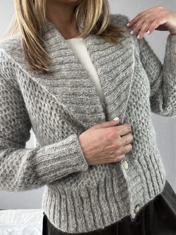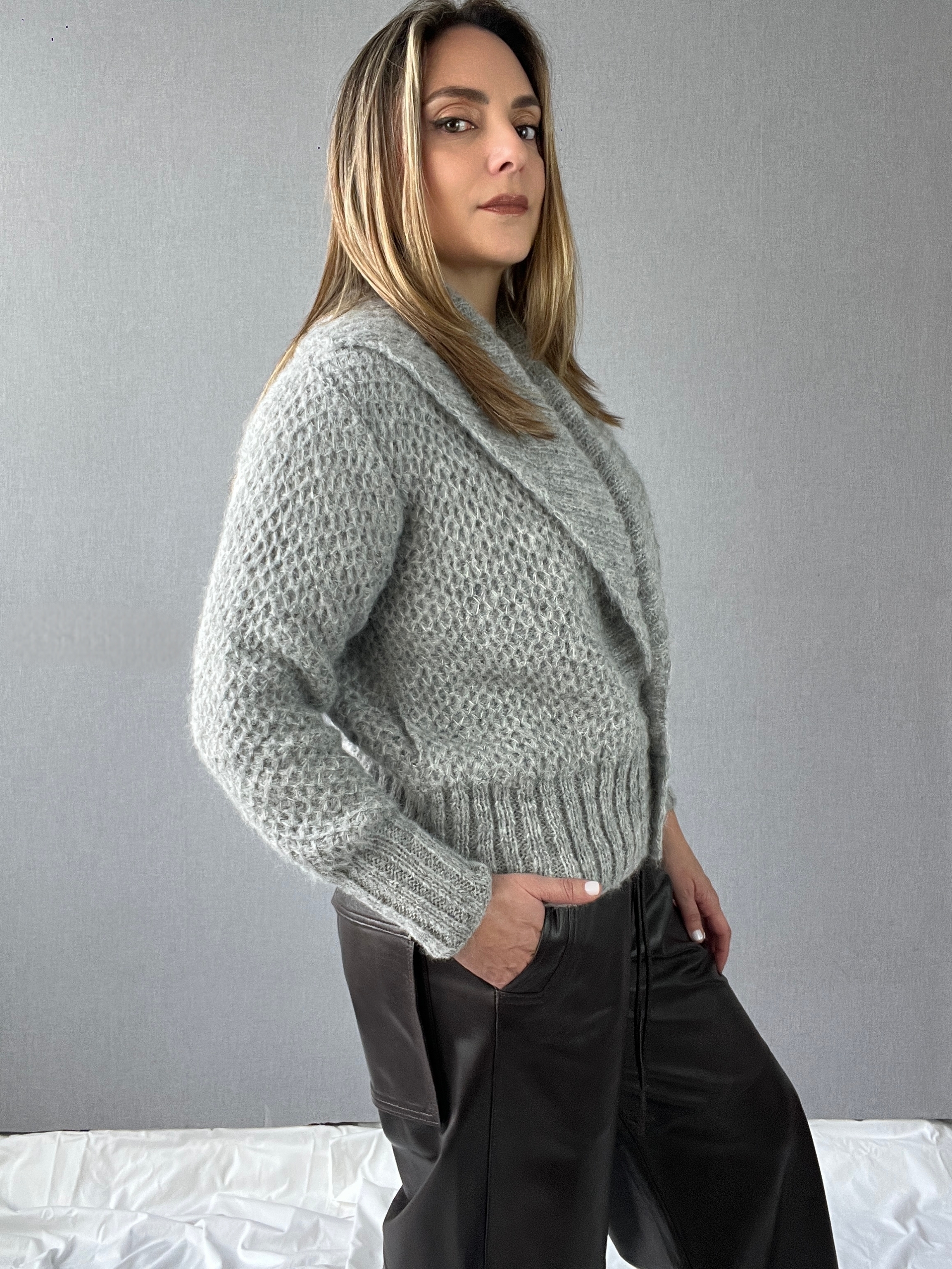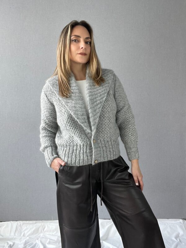 Cardigan de alpaca tejido a mano en máquina artesanal, tiene bolsillos ocultos en pura alpaca bebé, botones de coco y un cuello espectacular con el que puedes jugar.