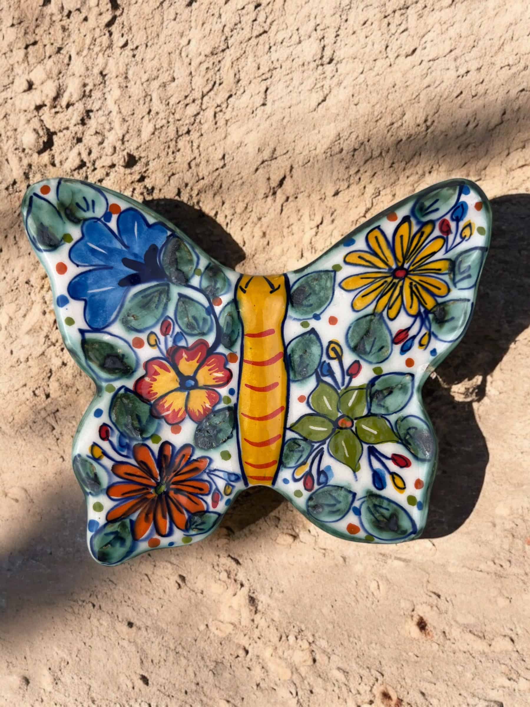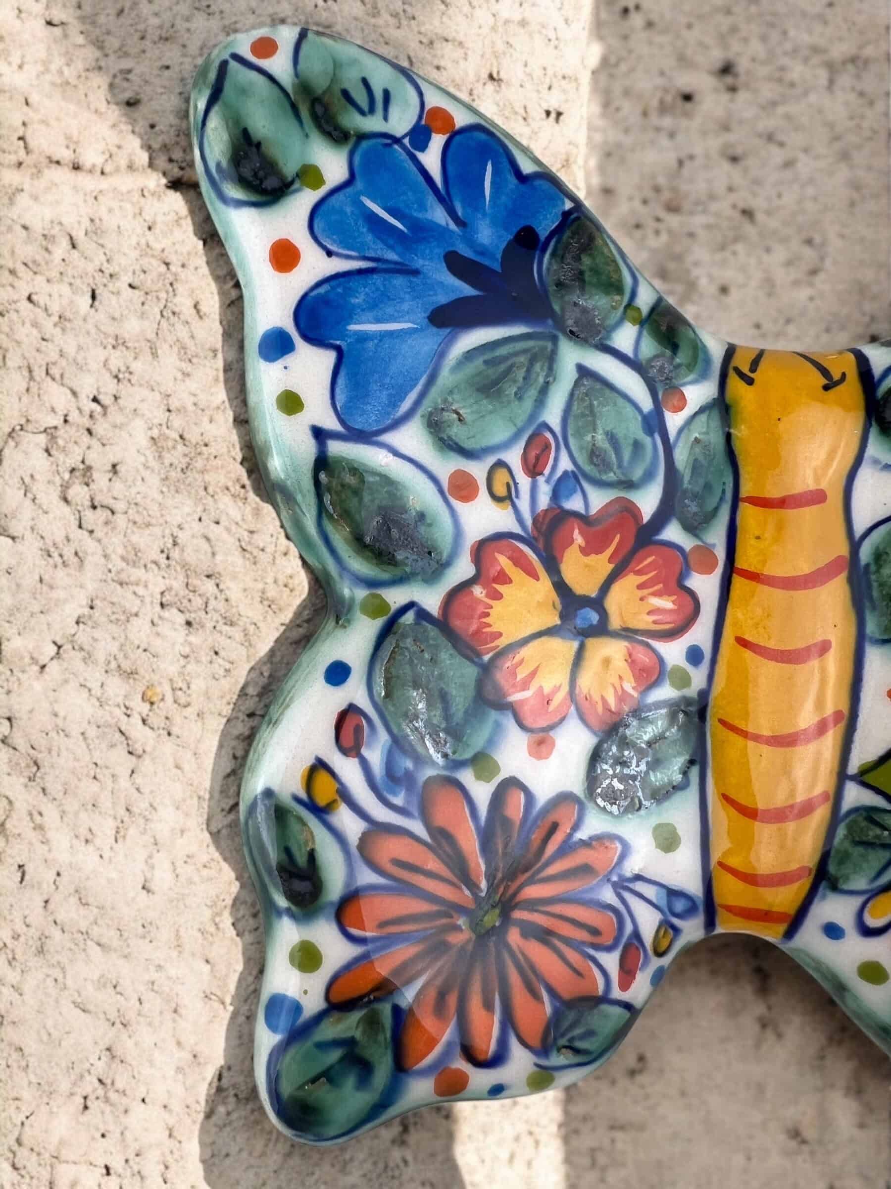 Mariposa colgante de cerámica hecha y pintada a mano por artesanos limeños. Cada pieza es única por su elaboración artesanal.