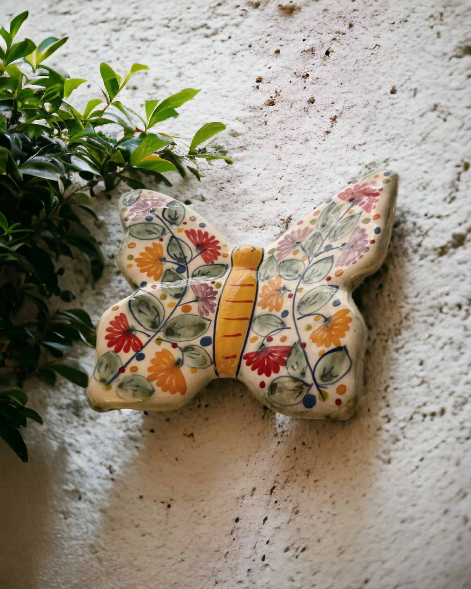 Mariposa colgante de cerámica hecha y pintada a mano por artesanos limeños. Cada pieza es única por su elaboración artesanal.