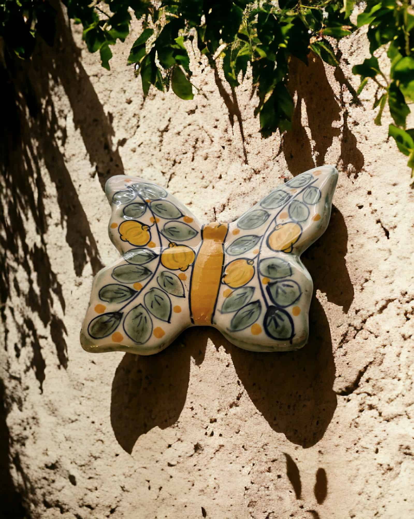 Mariposa colgante de cerámica hecha y pintada a mano por artesanos limeños. Cada pieza es única por su elaboración artesanal.