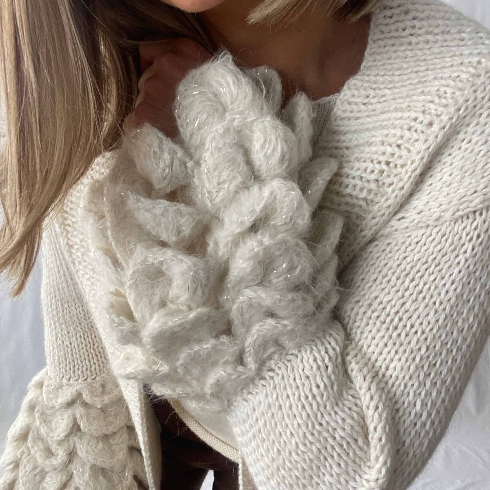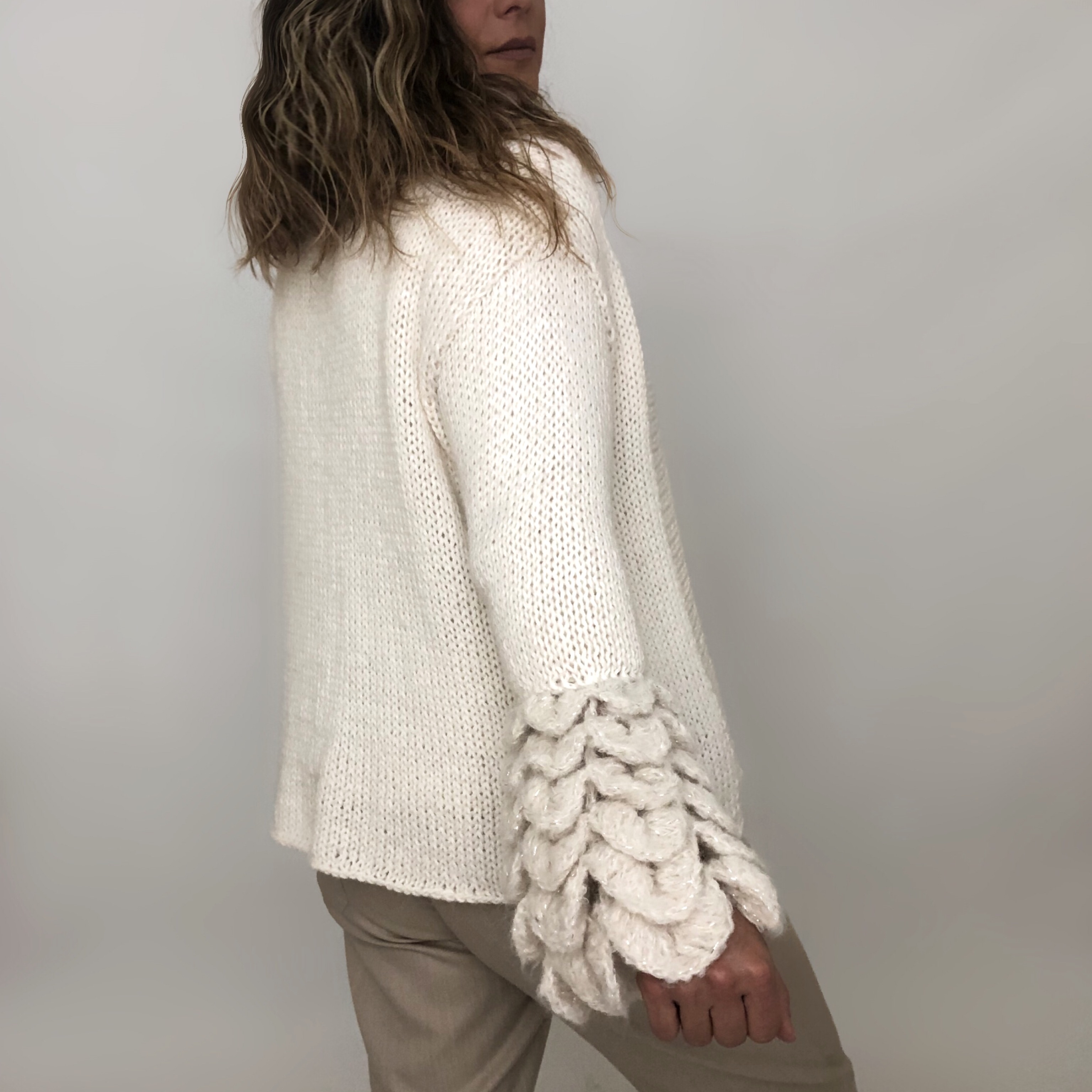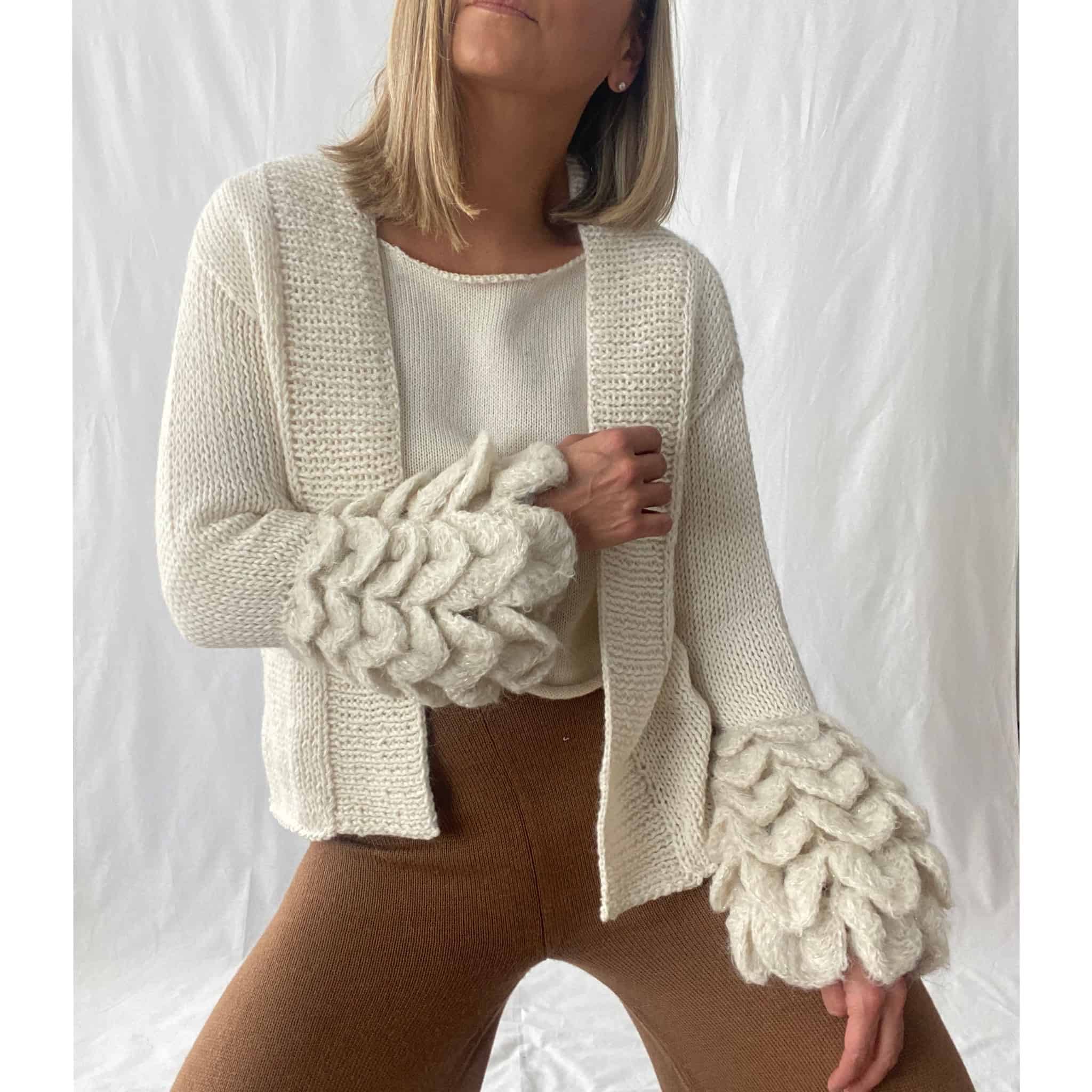 Cardigan con mangas de pétalos, de superfine alpaca, súper suave, hecha a mano por madres artesanas de Lima. Abrigador y con un diseño contemporáneo y chic.