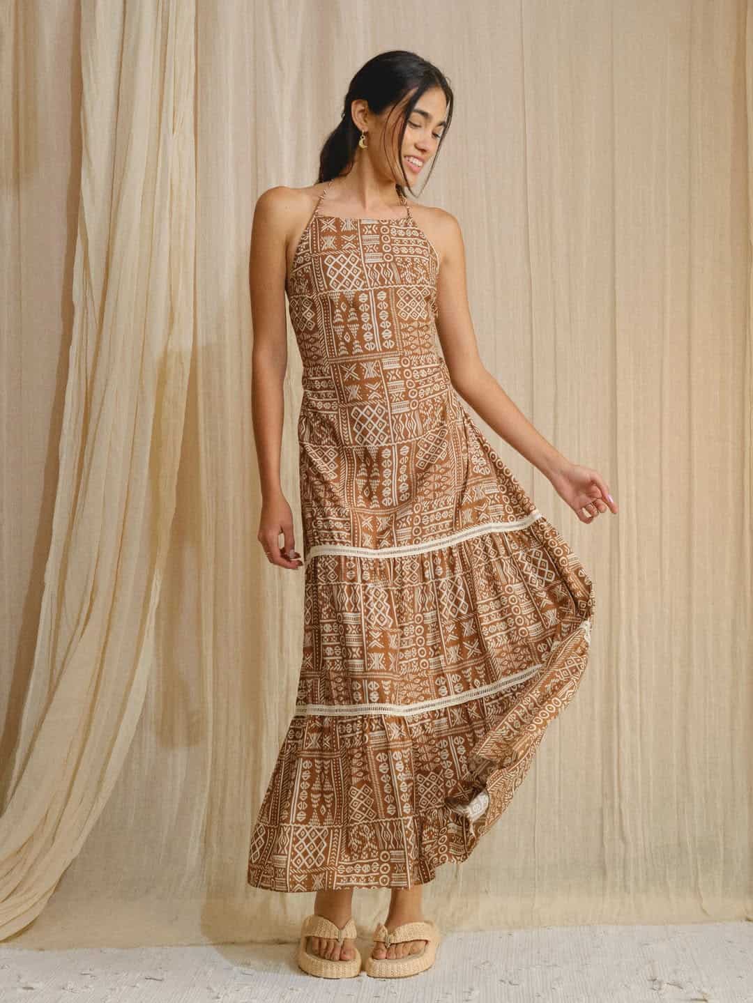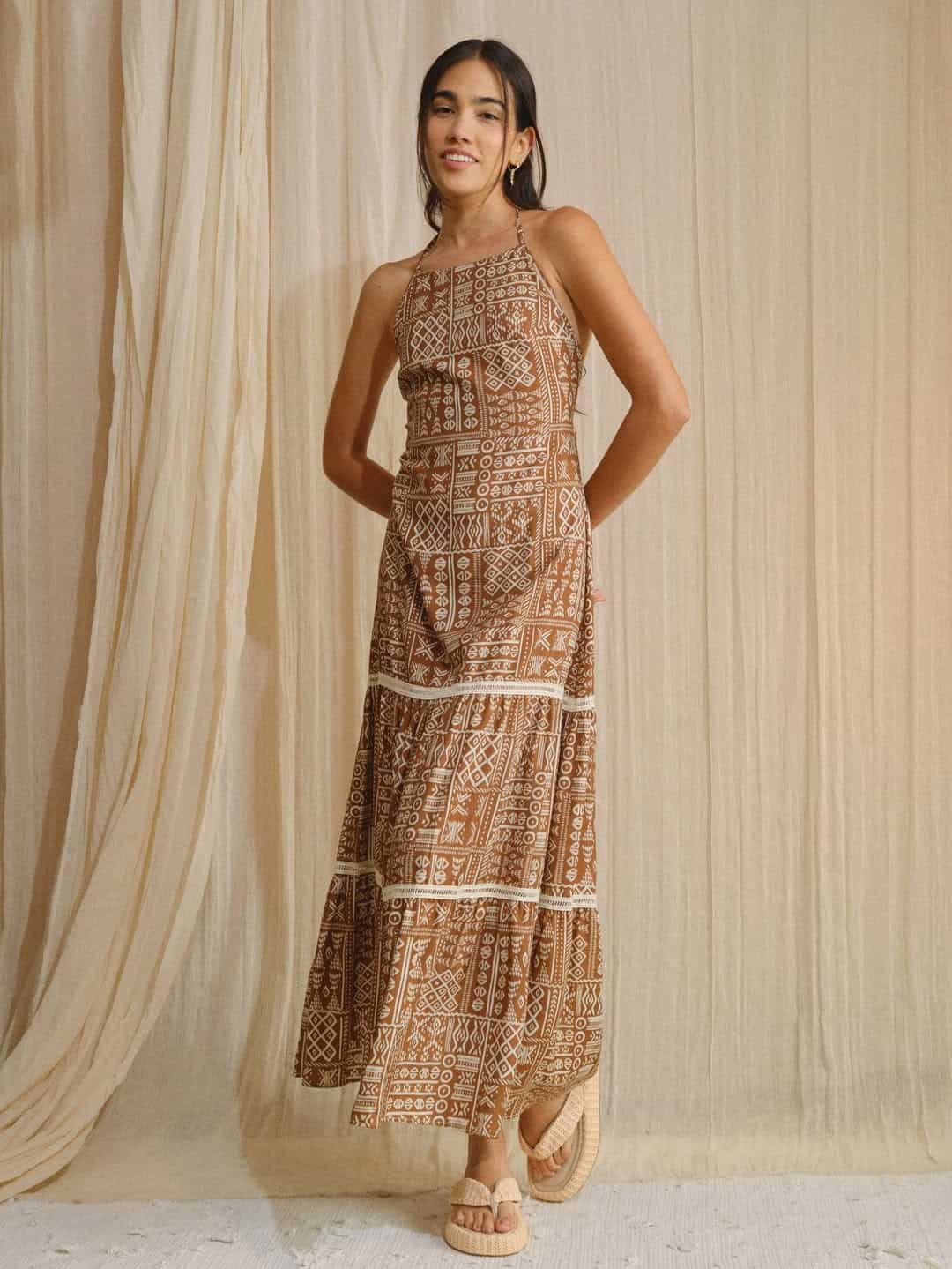Vestido largo de chalís con cuello halter ajustable, diseñado para la comodidad y la elegancia para un ajuste perfecto, detalle de amarre en el busto que acentúa la silueta y una espalda descubierta que agrega un toque de sofisticación. Ideal para el día a día.