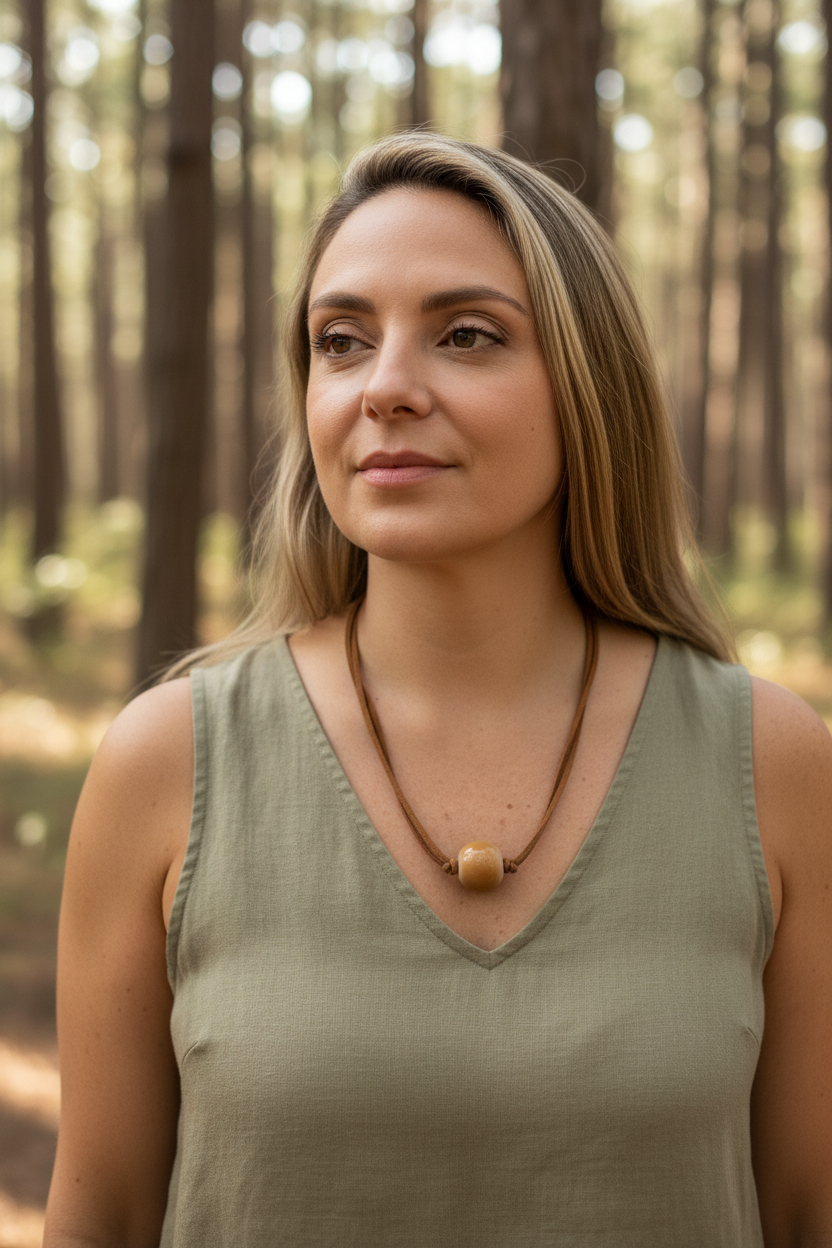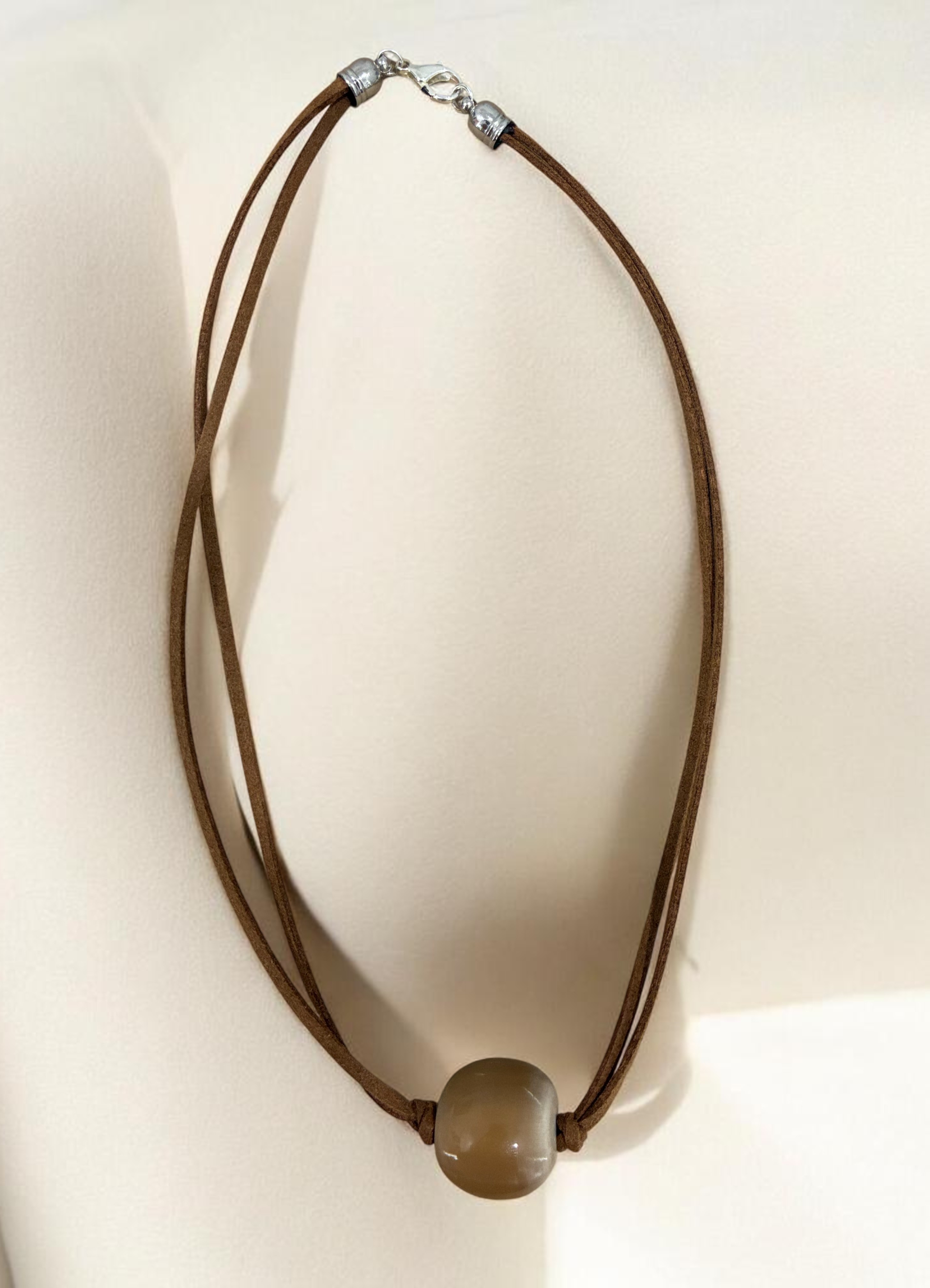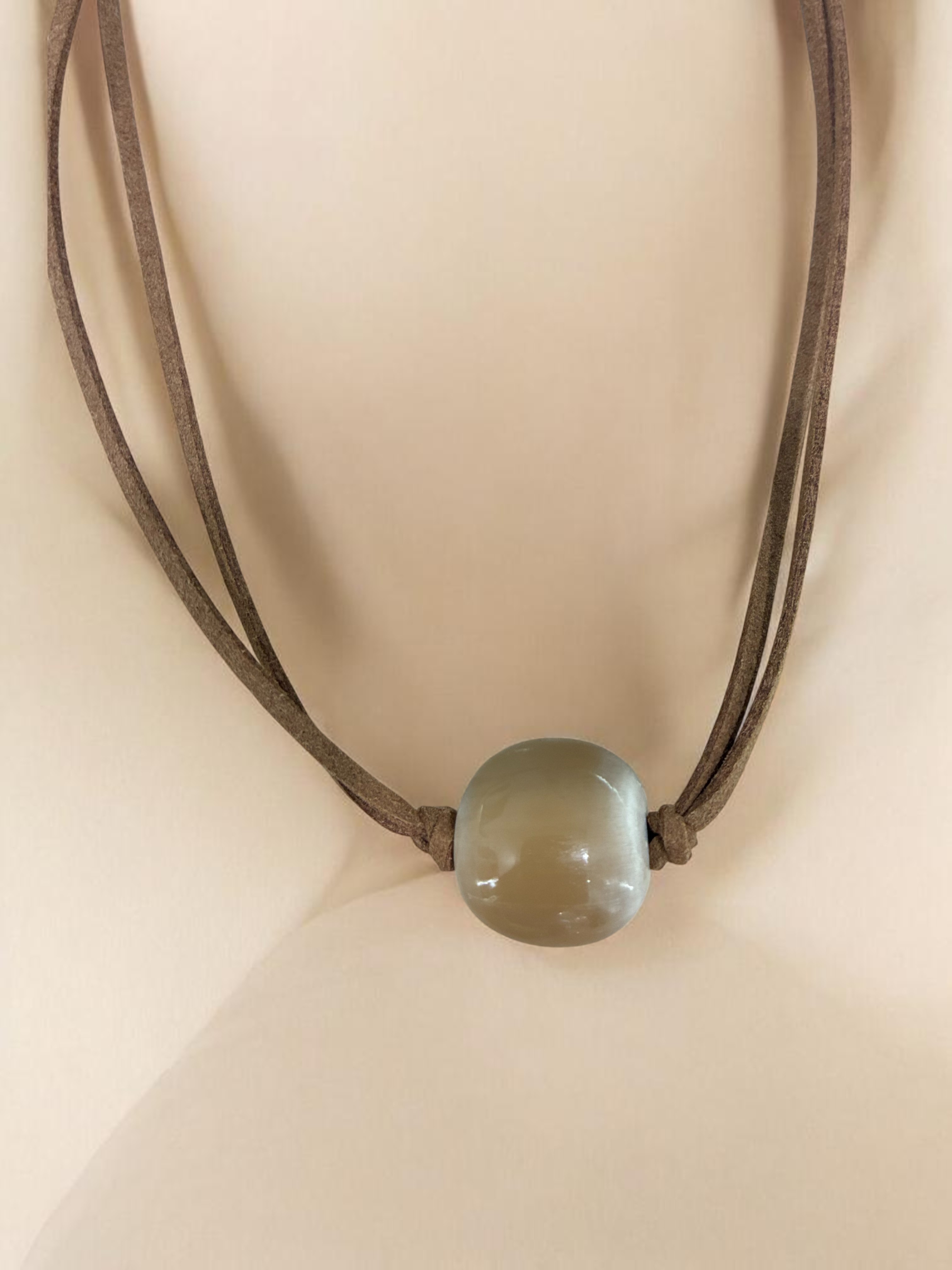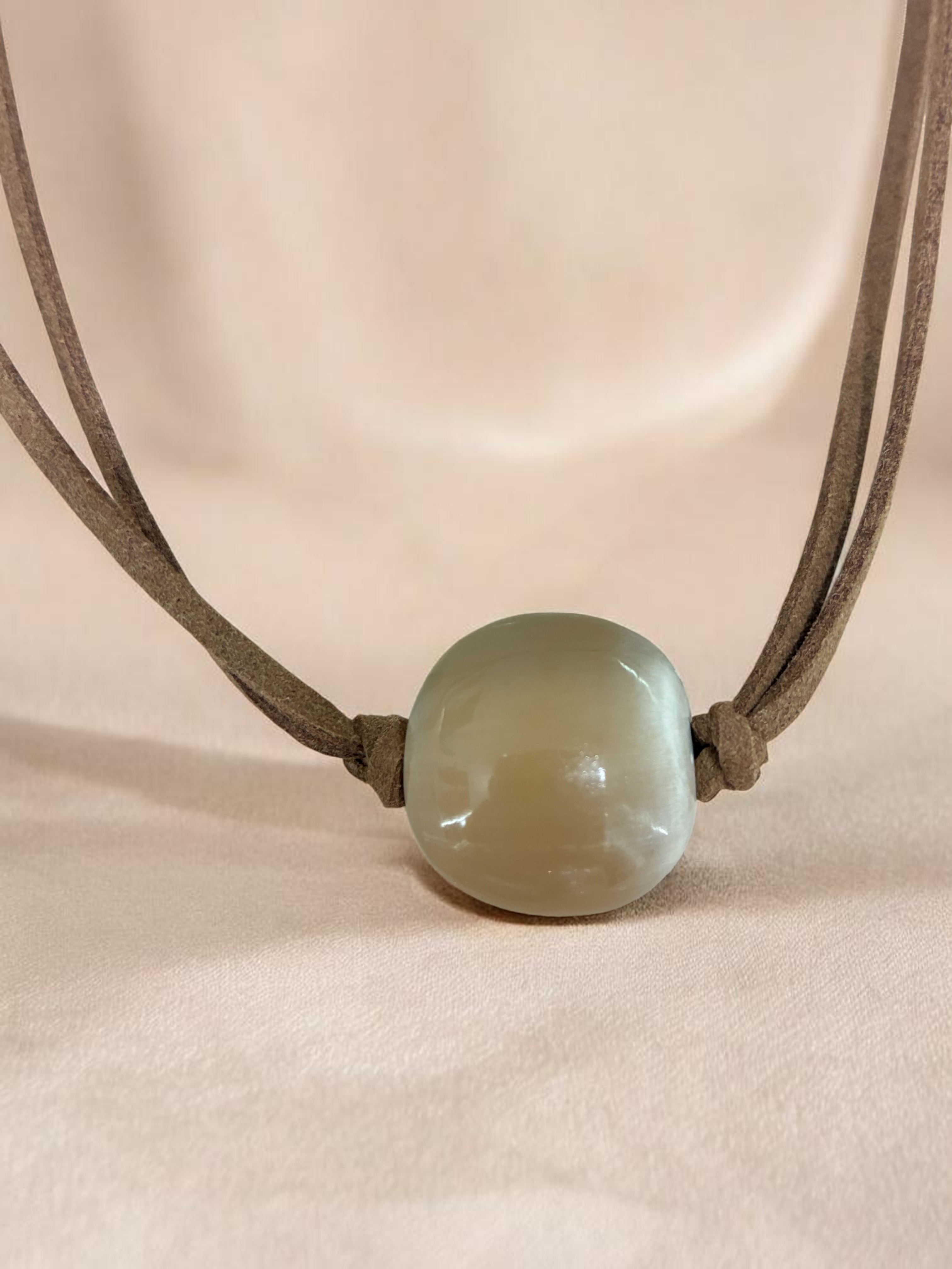 Collar largo hecho a mano en cacho de toro reciclado. La belleza del material y el trabajo fino artesanal dan como resultado una pieza única y sostenible.