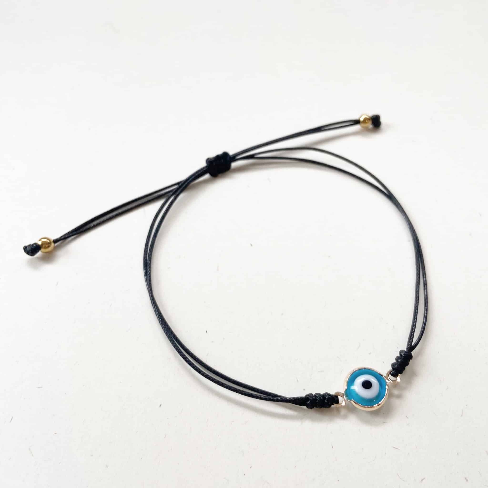 Pulsera de hilo y ojo turco, elemento de protección contra las malas energías, específicamente contra el “mal de ojo”.