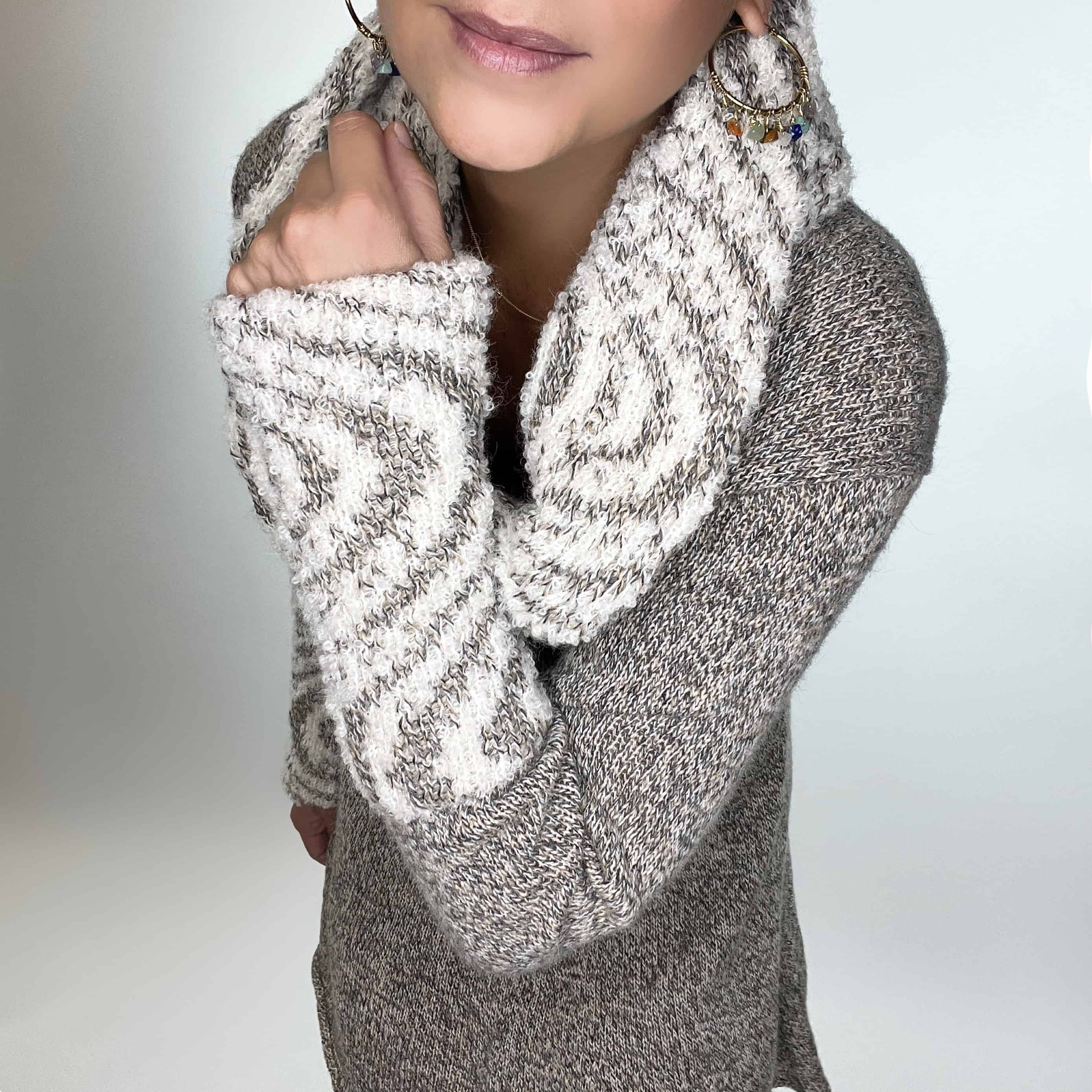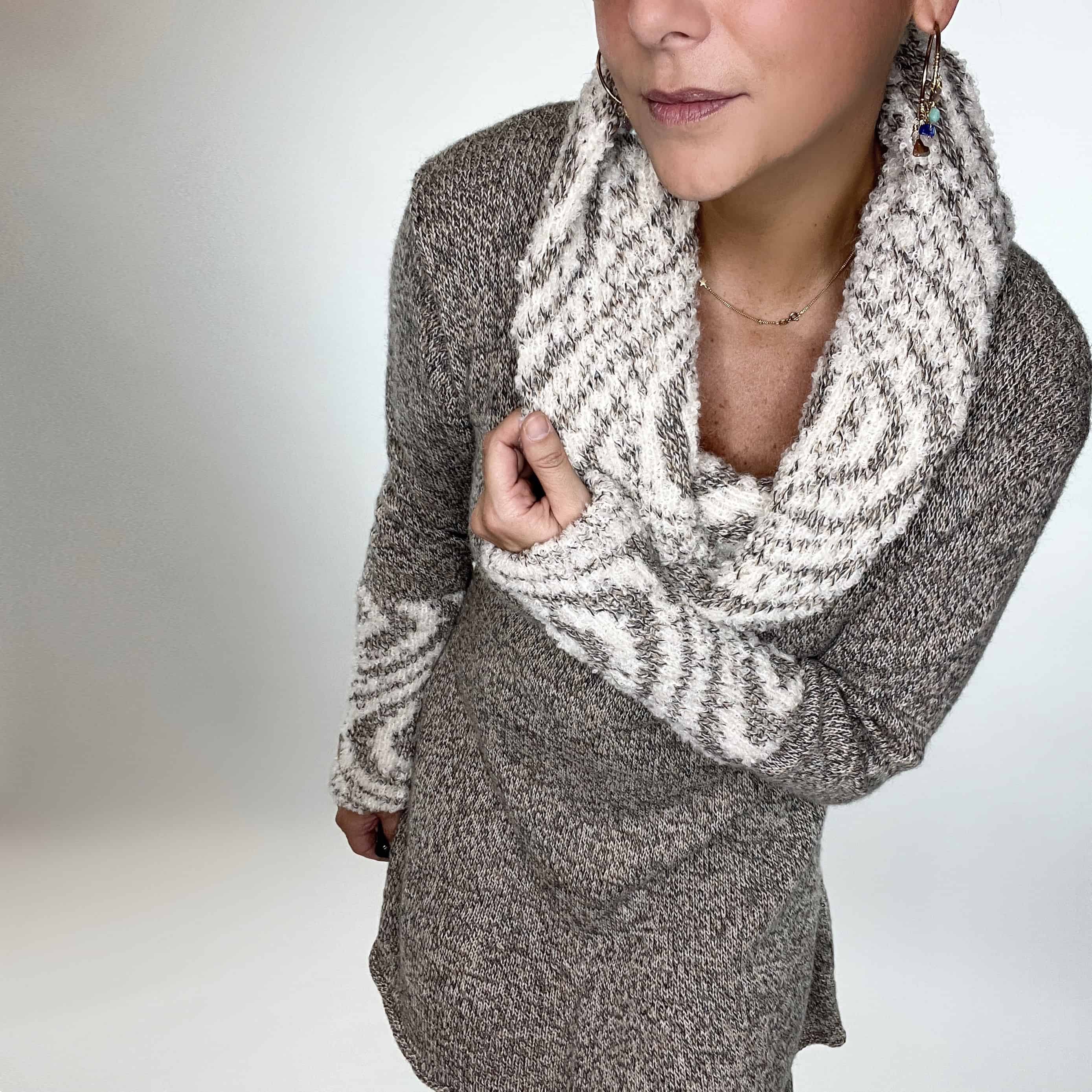 Vestido corto de 100% alpaca con cuello y puños tejidos con patrón en forma de olas. Hecho por artesanos peruanos.